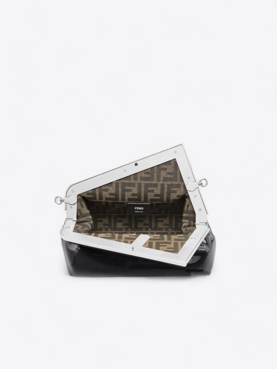 Die Fendi First Tasche ist darauf ausgelegt, jeden Ihrer Momente stilvoll und effizient zu begleiten. Ihre perfekte Größe für den täglichen Gebrauch und ihre Vielseitigkeit, entweder als elegante Clutch in der Hand oder lässig über die Schulter getragen, machen sie zu einer vielseitigen Wahl. Das Innere ist geschickt mit einem Stoff ausgekleidet, der mit dem ikonischen FF-Muster verziert ist, ausgestattet mit abnehmbaren internen Haken und abgerundet durch palladiumfarbene Metalldetails, die eine Note von Verfeinerung hinzufügen.