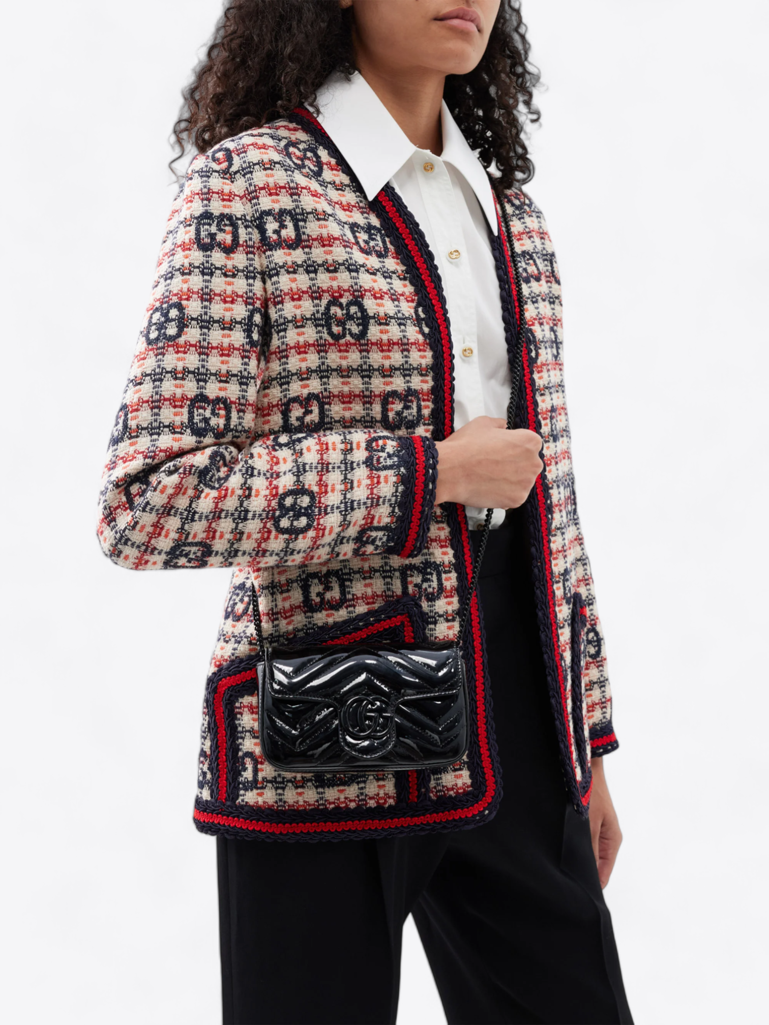 Entdecken Sie die glänzende schwarze Marmont-Tasche von Gucci, ein außergewöhnliches Stück, das Ihrem Outfit einen unvergleichlichen Hauch von Luxus verleiht. Hergestellt in Italien aus hochwertigem Lackleder, verkörpert diese Tasche Eleganz und Raffinesse. Ihr anspruchsvolles Design präsentiert ein Ton-in-Ton-Gucci-Logo dezent auf der Vorderklappe, das ihren zeitlosen Reiz unterstreicht.