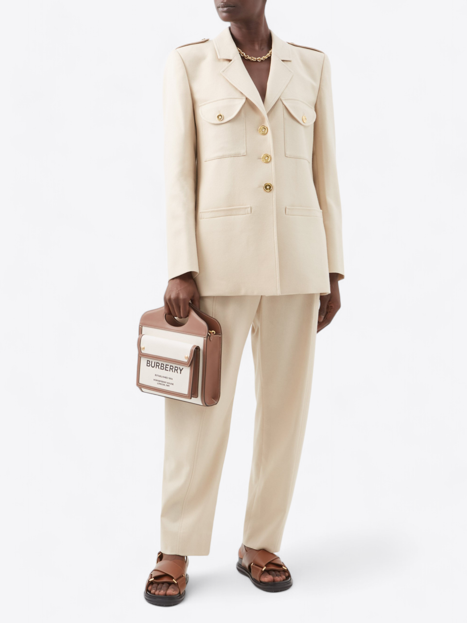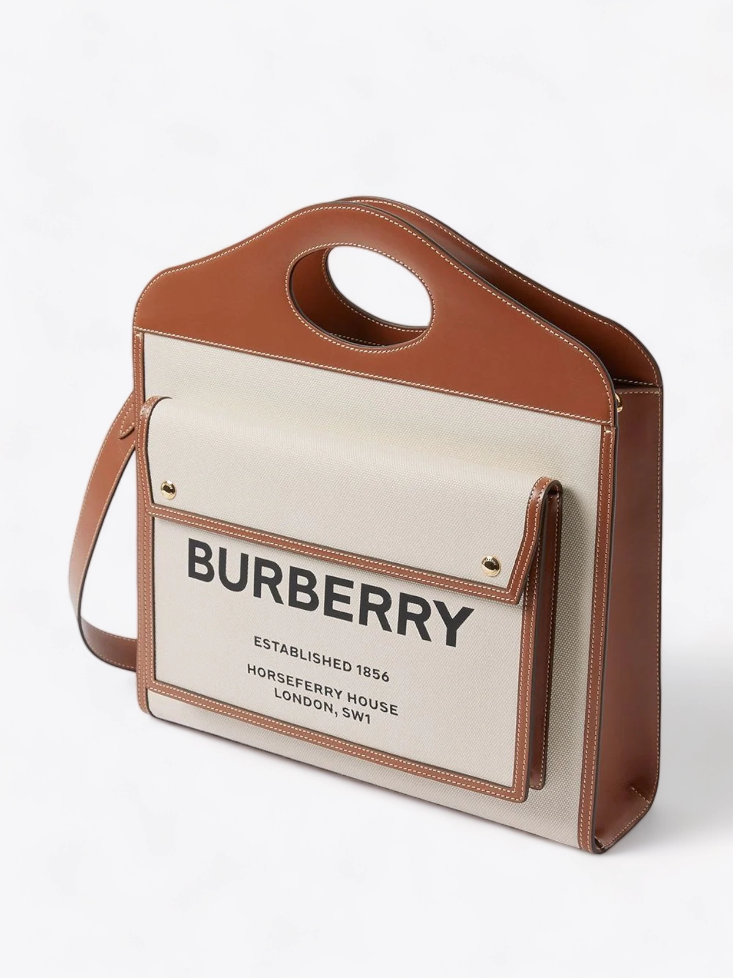 Die Tasche zeichnet sich durch ihre Vordertasche aus, die stolz das Gründungsjahr von Burberry, 1856, sowie die Adresse ihres ikonischen Hauptsitzes, Horseferry House in London, in einem Vintage-Typografie zeigt. Diese Tasche ist nicht nur eine Hommage an das Erbe der Marke, sondern auch ein praktischer Stauraum für Ihre Essentials.