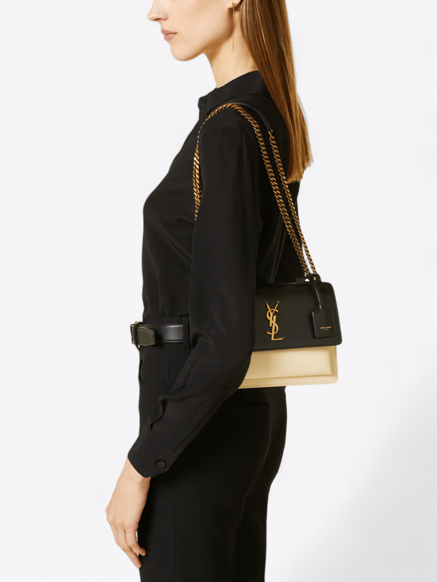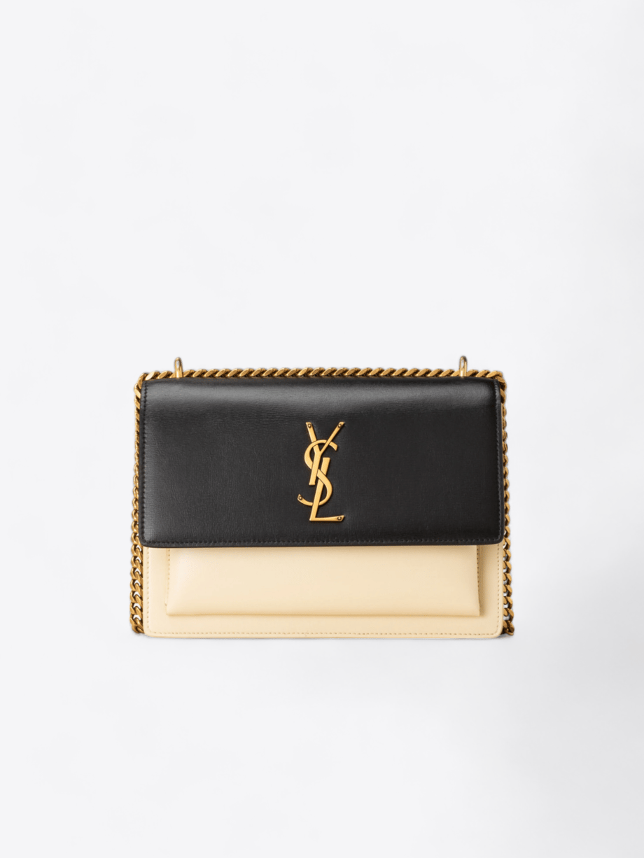 Die klassische Silhouette der Medium Sunset wird durch gealterte goldene Beschläge veredelt, einschließlich der eleganten Kette und des ikonischen YSL-Monogramms, das stolz den vorderen Klappverschluss ziert. Die großzügigen Abmessungen dieser Tasche (21 cm Höhe, 28 cm Breite und 8 cm Tiefe) machen sie nicht nur praktisch für den täglichen Bedarf, sondern auch perfekt für einen Abend oder ein besonderes Ereignis.