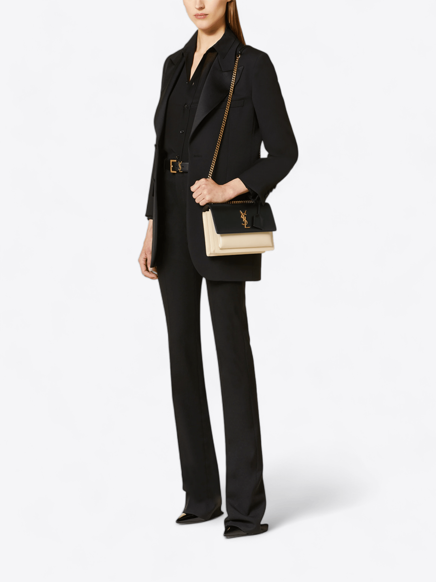 Entdecken Sie zeitlose Eleganz mit der Medium Sunset Monogram Umhängetasche von Saint Laurent, jetzt exklusiv bei welPop zur Miete erhältlich. Diese Tasche, ein Symbol für Luxus und Raffinesse, ist aus glattem Kalbsleder mit makellosem Finish gefertigt und bietet eine reiche Textur, die zum Anfassen einlädt. Die tiefschwarze Farbe, kombiniert mit Cremeakzenten, schafft einen auffälligen Kontrast, der das strukturierte Design der Tasche hervorhebt.