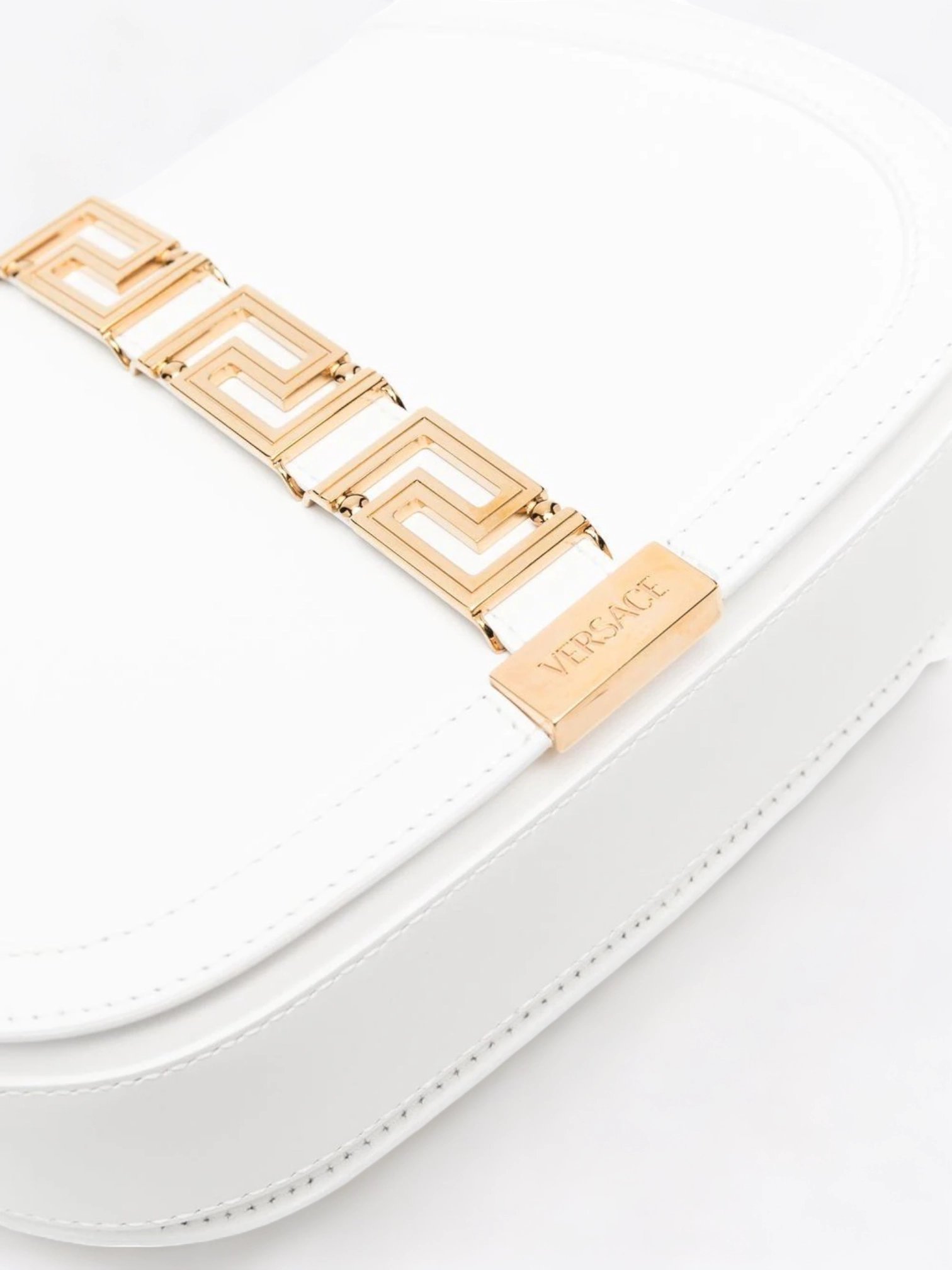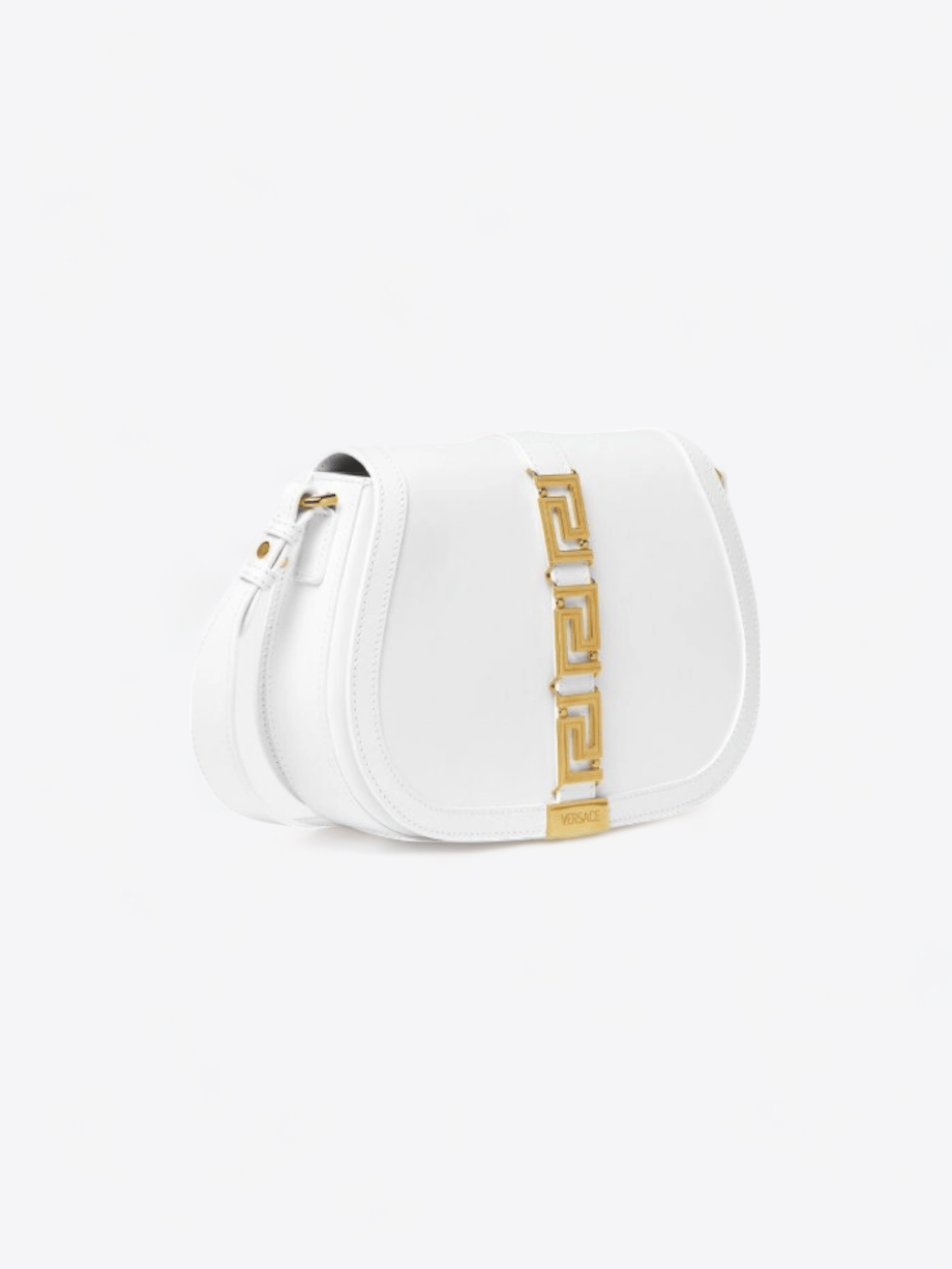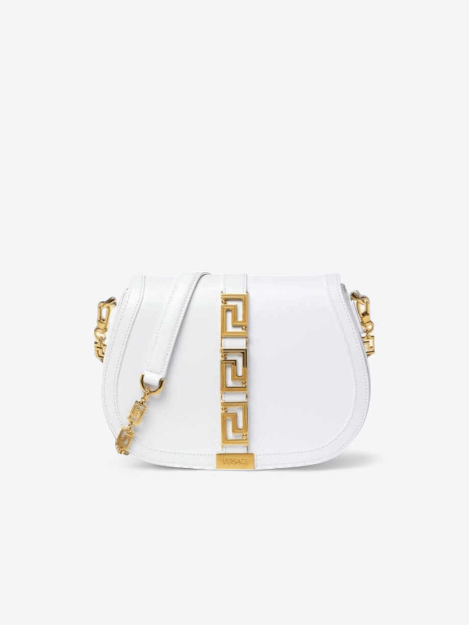 Entdecken Sie zeitlose Eleganz mit der Greca-Tasche von Versace, einem Herzstück der Resort 2022 Kollektion. Diese Tasche aus glattem weißen Leder ist ein wahres Meisterwerk, das Raffinesse und Funktionalität mit zeitgenössischer Kühnheit vereint. Ihre glatte Ledertextur bietet ein weiches und luxuriöses Gefühl, das die Reinheit und den Glanz ihrer makellosen weißen Farbe betont.