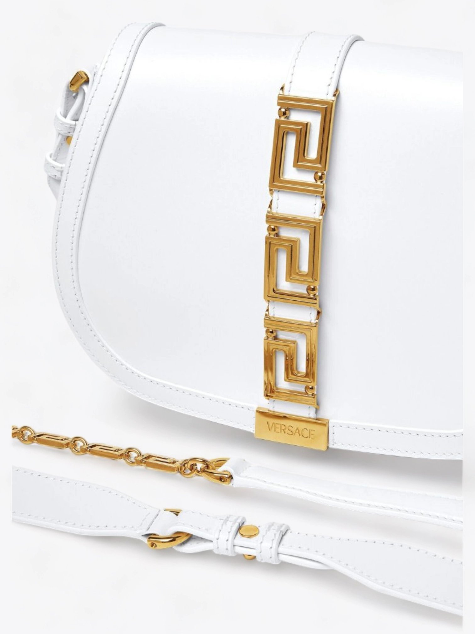 Die Tasche ist so konzipiert, dass sie sich Ihren Wünschen anpasst und sowohl als Umhängetasche für einen lässigen, urbanen Look als auch in der Hand für einen formelleren und eleganteren Auftritt getragen werden kann. Der Schulterriemen, verziert mit dem goldenen griechischen Muster, verleiht eine luxuriöse und unverwechselbare Note, während der obere Griff für einen komfortablen und eleganten Halt sorgt.