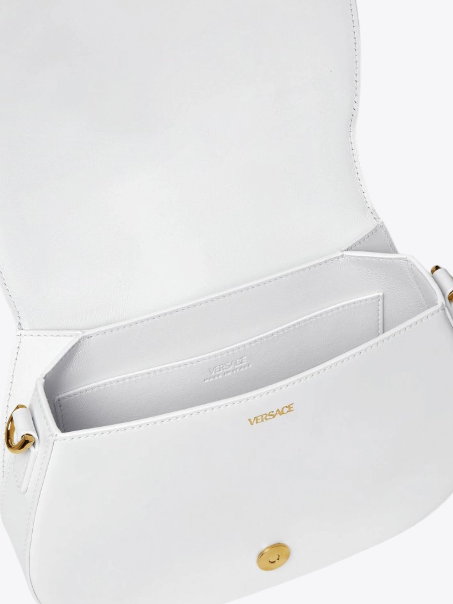 Die runde Form der Greca-Tasche zeichnet sich durch ihre Originalität und avantgardistische Ausstrahlung aus und bildet einen harmonischen Kontrast zu den geradlinigen goldenen Metall-Greca-Mustern auf der Vorderseite der Tasche und dem Schulterriemen. Dieses polierte goldene Detail verleiht einen Hauch von Glamour und Prestige und erinnert an das künstlerische Erbe des Hauses Versace, während es gleichzeitig eine schicke und coole Modernität verkörpert.