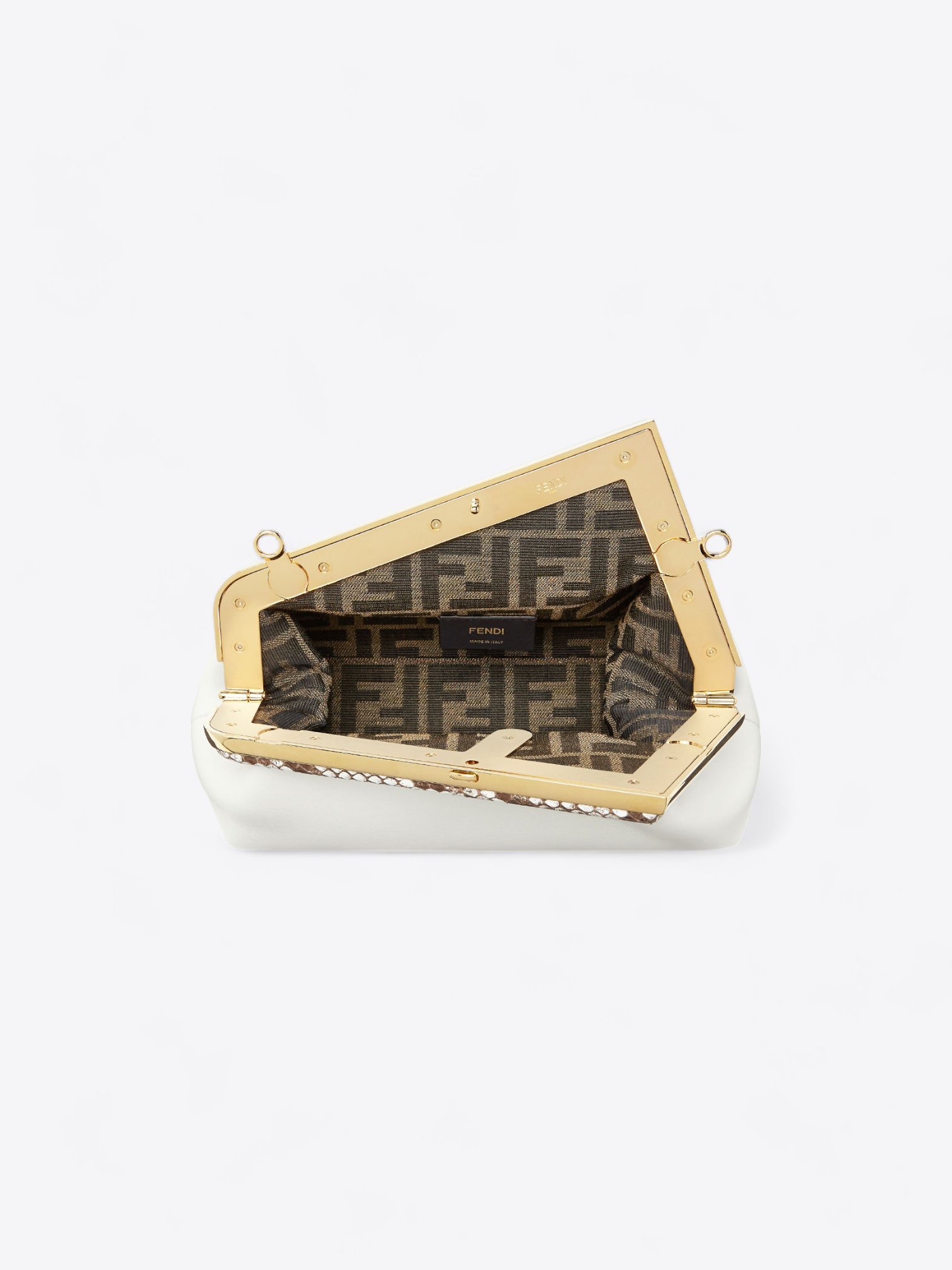 Für ein stimmiges Aussehen kombinieren Sie diese Fendi First Tasche mit einem klassischen kleinen schwarzen Kleid, Lacklederpumps und dezentem Schmuck für einen Cocktailabend. Für einen Tageslook tragen Sie sie zu einem fließenden Hosenanzug und Ballerinas für eine elegante Note im Büro. Diese Tasche eignet sich auch ideal für Veranstaltungen wie Hochzeiten oder Galas, wo ihre natürliche Eleganz eine festliche Garderobe perfekt ergänzt.