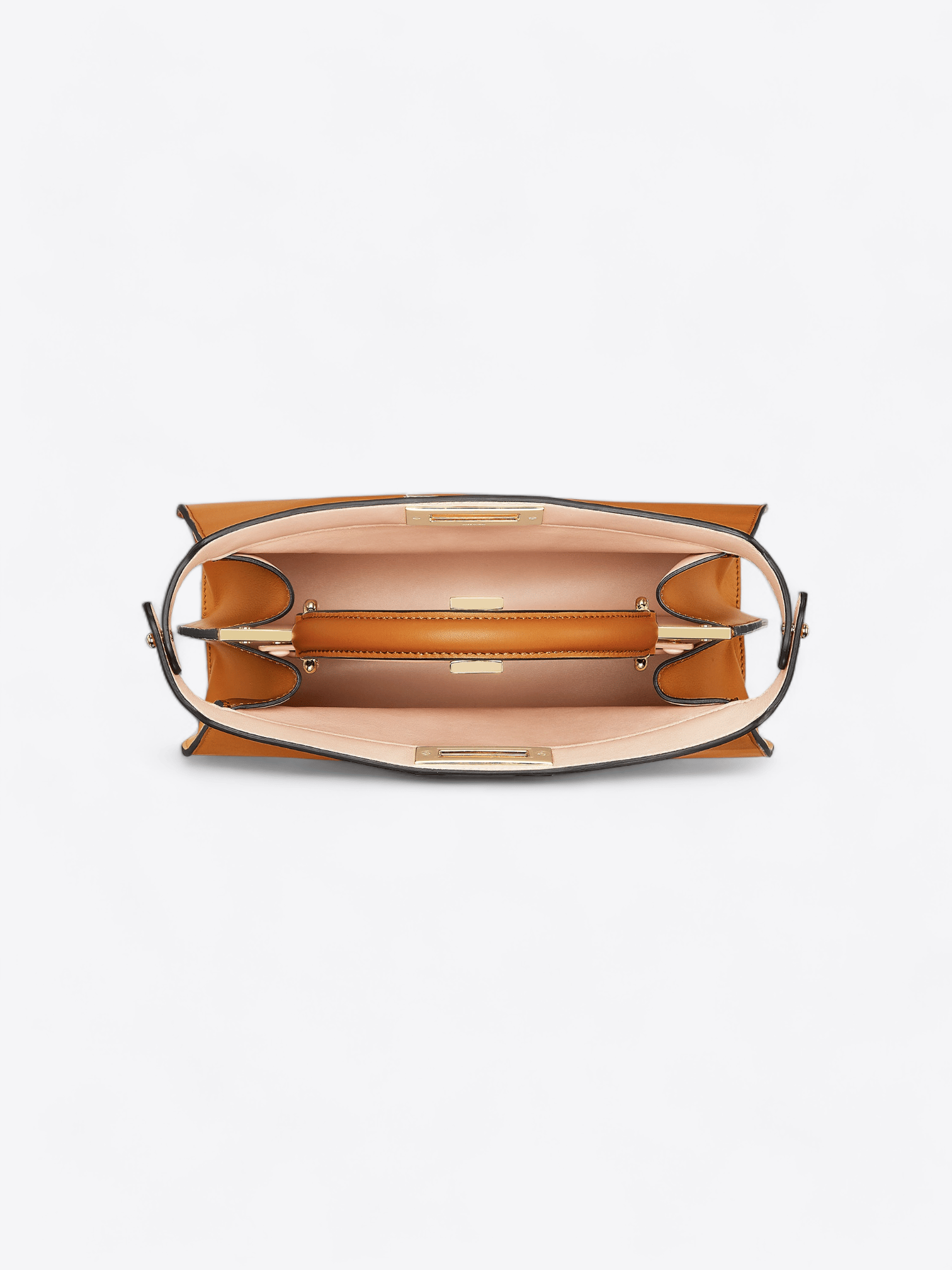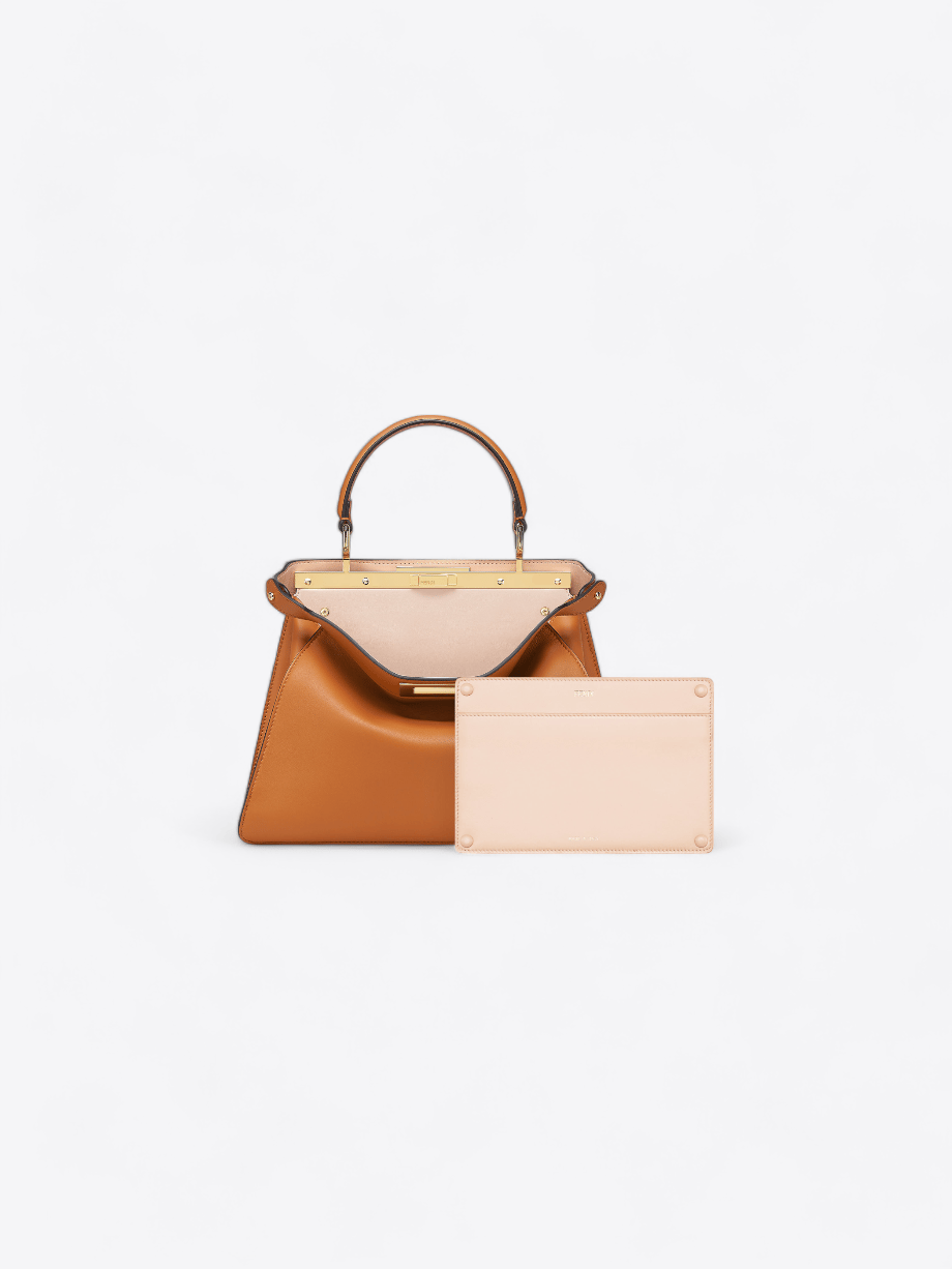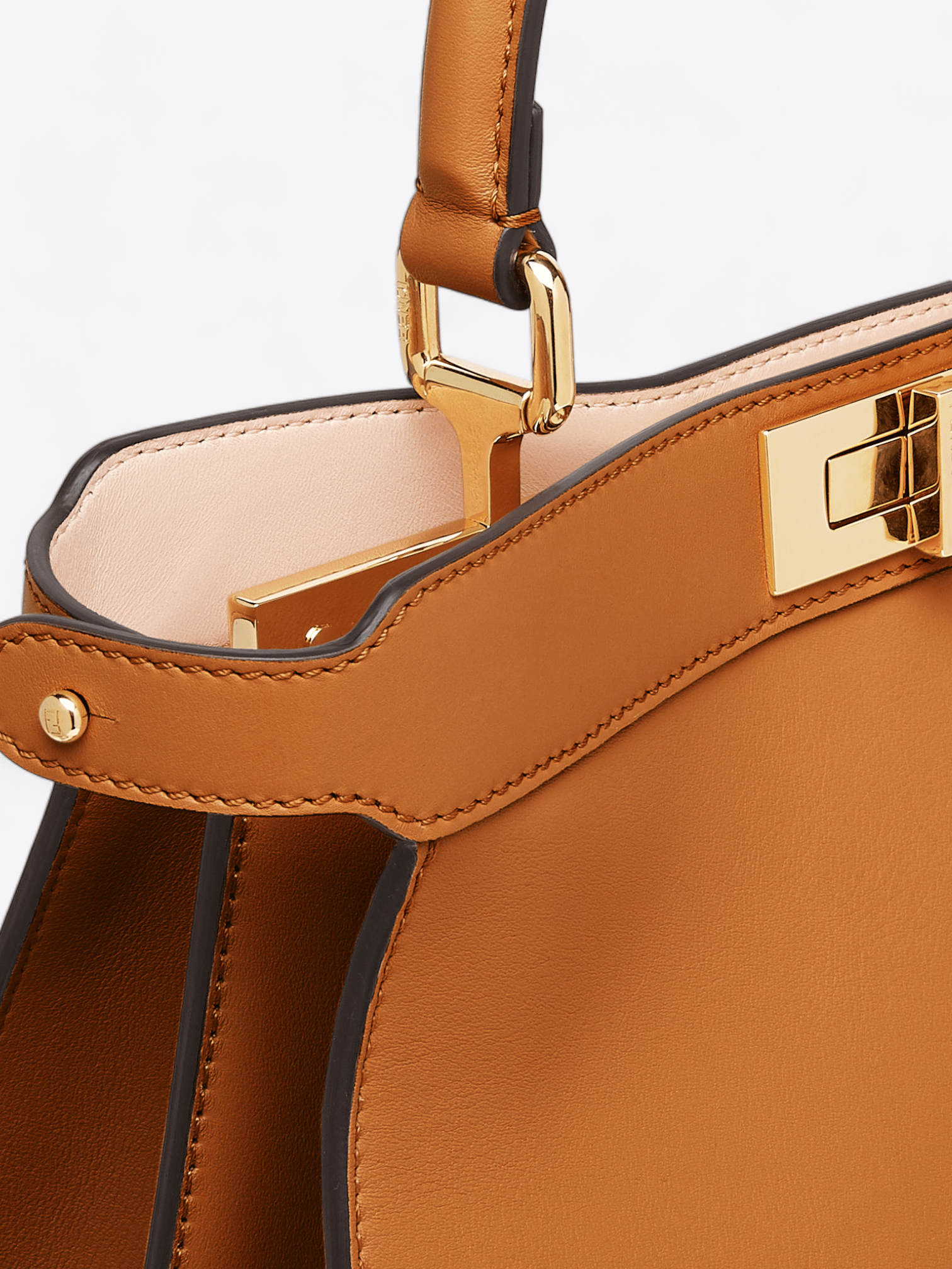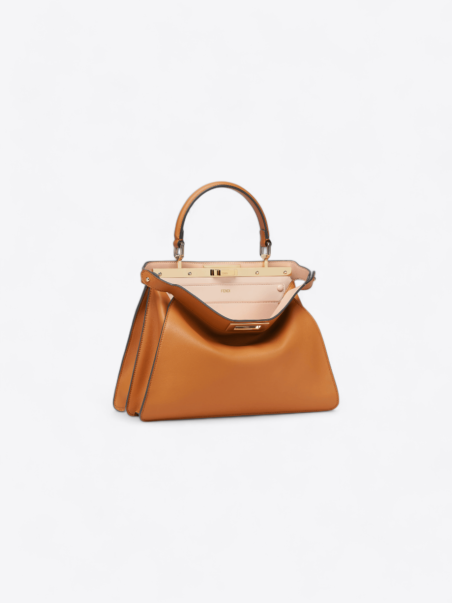 Die Peekaboo ISeeU Medium Tasche zeichnet sich durch ihre strukturierte Silhouette und ihre klaren Linien aus, umhüllt von prachtvollem braunem Leder, das Wärme und Reichtum ausstrahlt. Jede Seite der Tasche wird durch den ikonischen goldenen Drehverschluss von Fendi veredelt, ein Symbol für die außergewöhnliche Handwerkskunst von Fendi. Diese Verschlüsse sind nicht nur funktional, sondern dienen auch als funkelnde Juwelen, die das Licht und bewundernde Blicke einfangen.