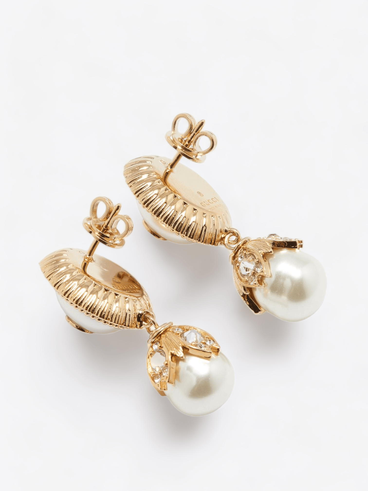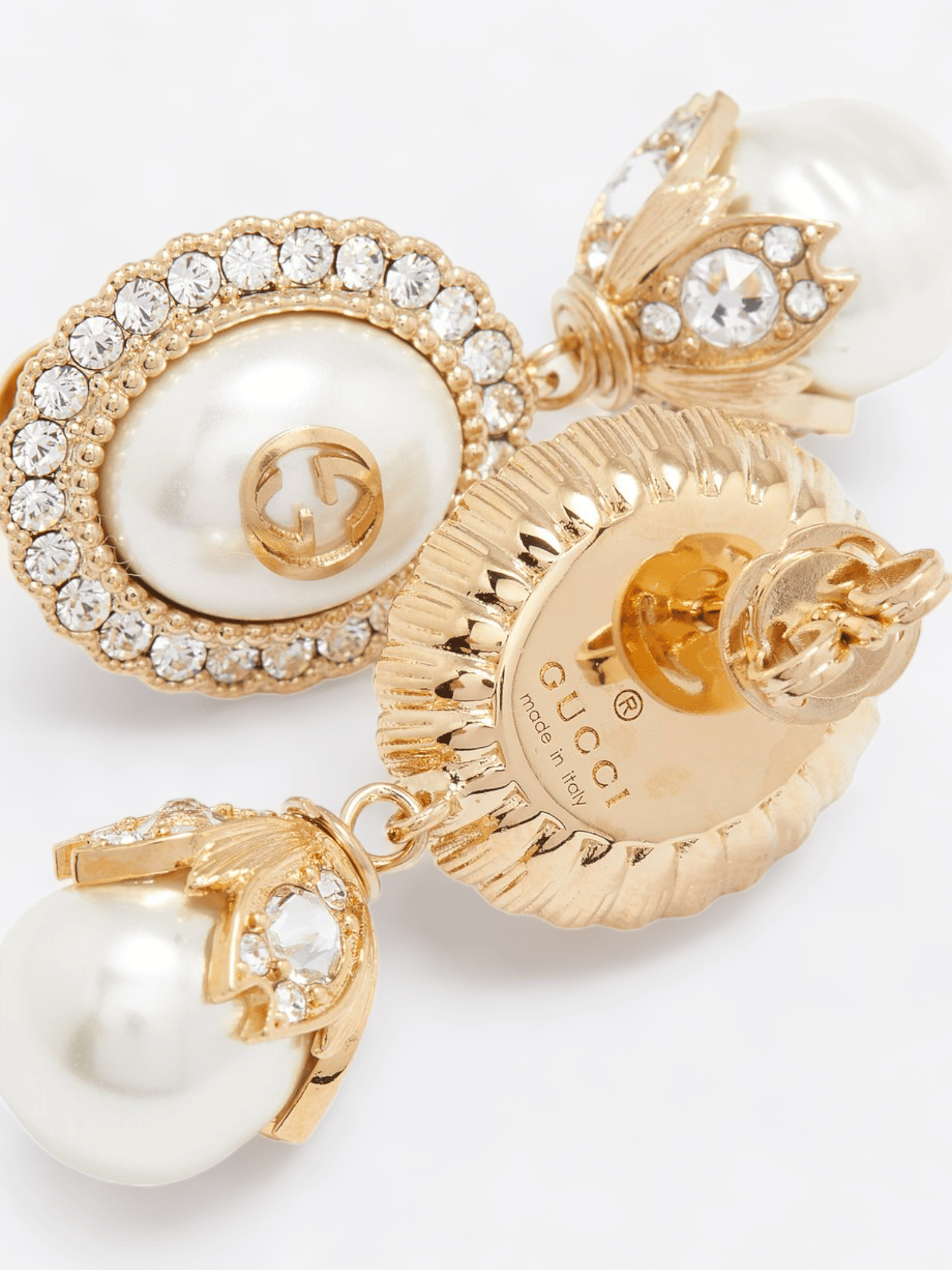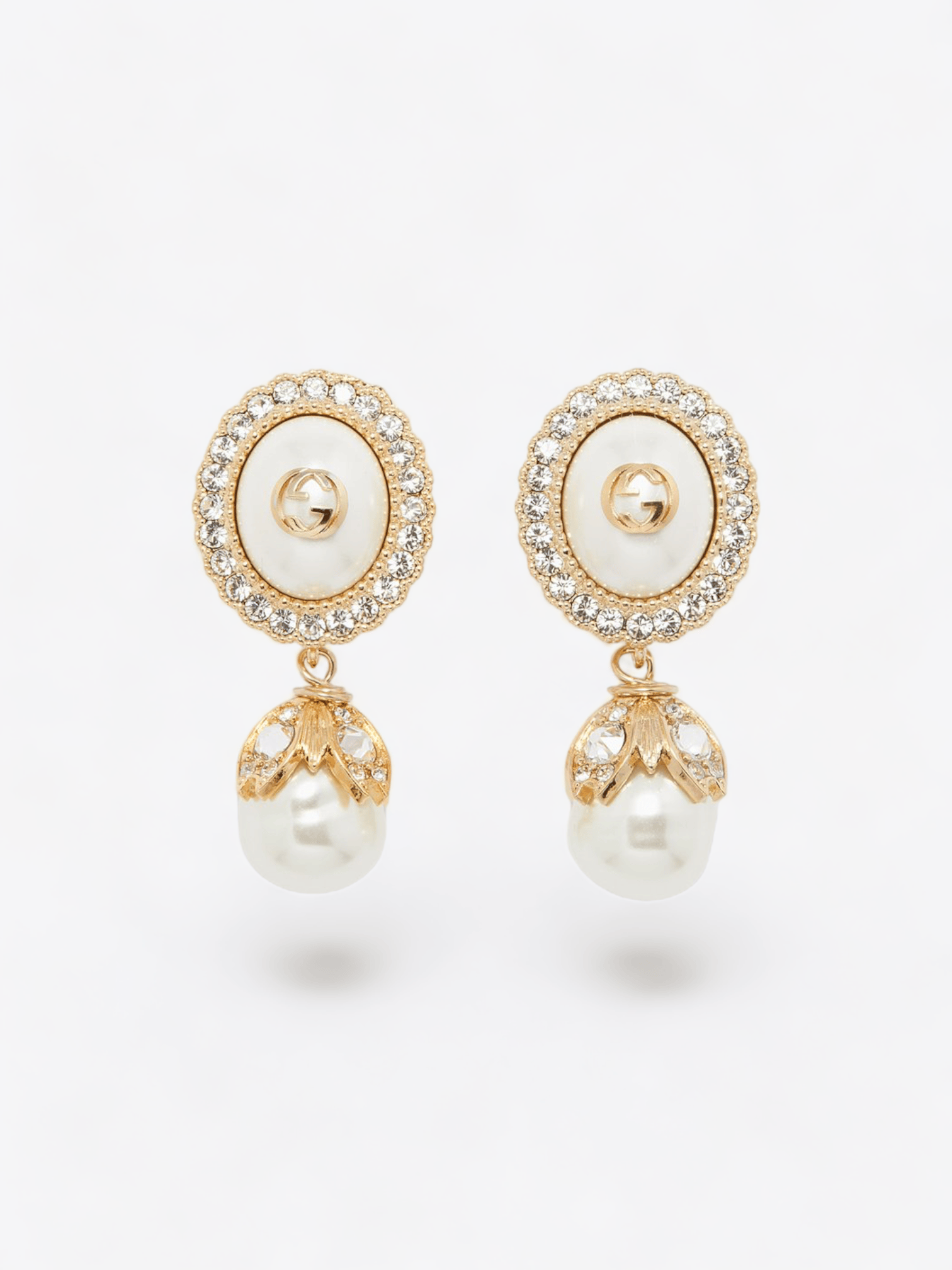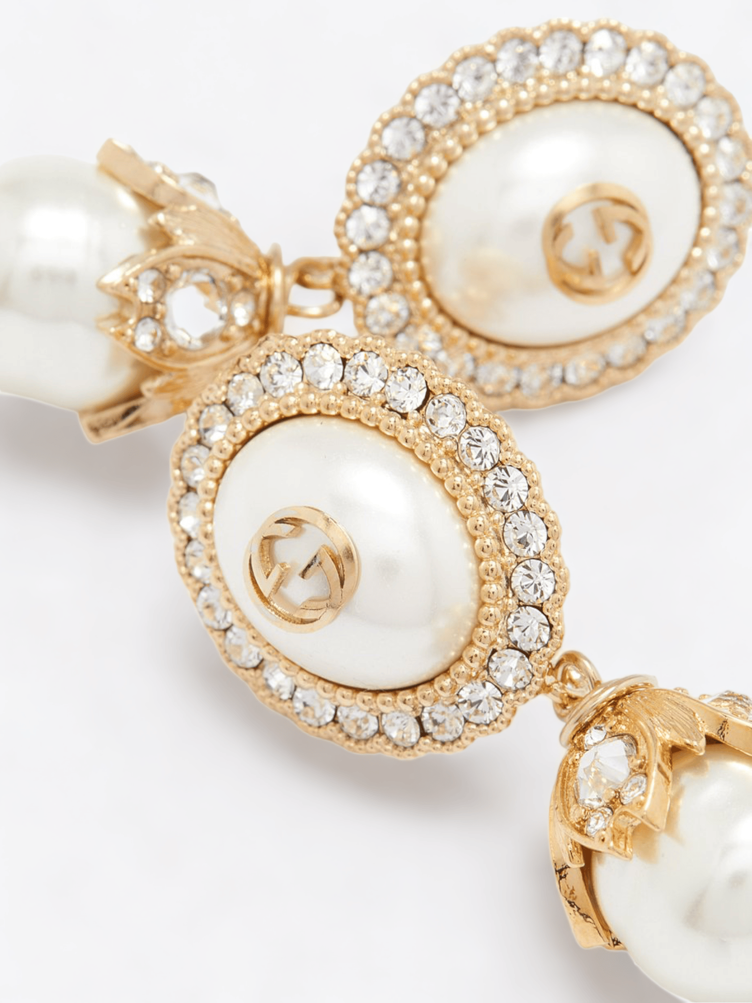 Die Kombination aus luxuriösem Gold mit Perlen und Kristallen verleiht diesen Ohrringen eine Aura von Raffinesse und Eleganz. Die perlenförmigen Anhänger vermitteln einen Hauch von klassischem Romantismus, während das ineinander verschlungene G-Muster an das prestigeträchtige Erbe der Marke erinnert.