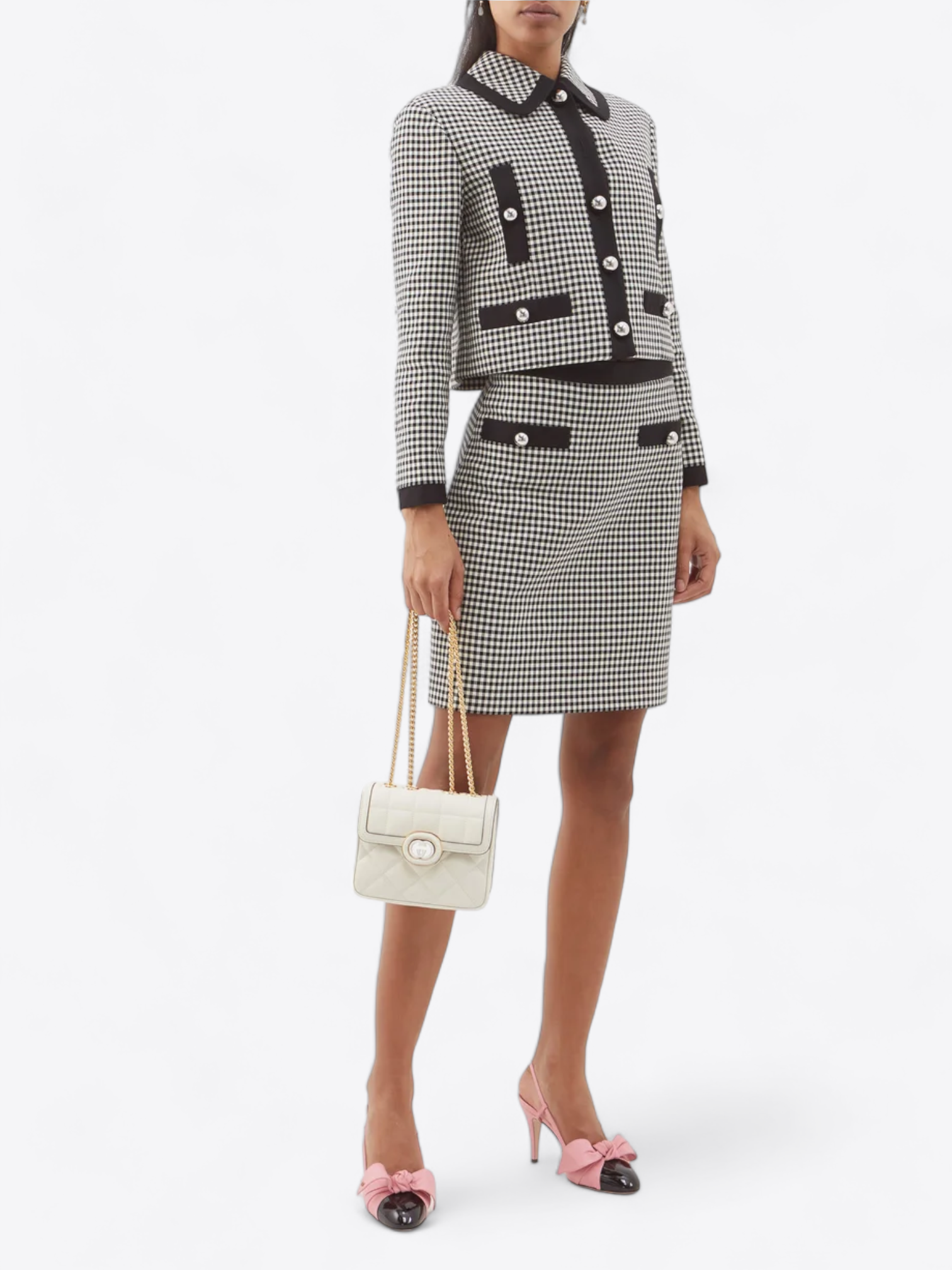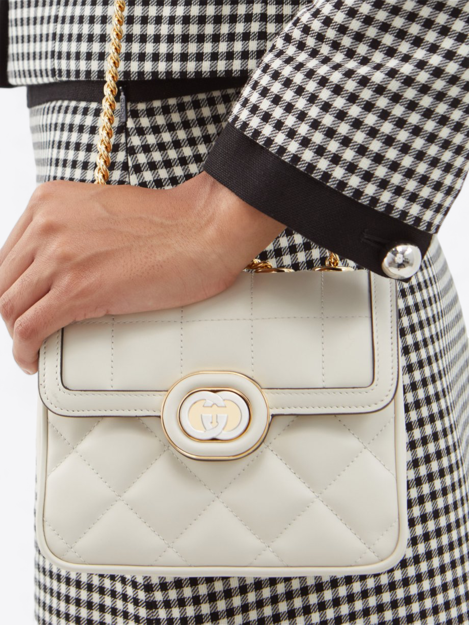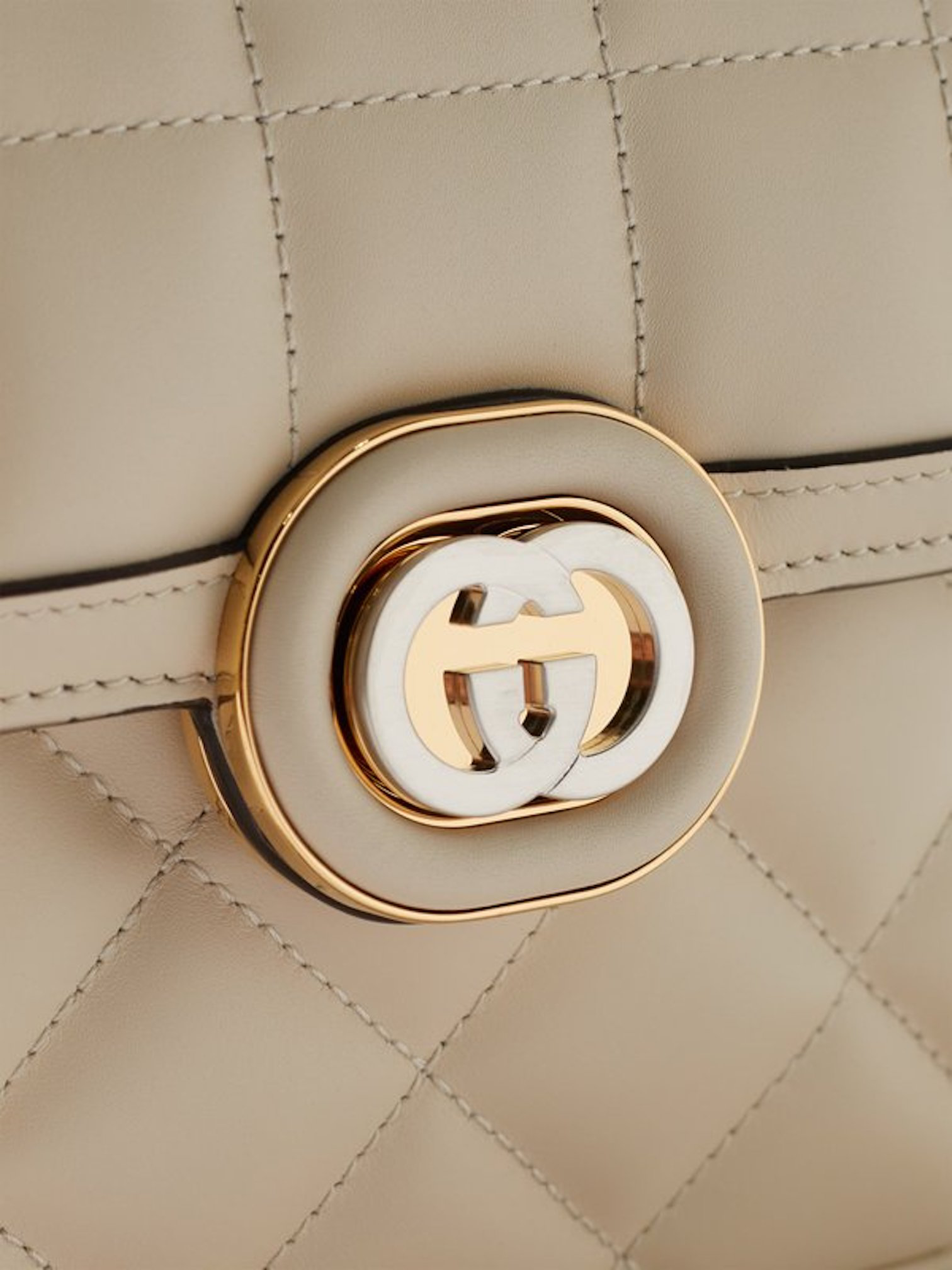 Details und Verarbeitungen: Die Tasche ist mit goldfarbenen Emaille-Details verziert, die einen Hauch von Glamour und Raffinesse hinzufügen. Der ikonische Gucci-Verschluss, ein ineinandergreifendes Doppel-G, wird durch eine glänzende goldene Umrandung hervorgehoben, was den Charme und die Eleganz des Designs betont. Innen ist die Tasche mit glattem Leder ausgekleidet und verfügt über eine Innentasche zur Organisation Ihrer wichtigsten Dinge.