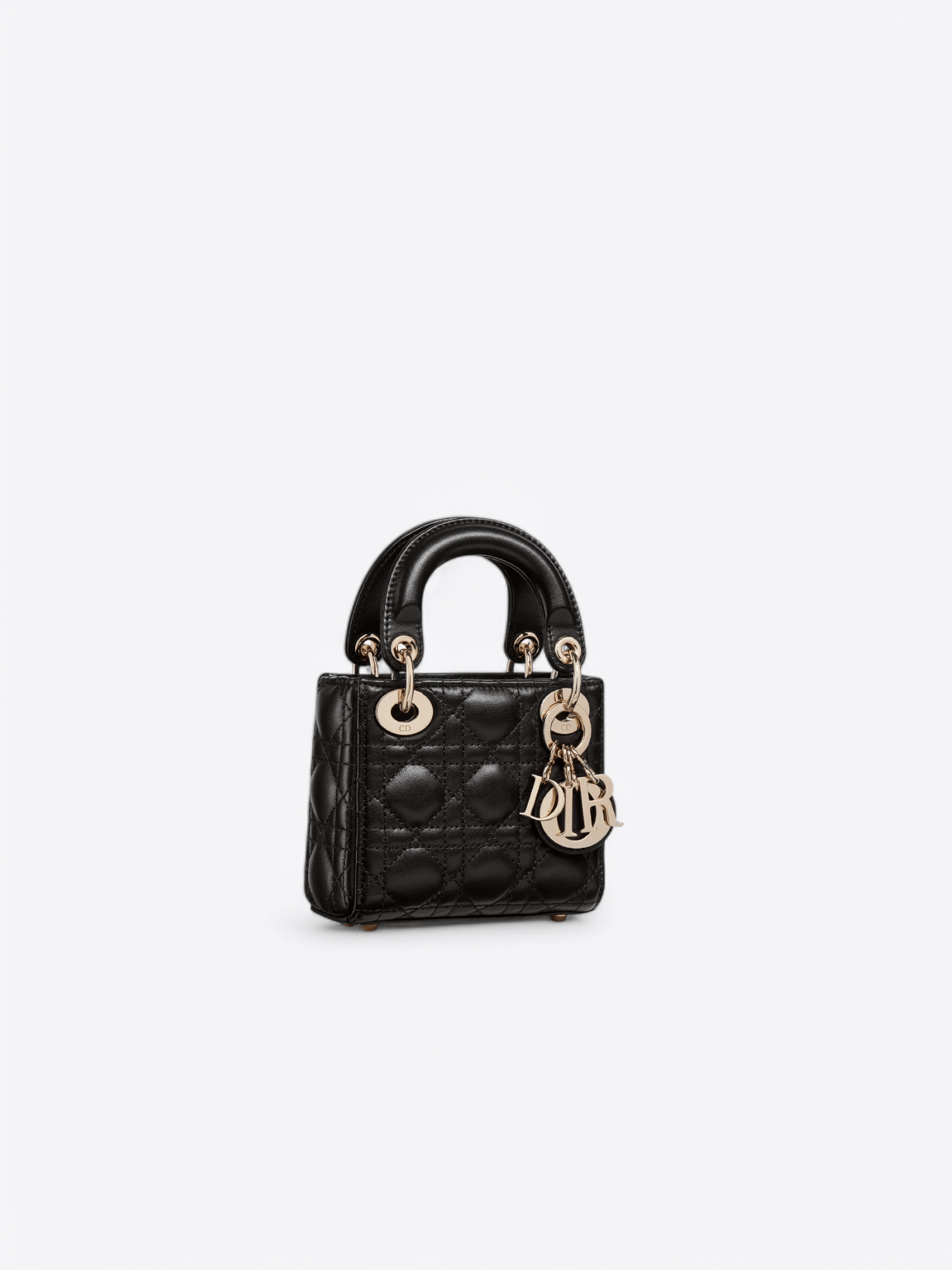 Die Lady Dior Micro ist ein wahres Schmuckstück aus dem Hause Dior und verkörpert zeitlose Eleganz sowie meisterhafte Handwerkskunst. Gefertigt aus schwarzem Lammleder mit dem ikonischen Cannage-Steppmuster, ist diese Tasche ein Symbol für Raffinesse und Stil. Ihre kompakte Silhouette wird durch den charakteristischen D.I.O.R.-Charm ergänzt, der Luxus und Exklusivität ausstrahlt. Hergestellt in Italien, bietet die Tasche mit ihren Maßen (12 x 10,2 x 5 cm) Platz für Ihre wichtigsten Essentials wie eine Kartenhülle oder einen Lippenstift. Dank des verstellbaren und abnehmbaren Schulterriemens kann sie vielseitig getragen werden: in der Hand, über der Schulter oder als Crossbody.