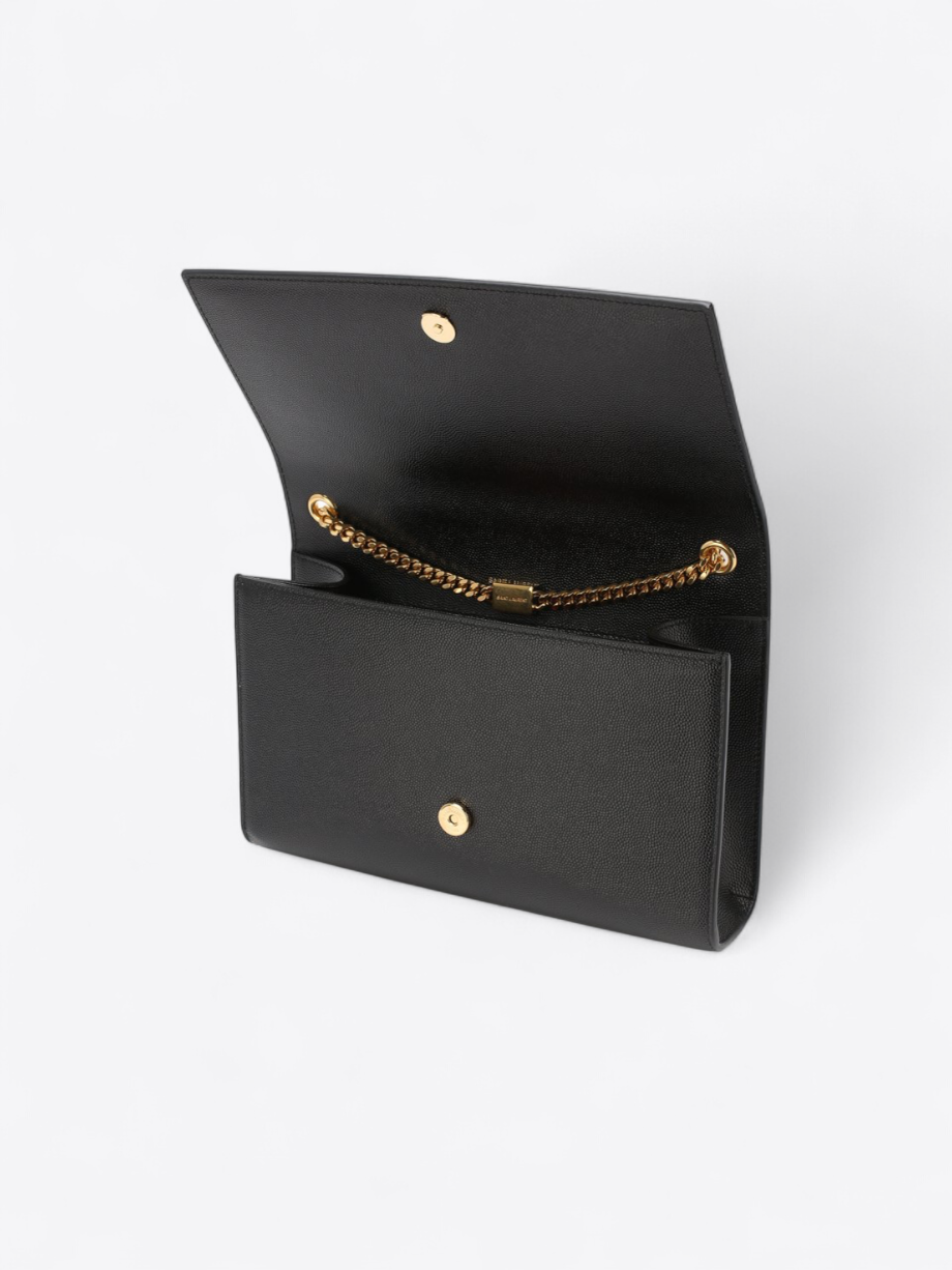 Die italienische Fertigung garantiert höchste Qualitätsstandards: regelmäßig gesetzte, feste Nähte, luxuriöse Verarbeitung und vergoldete YSL-Cassandre-Metallelemente kombiniert mit der Kettenschulterriemen-Optik.