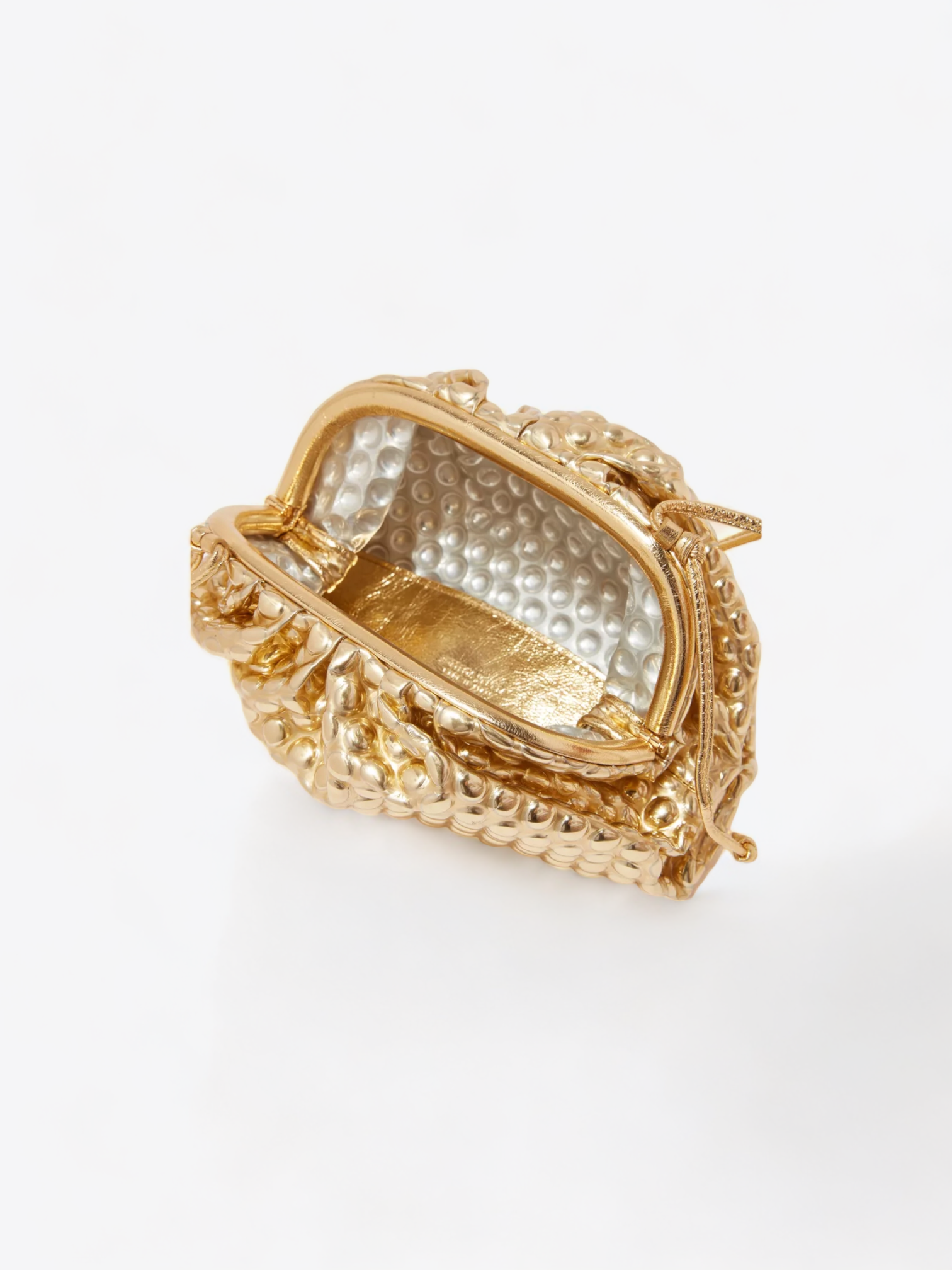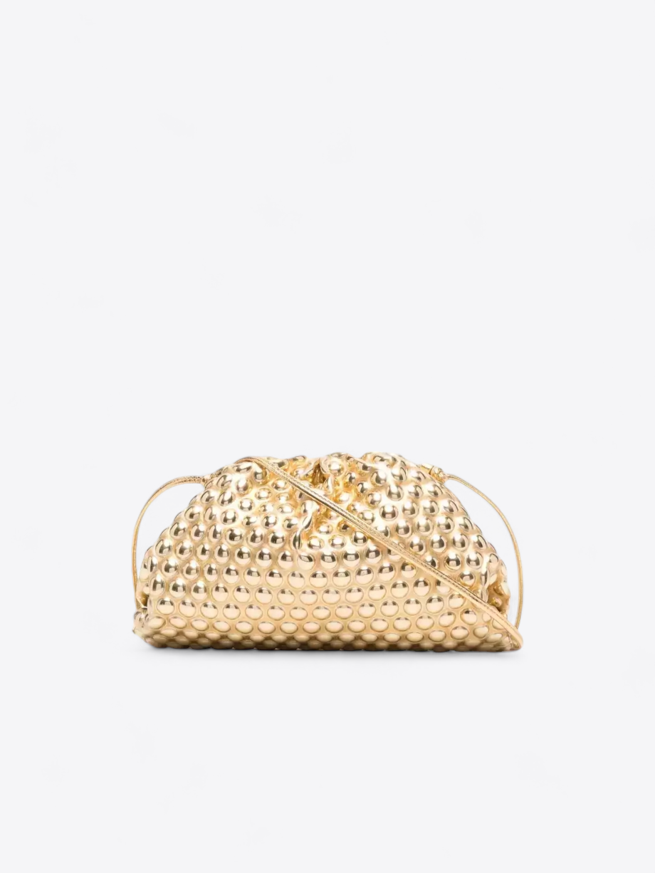 Hergestellt mit unvergleichlichem handwerklichem Können, ist die Pochette The Pouch in hochwertiges goldenes Leder gehüllt, dessen Textur an Luftpolsterfolie erinnert und ihrem luxuriösen Aussehen eine fantasievolle Note verleiht. Das charakteristische Wolken-Design von Bottega Veneta wird durch zarte Raffungen magnifiziert, die der Tasche ein luftiges Volumen und eine fließende Silhouette verleihen, als ob sie zwischen Ihren Händen schwebte.