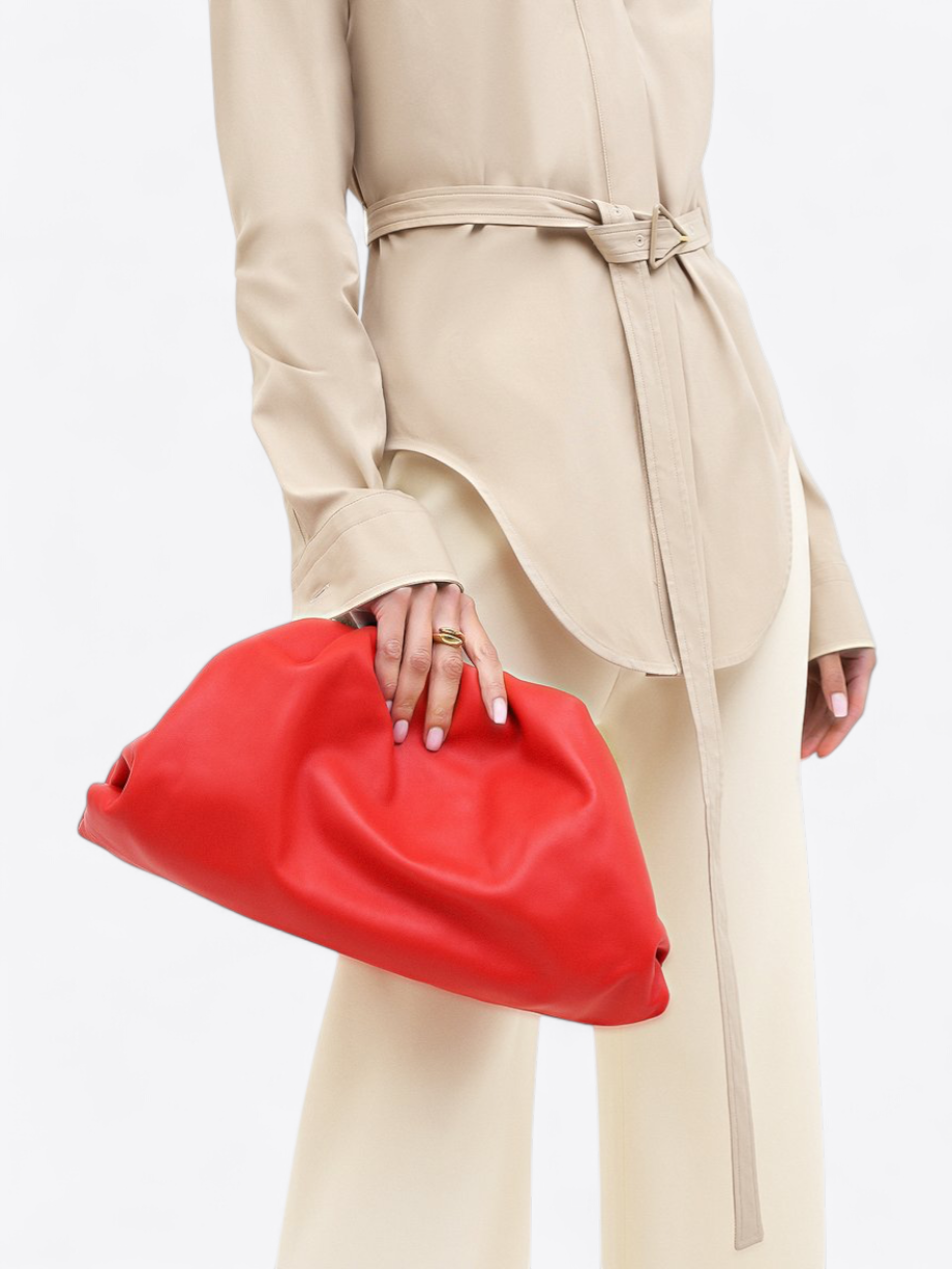 Die Pouch eignet sich für eine Vielzahl von Stilen und Veranstaltungen. Für einen Einkaufstag oder ein Mittagessen mit Freunden kombinieren Sie sie mit einer dunklen Jeans und einem Kaschmirpullover für einen lässig-eleganten Look. Für einen eleganteren Abend passt sie perfekt zu einem kleinen schwarzen Kleid und hohen Absätzen, wobei sie einen Hauch von kühner Farbe zu einem klassischen Outfit hinzufügt. Goldene oder silberne Accessoires wie lange Ohrringe oder Armreifen ergänzen den Glanz des roten Pouch perfekt.