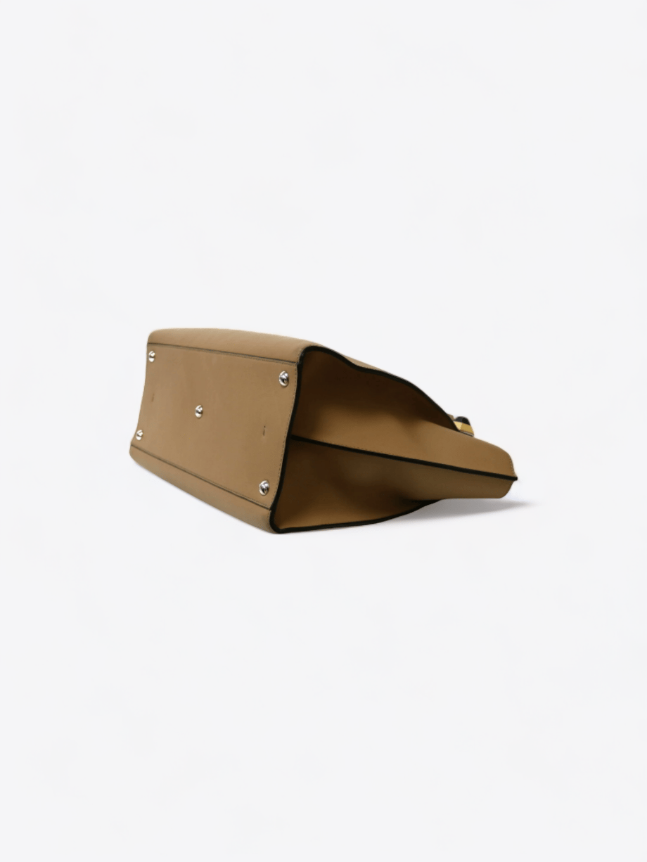 Das ikonische Fendi-Logo, die beiden ineinander verschlungenen „F“, ist dezent auf der Vorderseite der Tasche eingeprägt und zeugt von der Authentizität und dem Prestige der Marke.