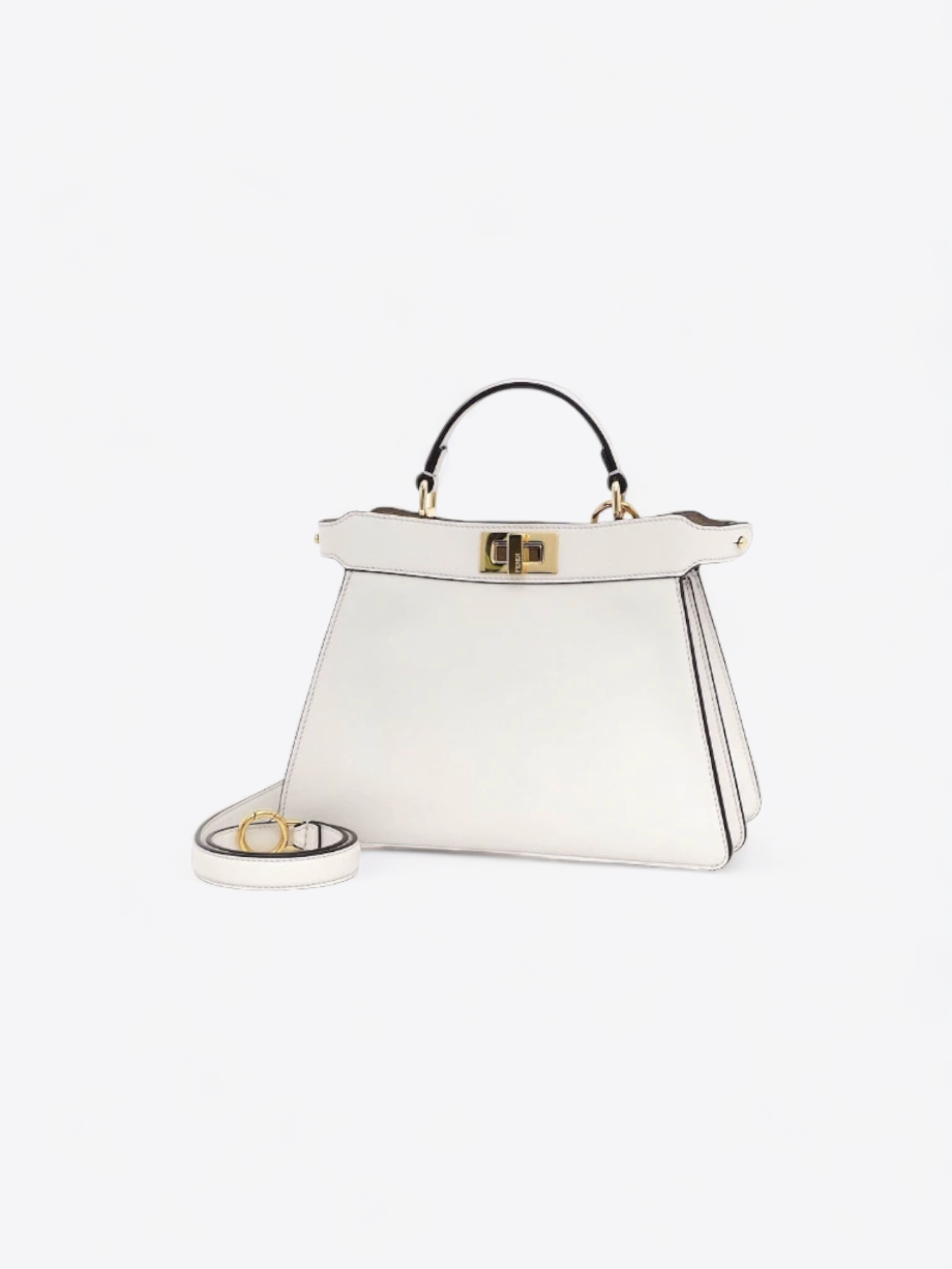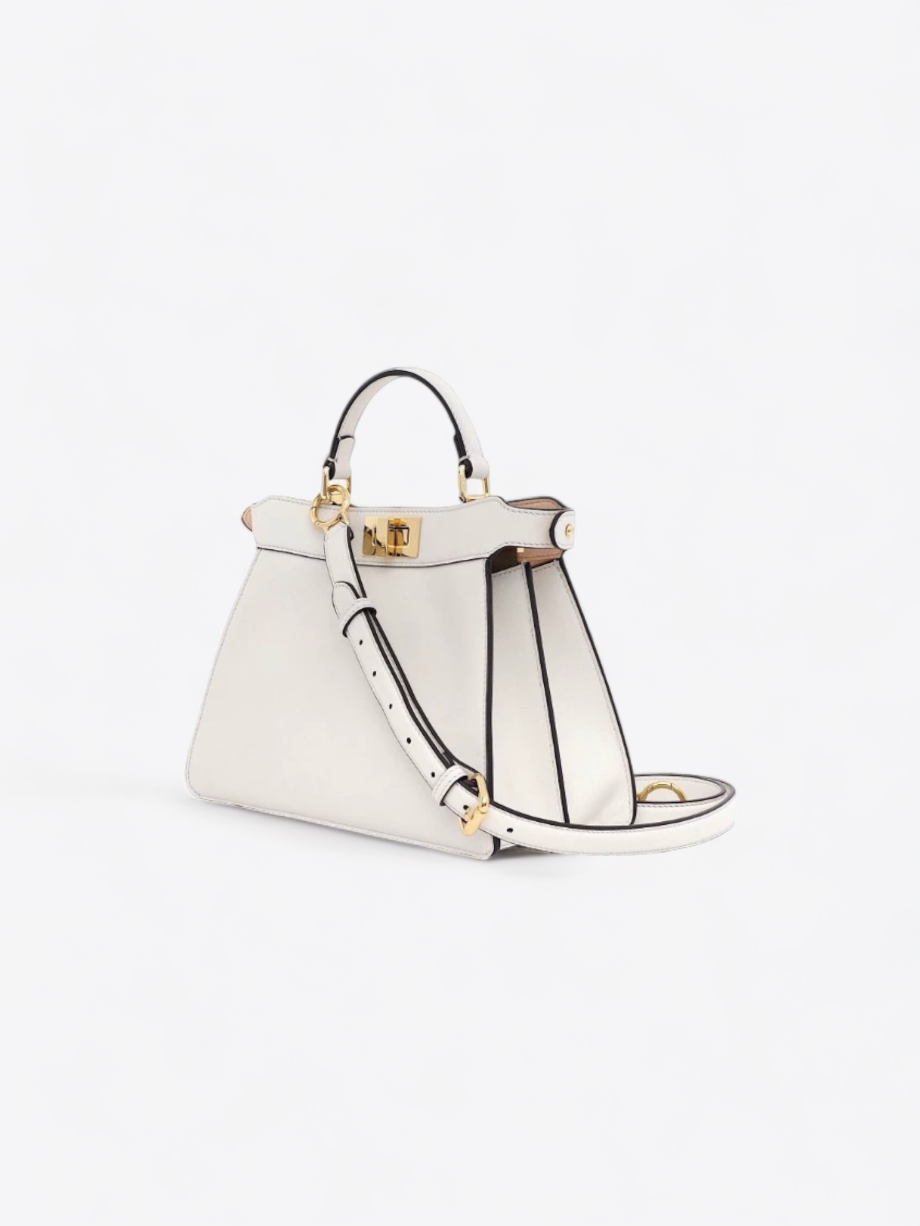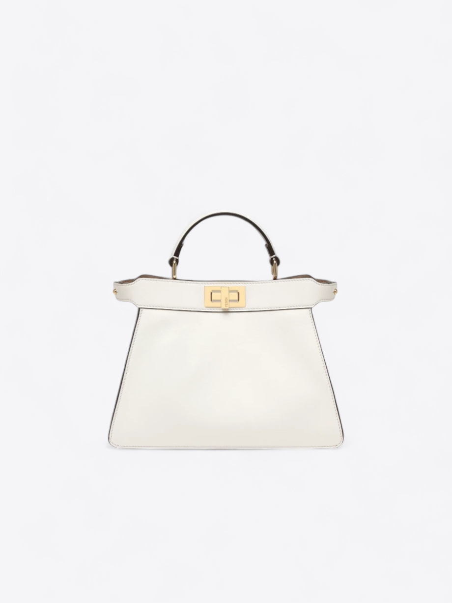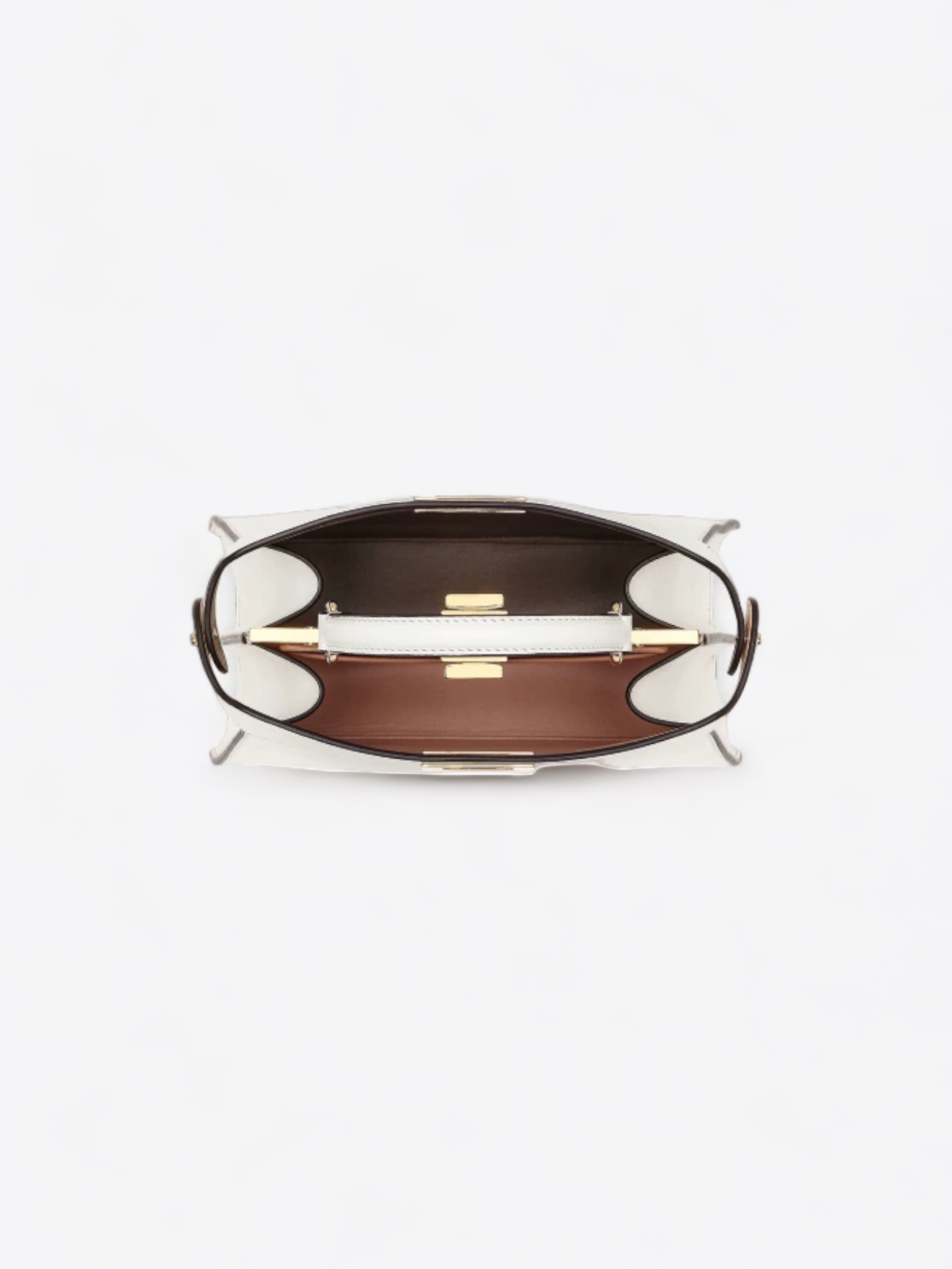 Die Peekaboo-Tasche hat eine strukturierte und klare Silhouette, die aus weißem Premium-Leder gefertigt ist. Ihr minimalistisches Design wird durch die subtilen und unverwechselbaren Details der Marke sublimiert. Beide Seiten der Tasche sind mit dem ikonischen Fendi-Drehverschluss verziert, der einen Hauch von Raffinesse und Glamour verleiht.