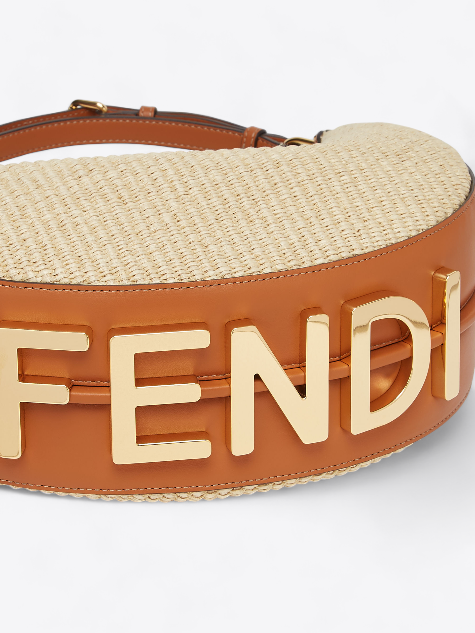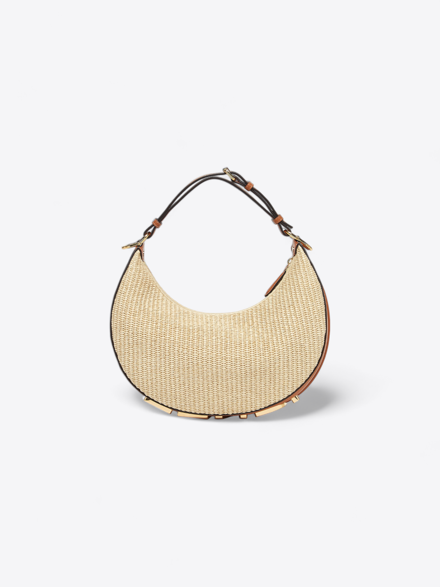 Beschreibung: Entdecken Sie die zeitlose Eleganz der kleinen Fendi Hobo-Tasche, ein zentrales Stück für jede Luxusgarderobe. Dieses exklusive Modell kombiniert meisterhaft die Authentizität von natürlichem Stroh und die Eleganz von braunem Leder. Die Textur des in Reiskornmuster gewebten Strohs schafft einen markanten Kontrast zu dem glatten und reichen Leder, das den Boden und die Details der Tasche bildet. Die ikonische FENDI-Inschrift in Vintage-Goldmetall hebt ihre schicke Ausstrahlung hervor und wird zum Blickfang, wenn sie unter dem Arm getragen wird.
