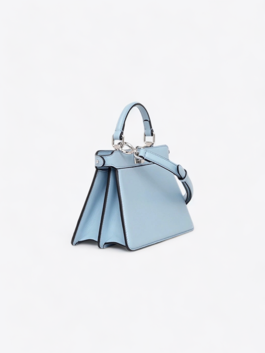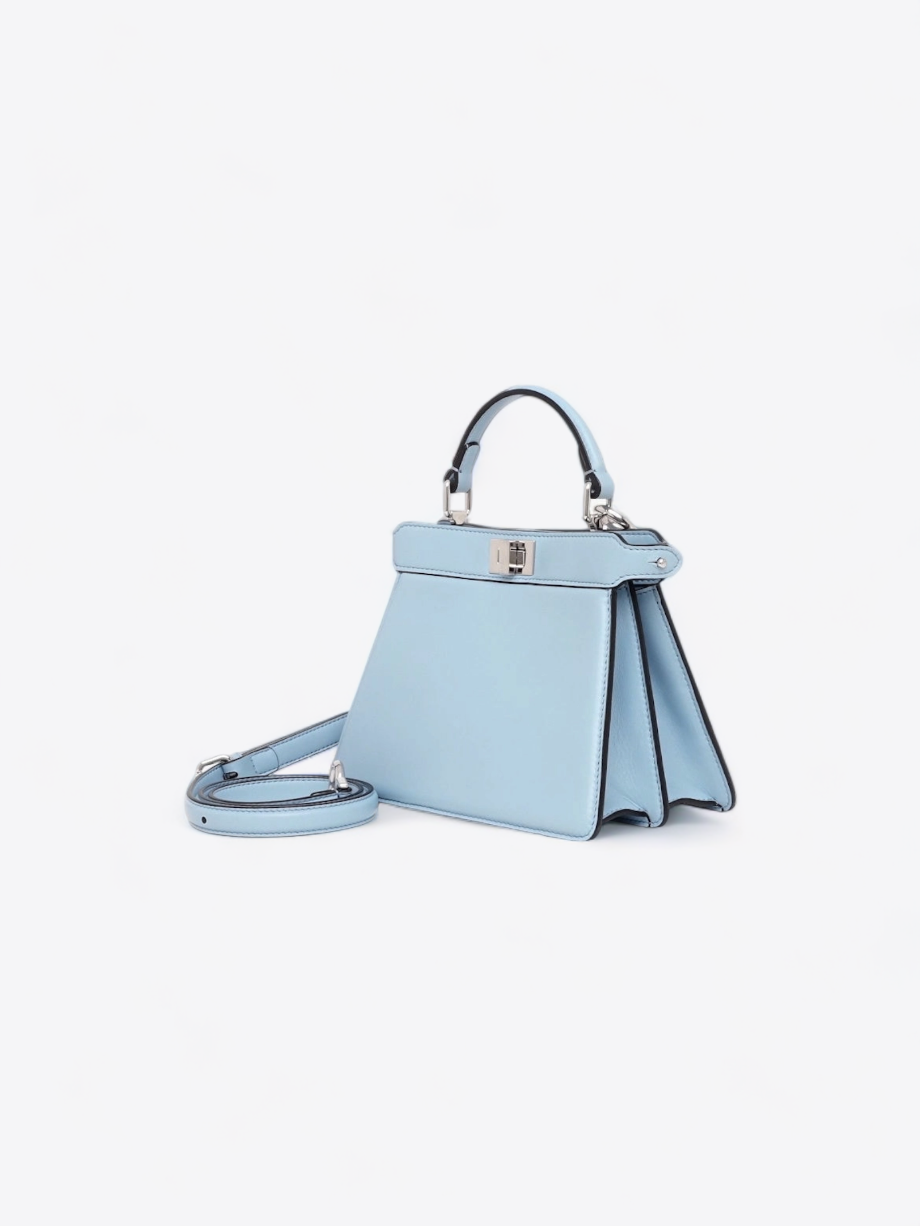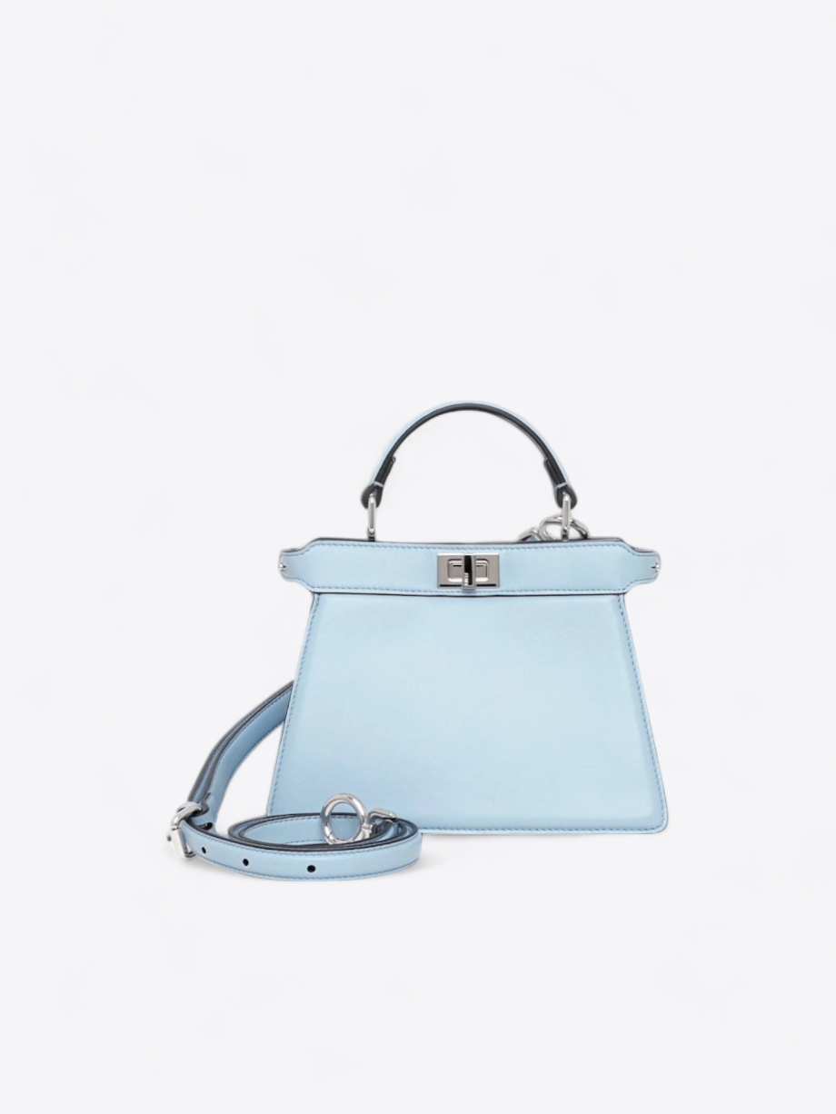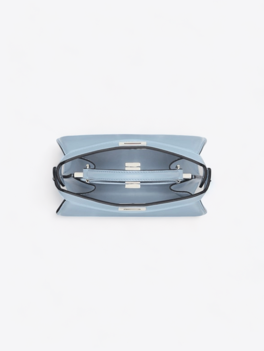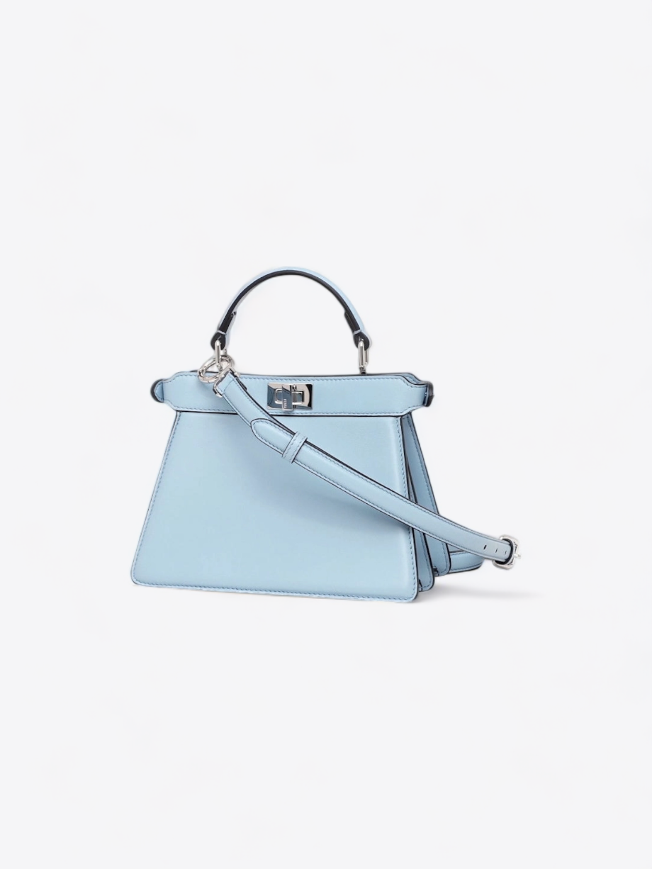 Entdecken Sie die Fendi Peekaboo ISeeU Handtasche im kompakten Format, eine Kreation, die die Essenz von Luxus und italienischer Eleganz verkörpert, jetzt erhältlich auf unserer Plattform für Luxushandtaschenverleih, welPop. Dieses Juwel der Lederverarbeitung, sorgfältig aus weichem Nappaleder gefertigt, ist in einem faszinierenden Blauton gehalten, der die Gelassenheit eines Sommerhimmels heraufbeschwört. Seine samtige Textur lädt zum Anfassen ein, während seine Polsterung einen unvergleichlichen Tragekomfort bietet.