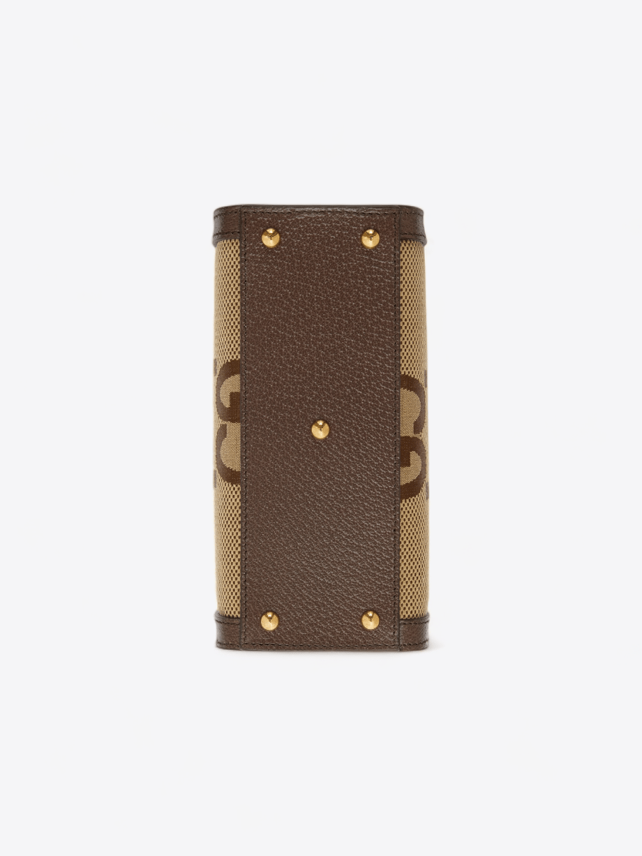 Das GG Jumbo-Canvas mit seinem übergroßen Muster ist sofort erkennbar und verleiht der Tasche einen kühnen und zeitgenössischen Charakter. Dieses Canvas wird durch reiche braune Lederausführungen aufgewertet, die dem Gesamtbild eine zusätzliche Textur und Tiefe verleihen. Die braune Farbe des Leders, klassisch und vielseitig zugleich, harmoniert perfekt mit dem monogrammierten Canvas und schafft einen visuellen Kontrast, der die Aufmerksamkeit auf sich zieht.