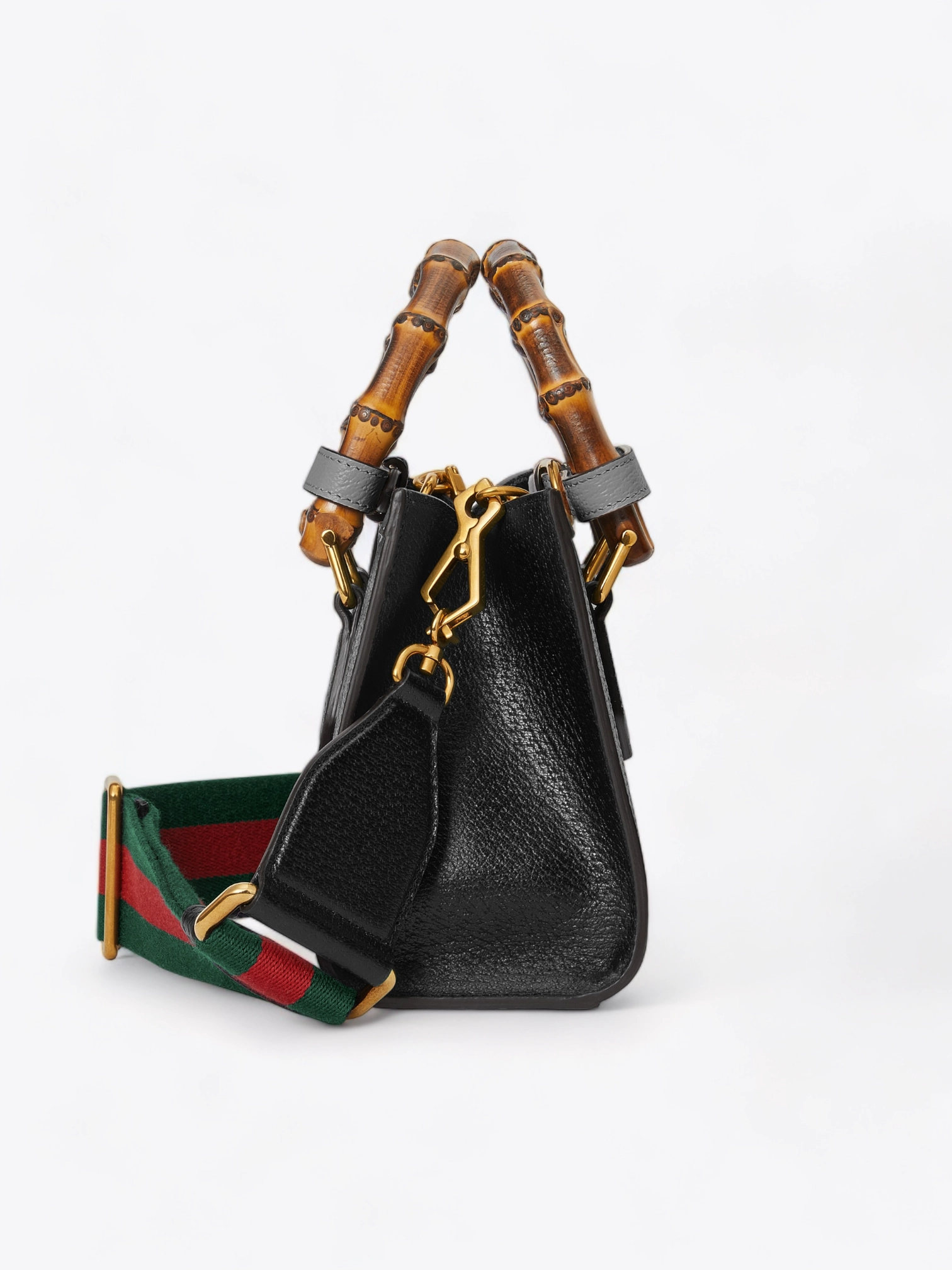 Die Gucci Diana Tasche ist ein wahres Kunstwerk der Lederverarbeitung und verkörpert die zeitlose Eleganz und das handwerkliche Können des Hauses Gucci. Hergestellt aus hochwertigem schwarzem Leder, zeichnet sich diese Tasche durch ihre glatte Textur und ihren subtilen Glanz aus, die das Licht einfangen und die Blicke auf sich ziehen. Die tiefe schwarze Farbe des Leders bietet eine perfekte Kulisse für die ikonischen Details dieser Tasche, darunter der Bambusgriff und das goldene Double-G-Detail, die in reichem und warmem Glanz erstrahlen.