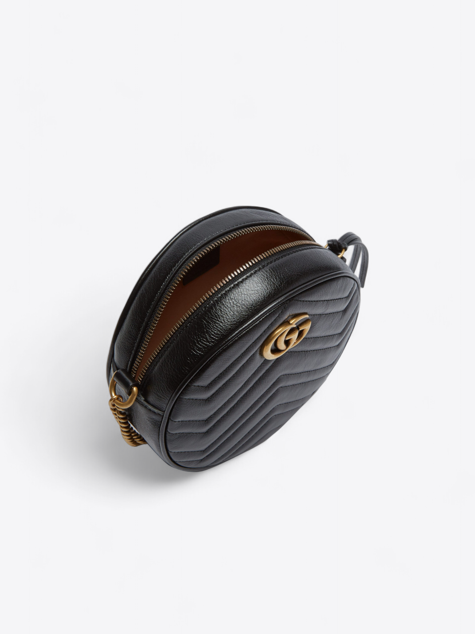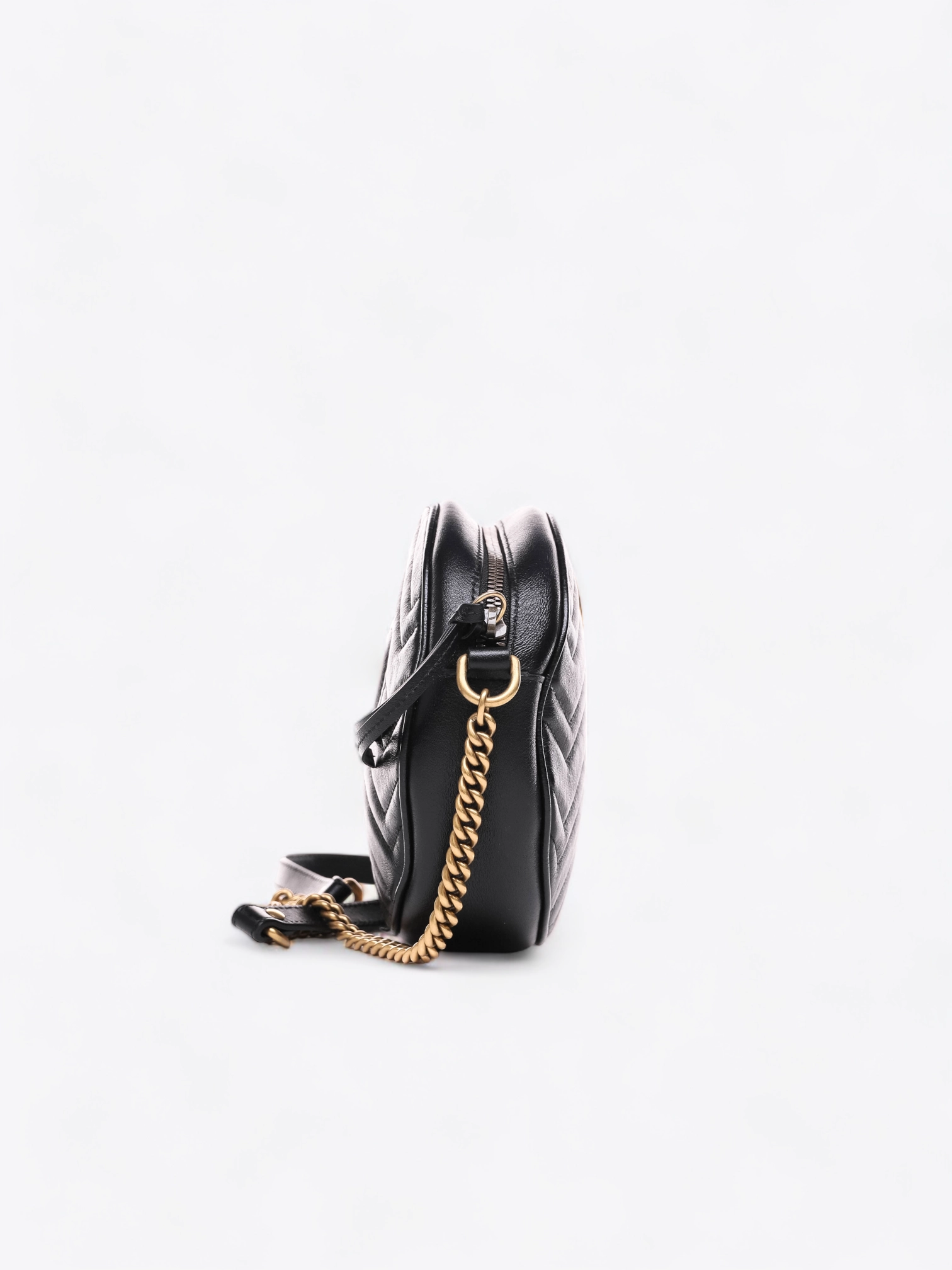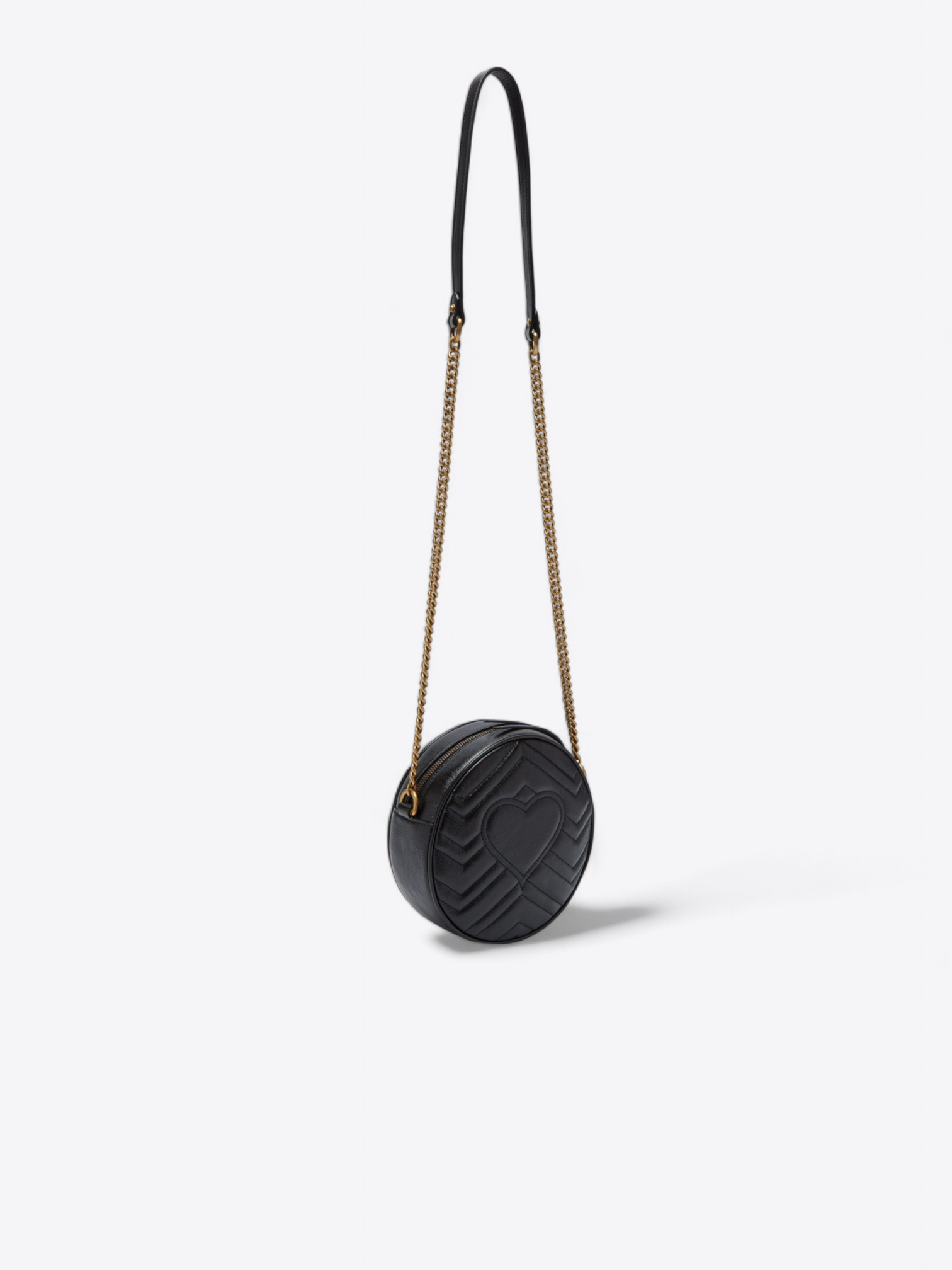 Das Detail des gesteppten Herzens auf der Rückseite der Tasche fügt eine subtile romantische Note hinzu und ist ein Hinweis auf die Zärtlichkeit, die das Haus Gucci in seine Kreationen einfließen lässt. Die goldene, robuste und raffinierte Kette bildet einen wunderschönen Kontrast zum schwarzen Leder und verleiht dem Ganzen eine luxuriöse Dimension.