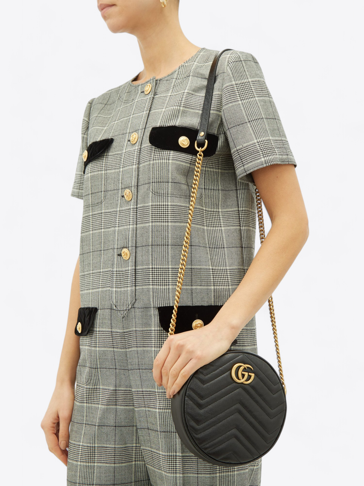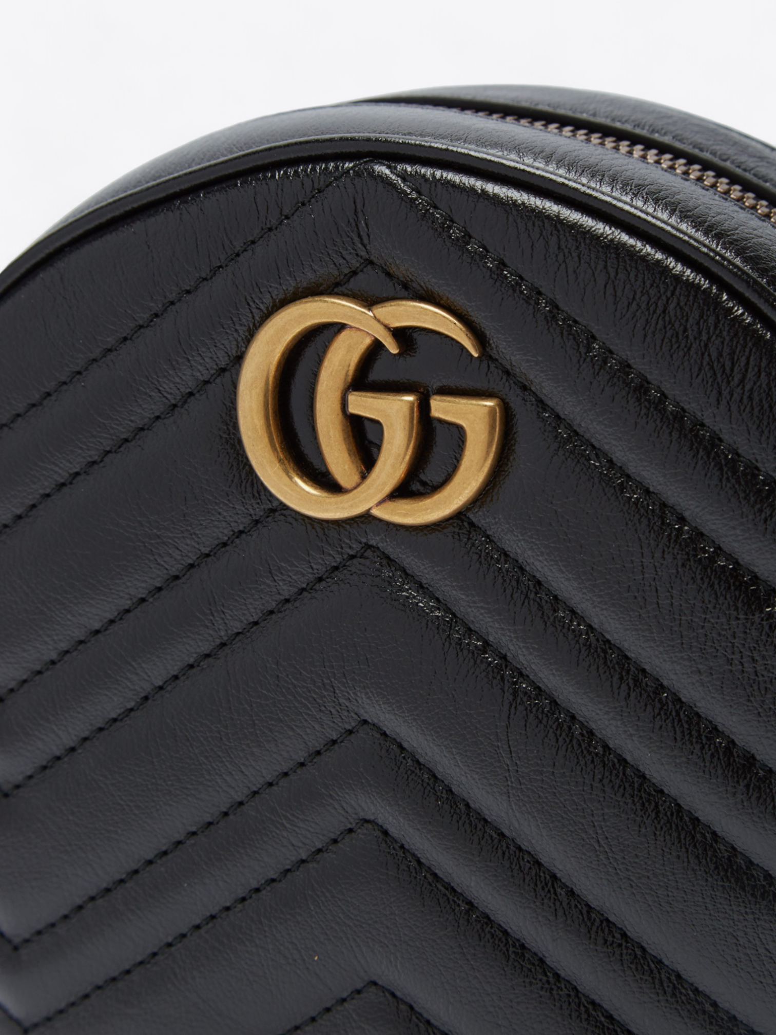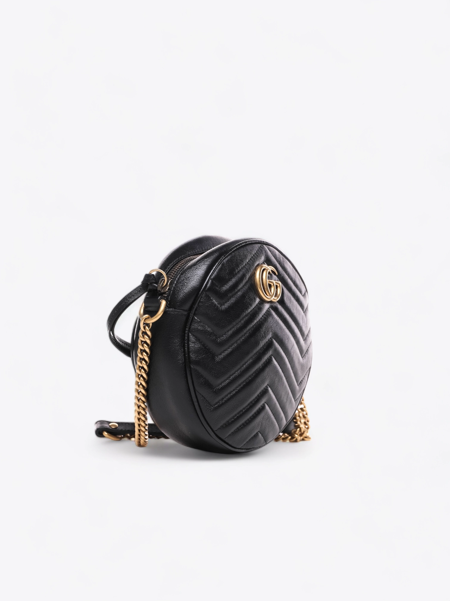 Das Detail des gesteppten Herzens auf der Rückseite der Tasche fügt eine subtile romantische Note hinzu und ist ein Hinweis auf die Zärtlichkeit, die das Haus Gucci in seine Kreationen einfließen lässt. Die goldene, robuste und raffinierte Kette bildet einen wunderschönen Kontrast zum schwarzen Leder und verleiht dem Ganzen eine luxuriöse Dimension.