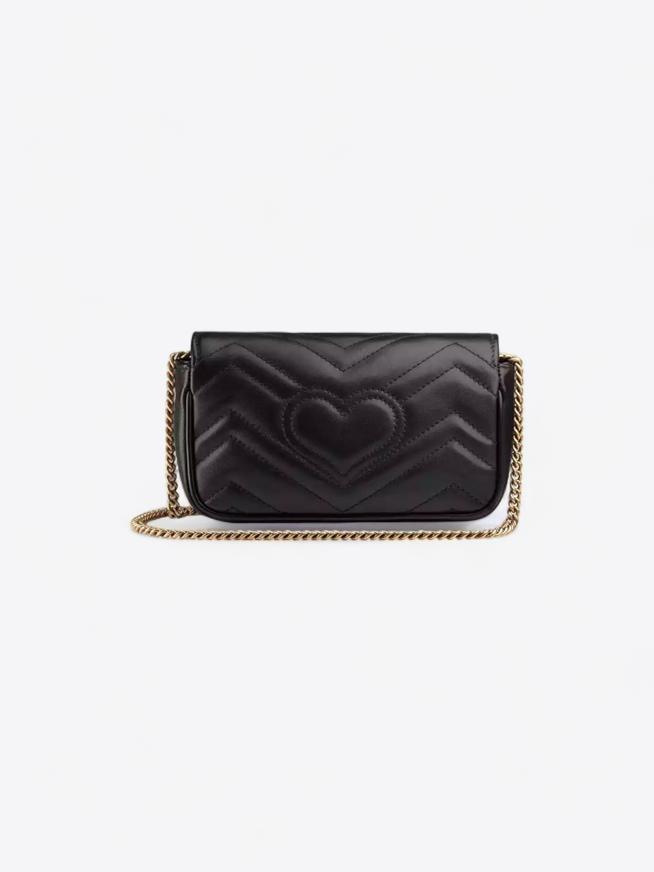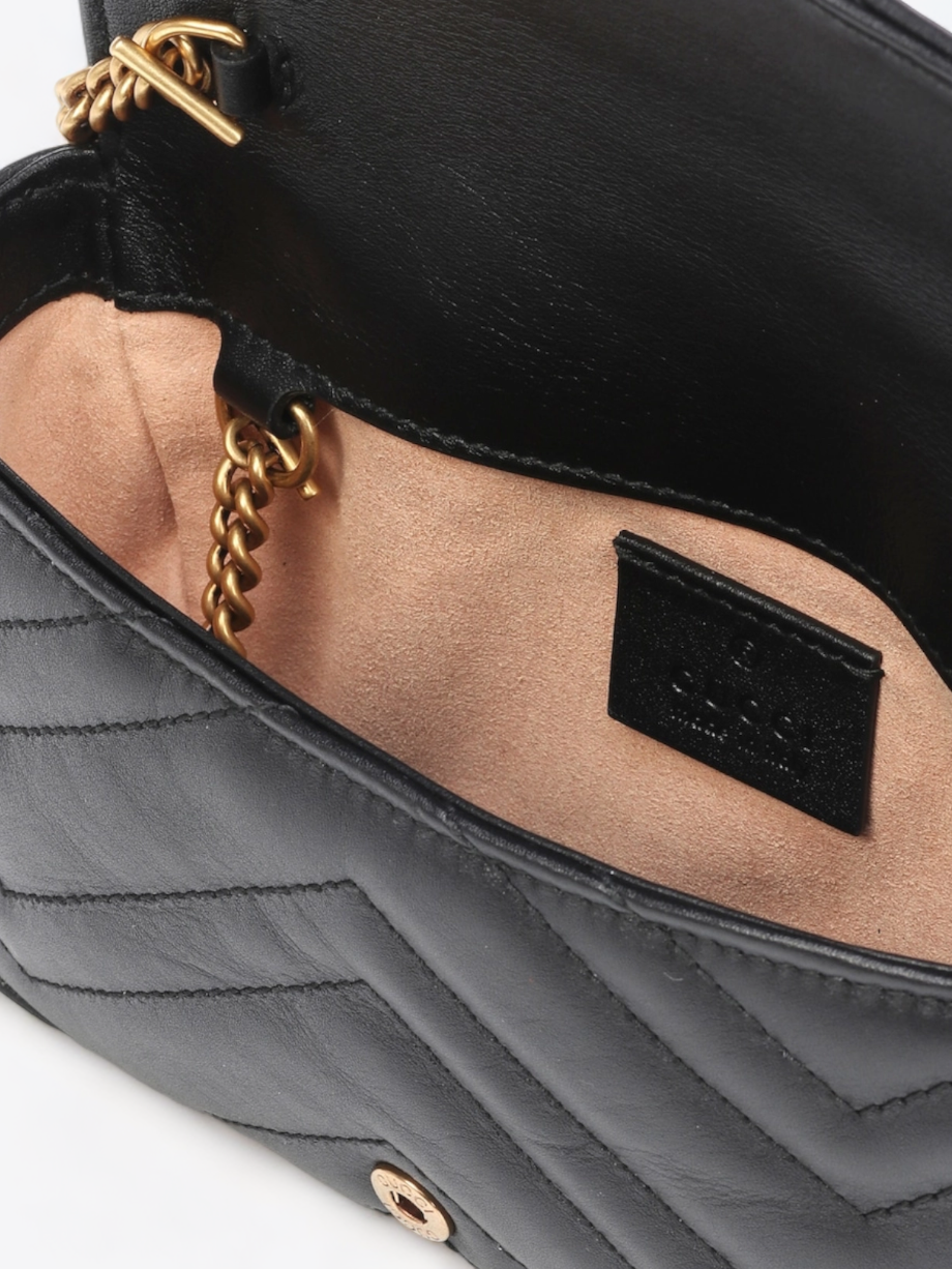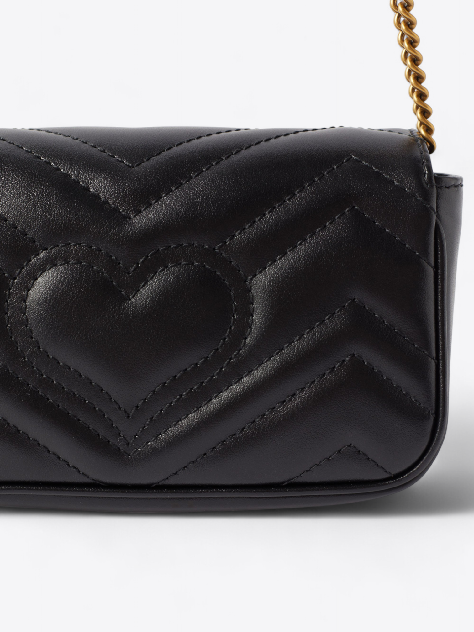 Die Gucci GG Marmont Supermini Tasche ist ein luxuriöses Accessoire, das Eleganz und Raffinesse verkörpert. Hergestellt mit akribischer Sorgfalt, präsentiert sich diese schwarze Ledertasche mit einer gesteppten Chevron-Textur, die ihr ein gleichzeitig modernes und zeitloses Aussehen verleiht. Die sichtbaren Nähte verleihen einen Hauch von Raffinesse und betonen das handwerkliche Können des Hauses Gucci.