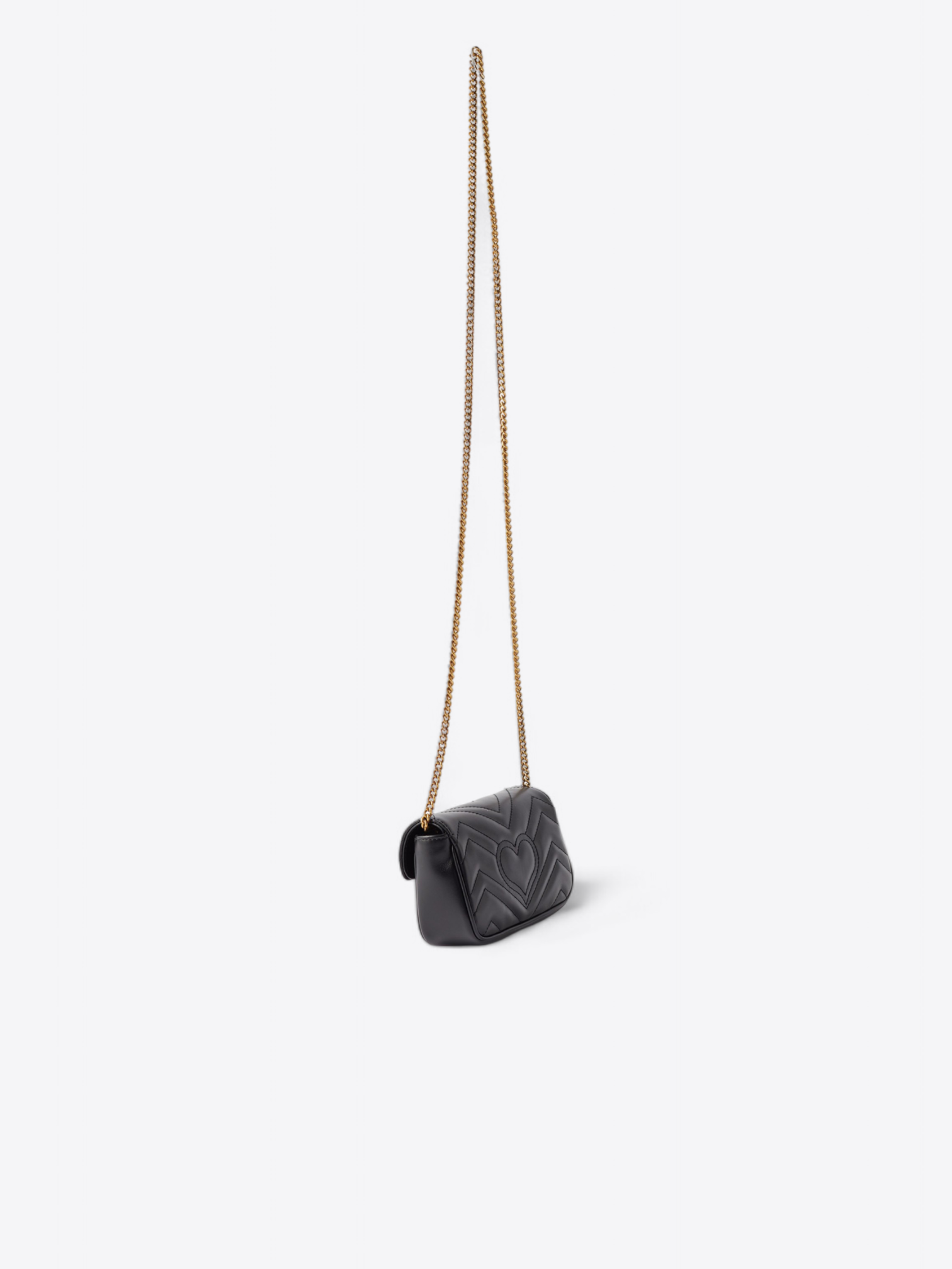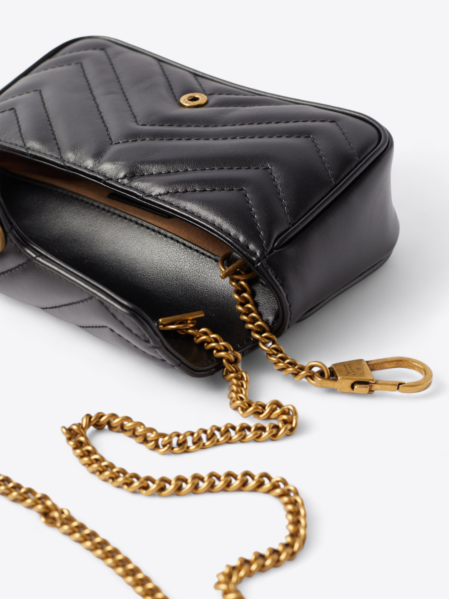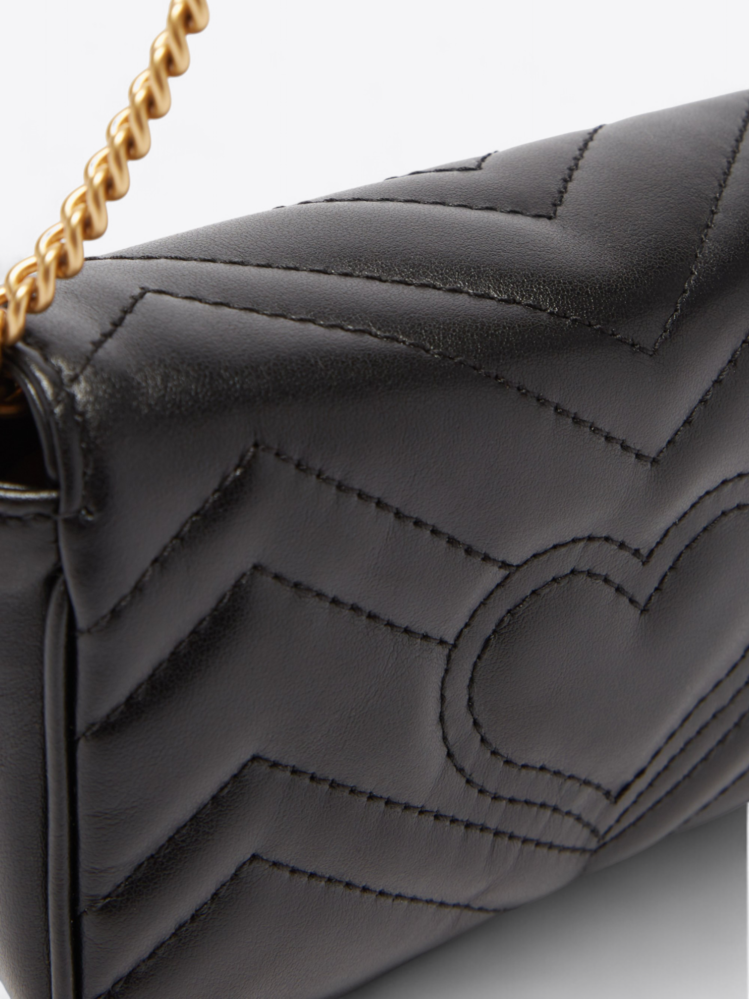 Die Gucci GG Marmont Supermini Tasche ist ein luxuriöses Accessoire, das Eleganz und Raffinesse verkörpert. Hergestellt mit akribischer Sorgfalt, präsentiert sich diese schwarze Ledertasche mit einer gesteppten Chevron-Textur, die ihr ein gleichzeitig modernes und zeitloses Aussehen verleiht. Die sichtbaren Nähte verleihen einen Hauch von Raffinesse und betonen das handwerkliche Können des Hauses Gucci.
