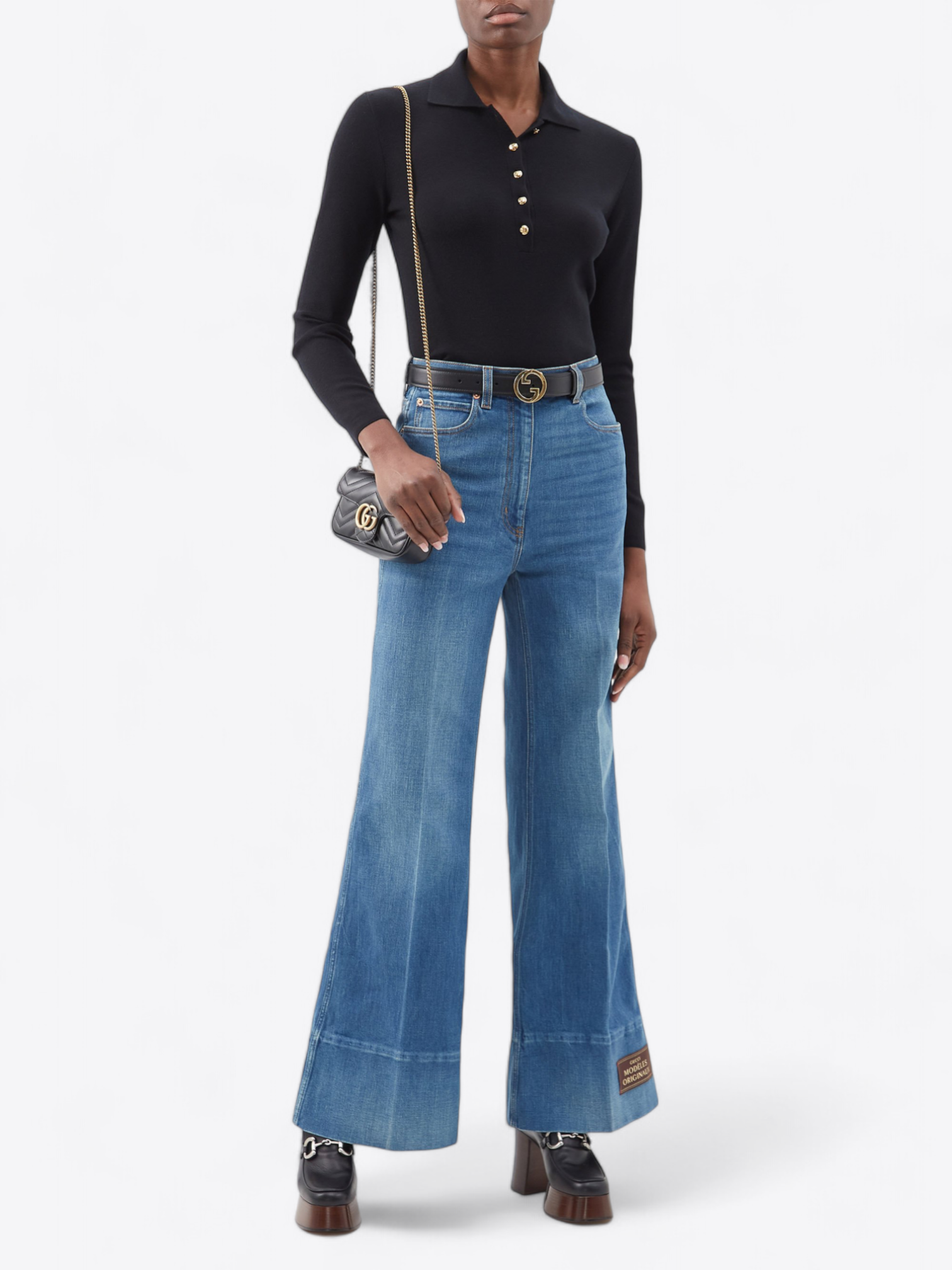 Die tiefe und intensive schwarze Farbe der Tasche macht sie zu einem vielseitigen Accessoire, das mit einer Vielzahl von Outfits und Stilen harmoniert. Das goldene Doppel-G-Logo, ein ikonisches Symbol von Gucci, schmückt die Vorderseite der Tasche und strahlt in vollem Glanz, was einen unbestreitbaren Hauch von Luxus verleiht.