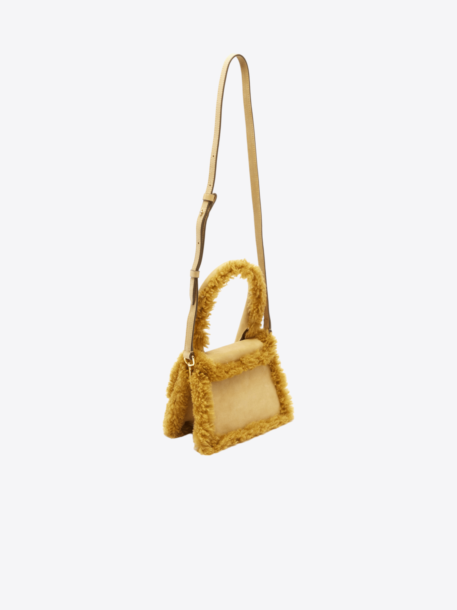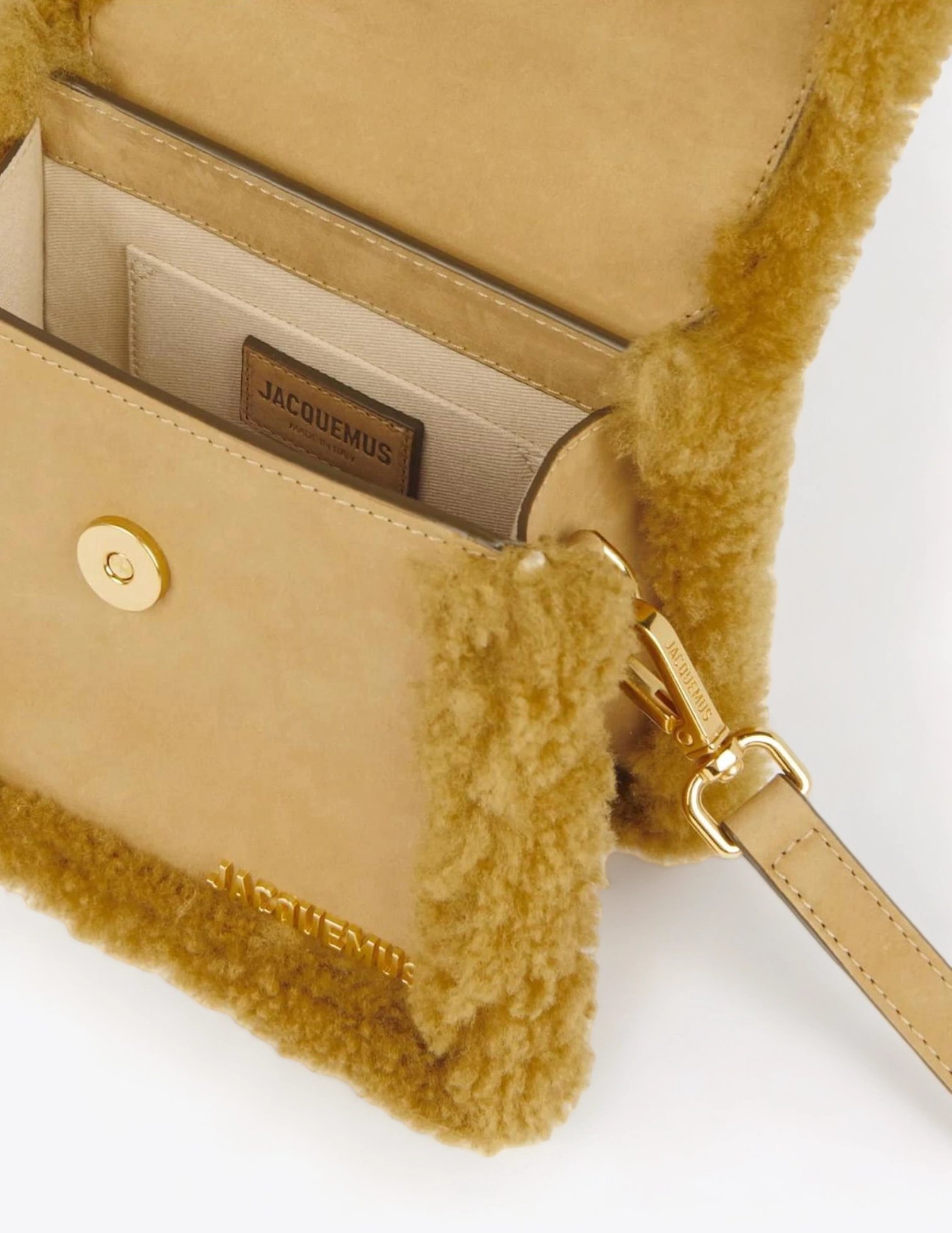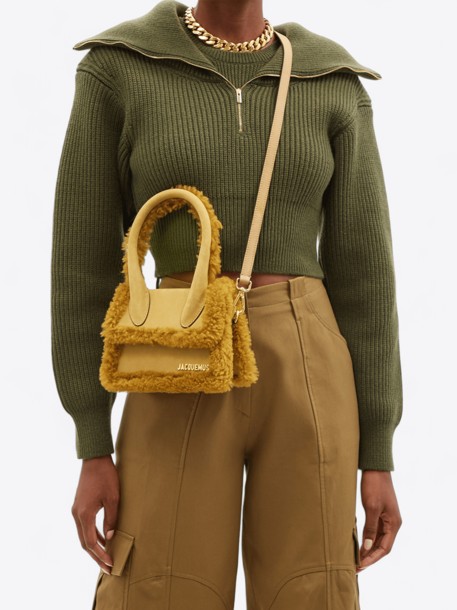 Tauche ein in die Welt des Luxus mit dieser Jacquemus-Tasche, einem Hauptstück unserer Mietkollektion bei welPop. Hergestellt mit außergewöhnlichem Können, vereint diese Tasche die rustikale Weichheit von Lammwolle mit der rohen Eleganz von Nubukleder und schafft eine harmonische Textur, die beim ersten Berühren verführt.