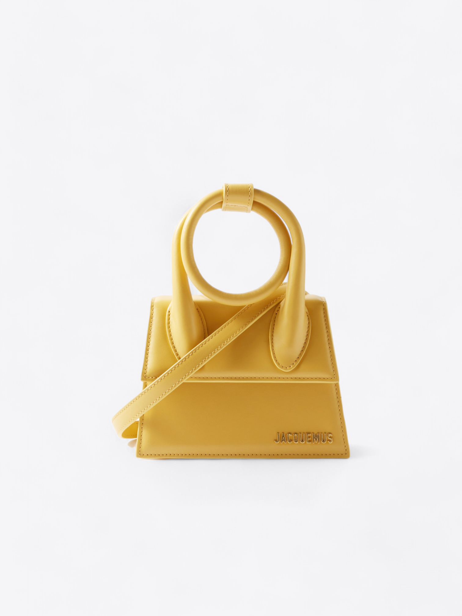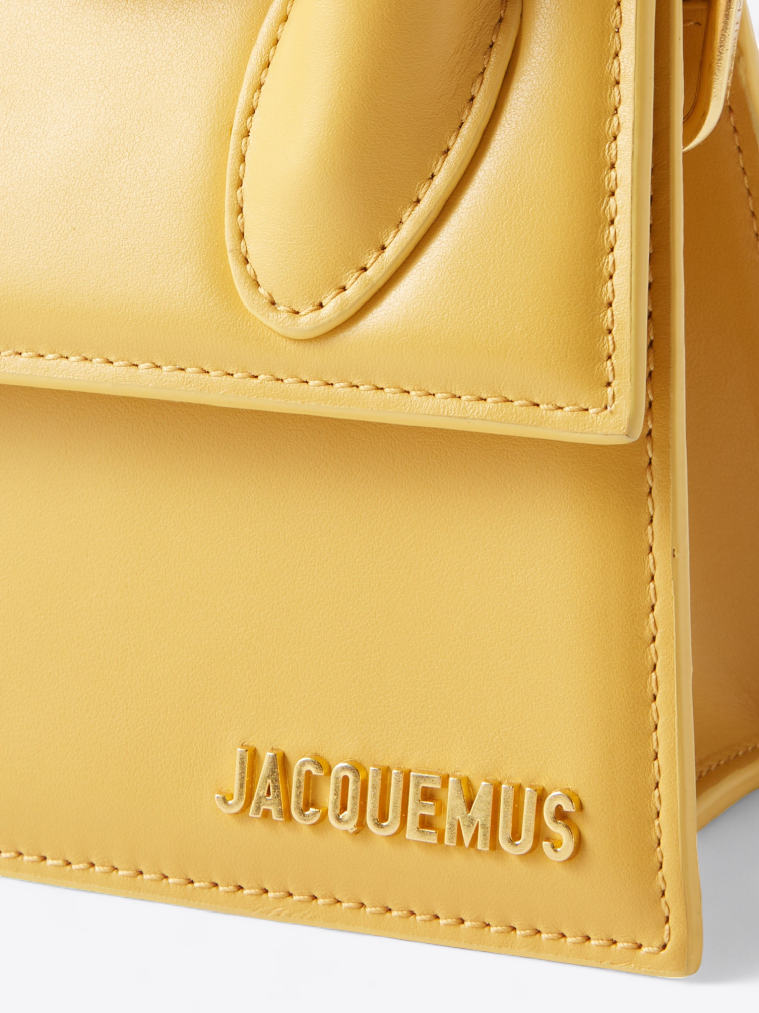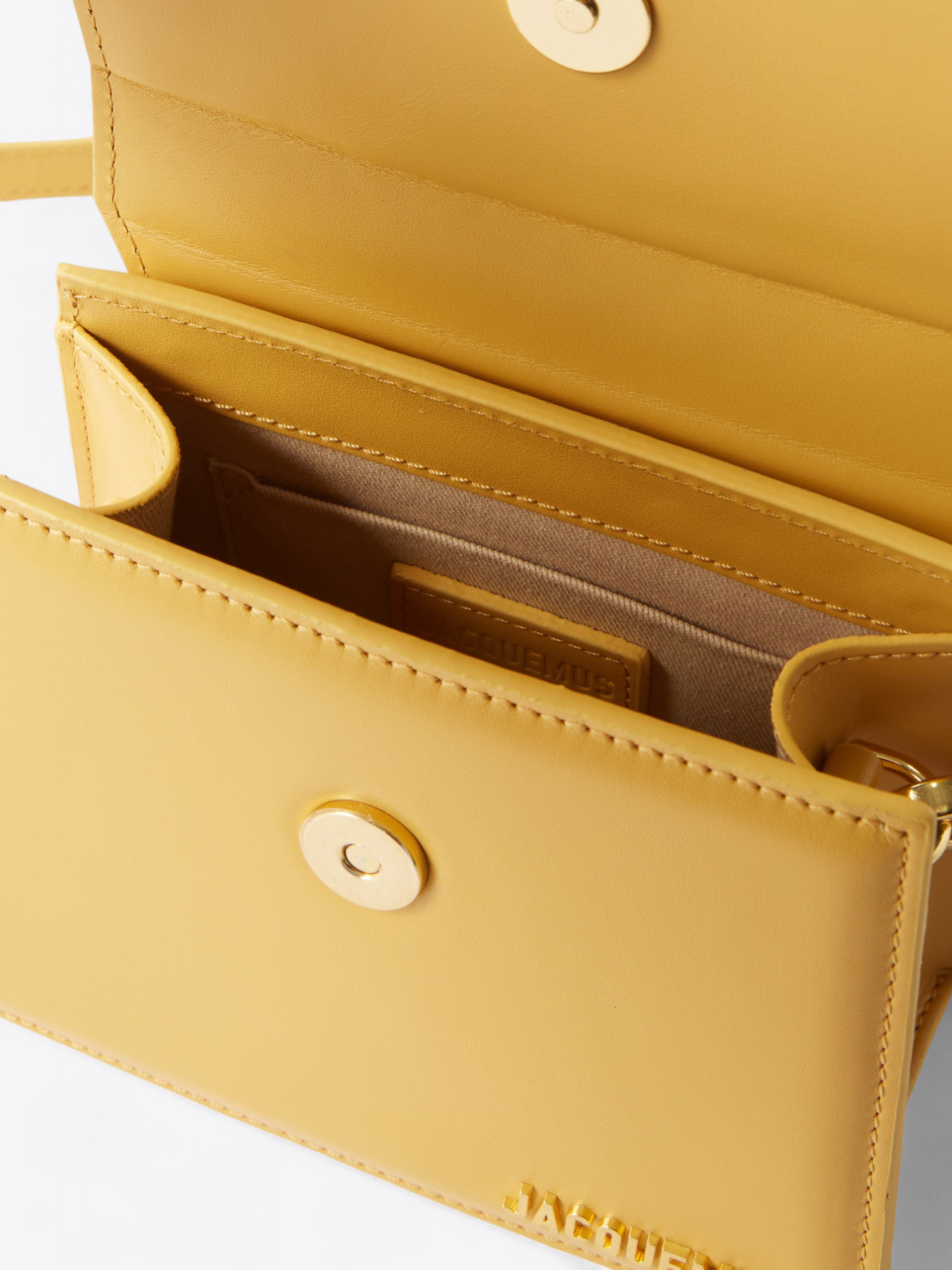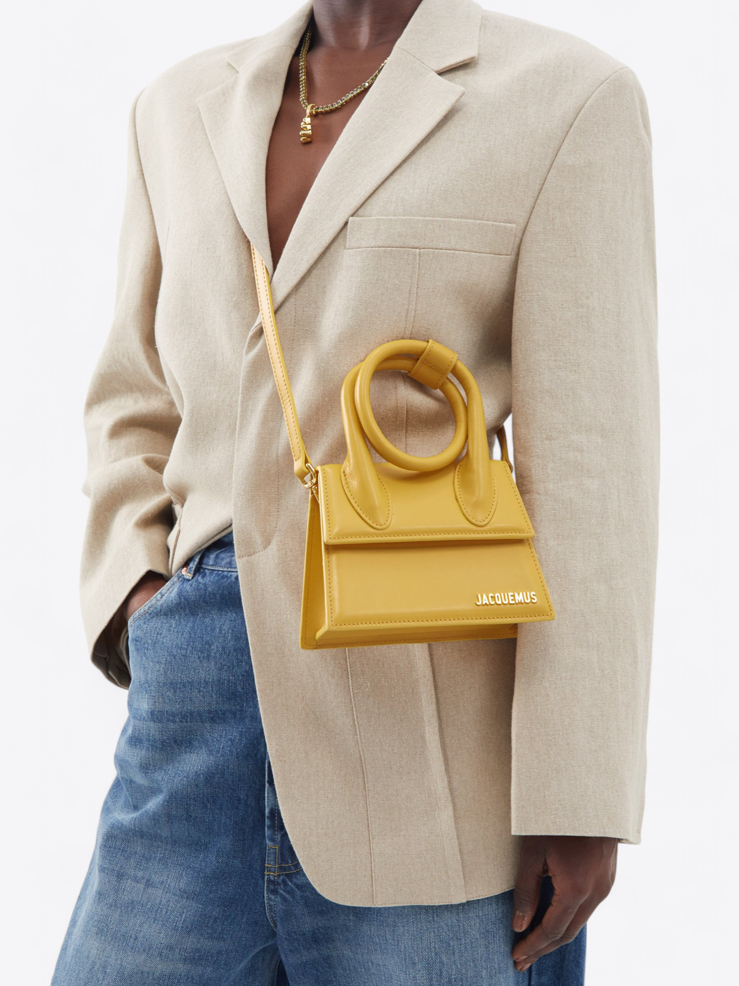 De gouden letters van het Jacquemus-logo, subtiel aangebracht aan de voorkant van de tas, schitteren als een sieraad en passen perfect bij je gouden accessoires. Stel je voor dat deze tas een delicate horloge of fijne armbanden vergezelt, een verfijnde set creërend die het licht en de aandacht vangt.