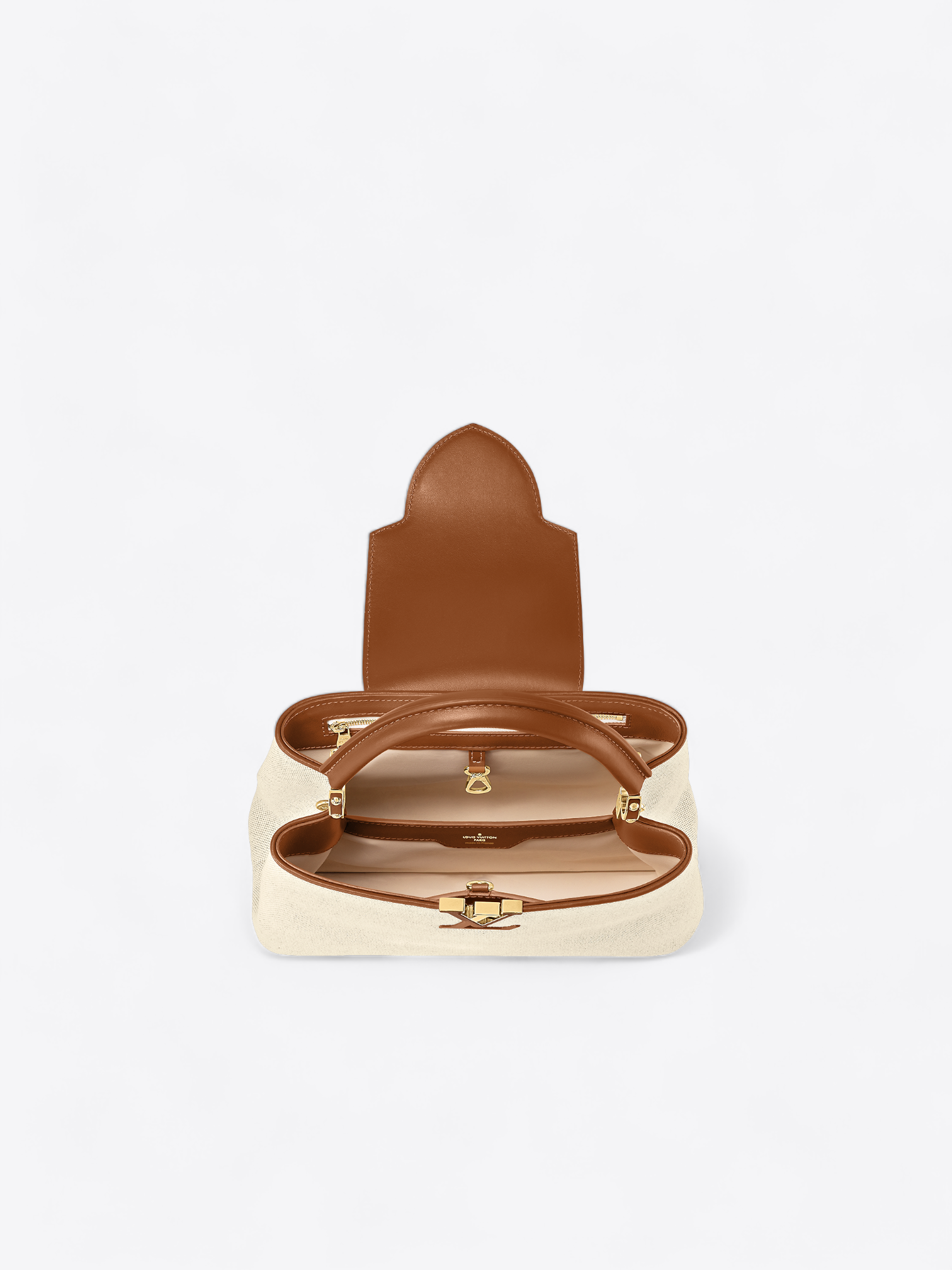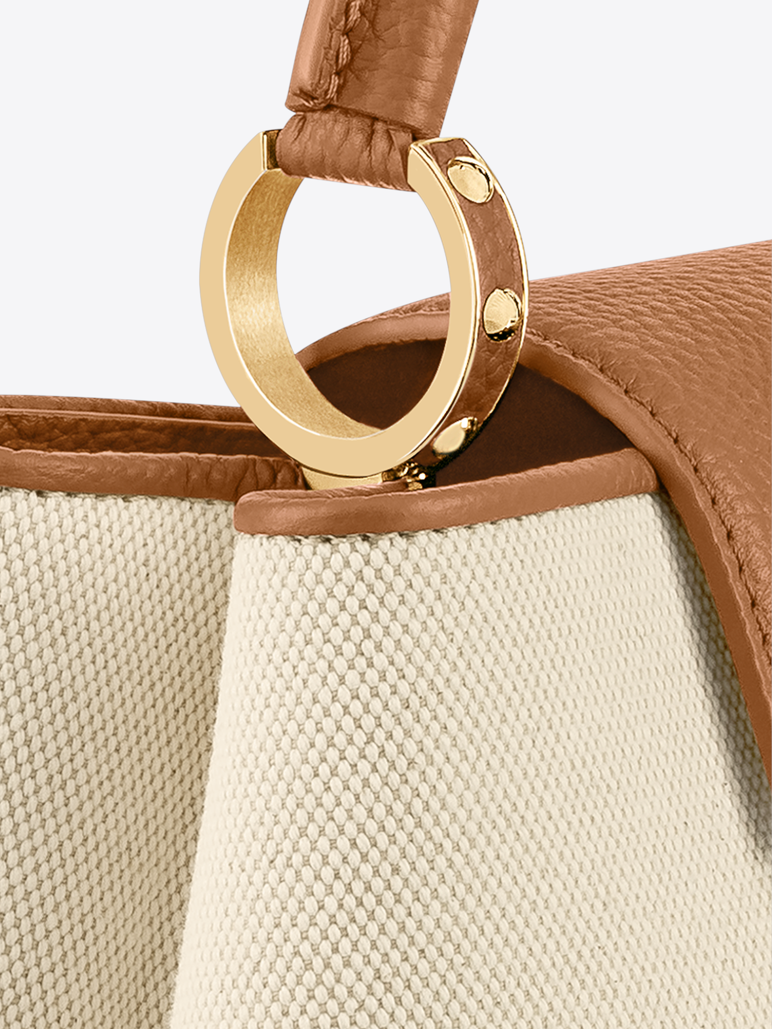 Mit ihren großzügigen Abmessungen von 31 x 20 x 10 cm bietet die Capucines MM ausreichend Platz, um die täglichen Essentials mit unvergleichlicher Anmut zu beherbergen. Das natürliche Canvas, von schlichter Eleganz, wird wunderschön durch das Taurillon Leder in Braun Caramel ergänzt, ein ikonisches Material des Hauses Louis Vuitton, bekannt für seine Weichheit beim Berühren und seine Langlebigkeit.