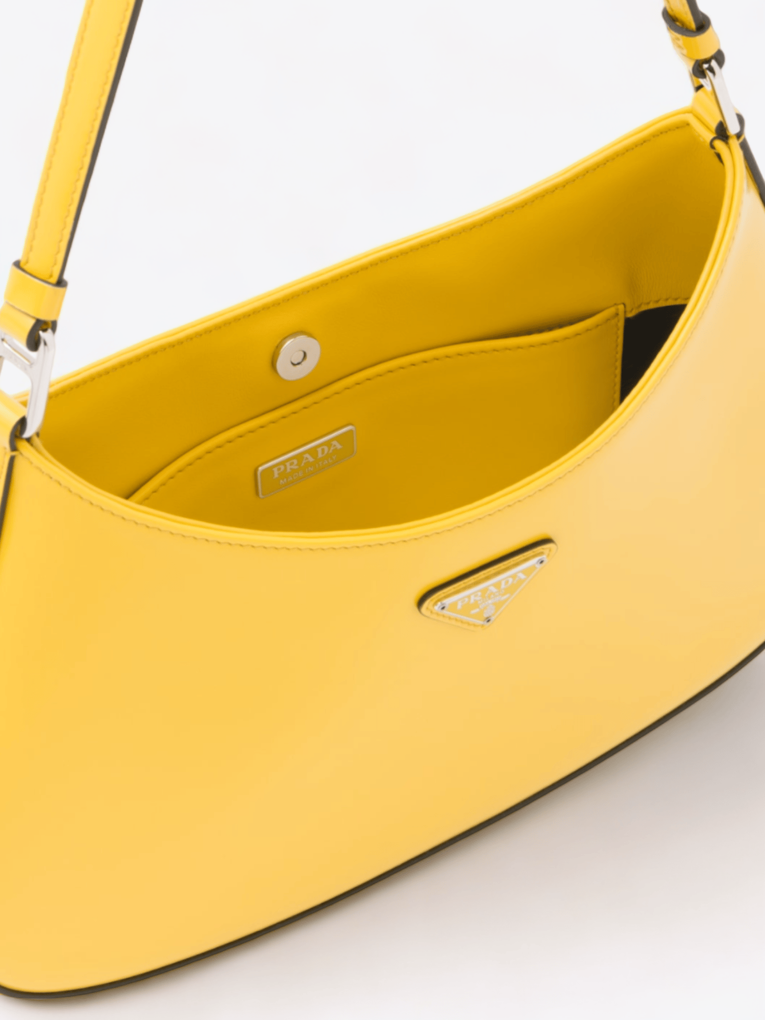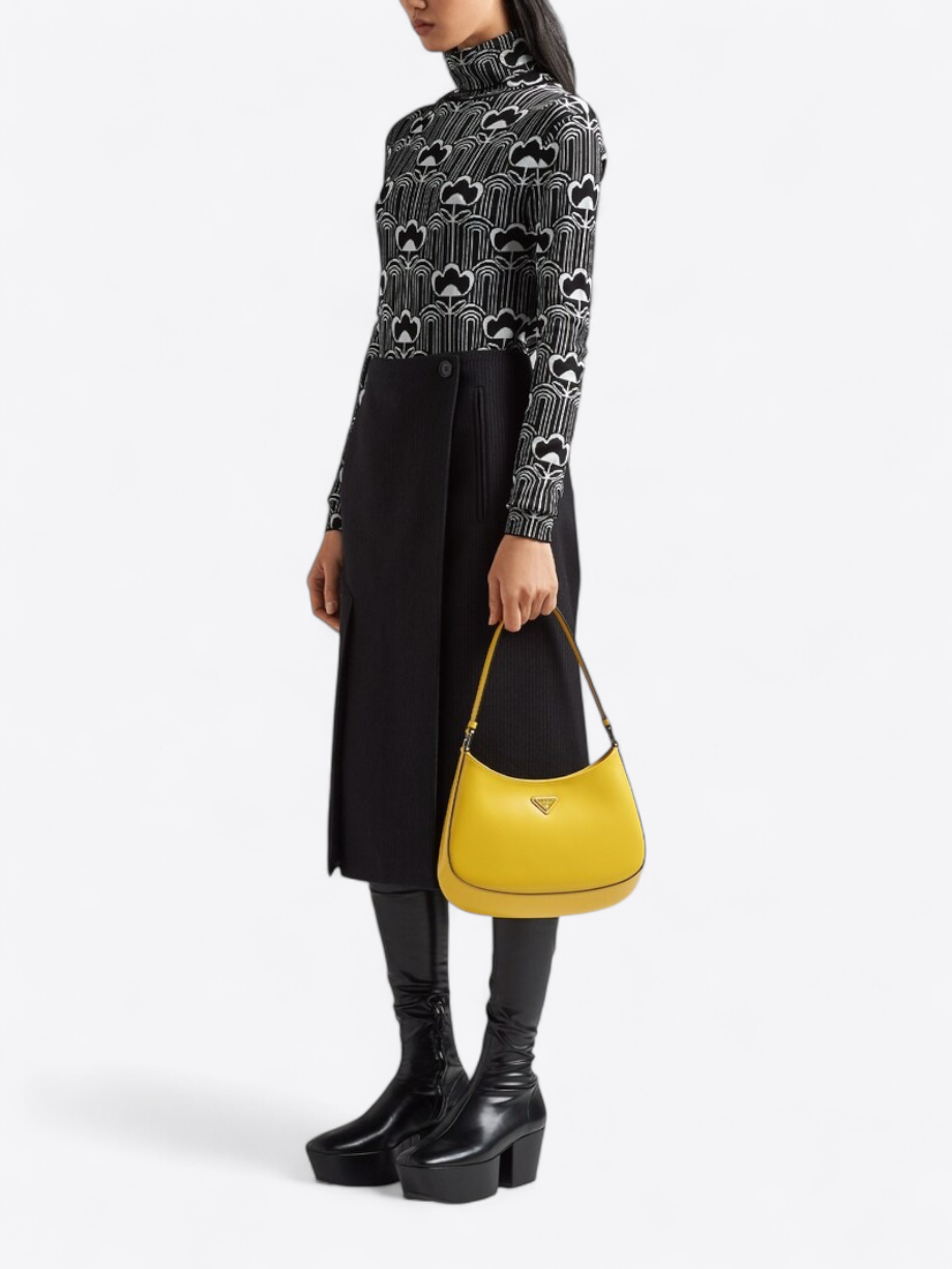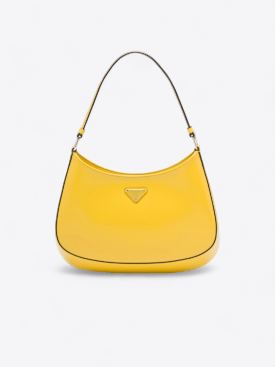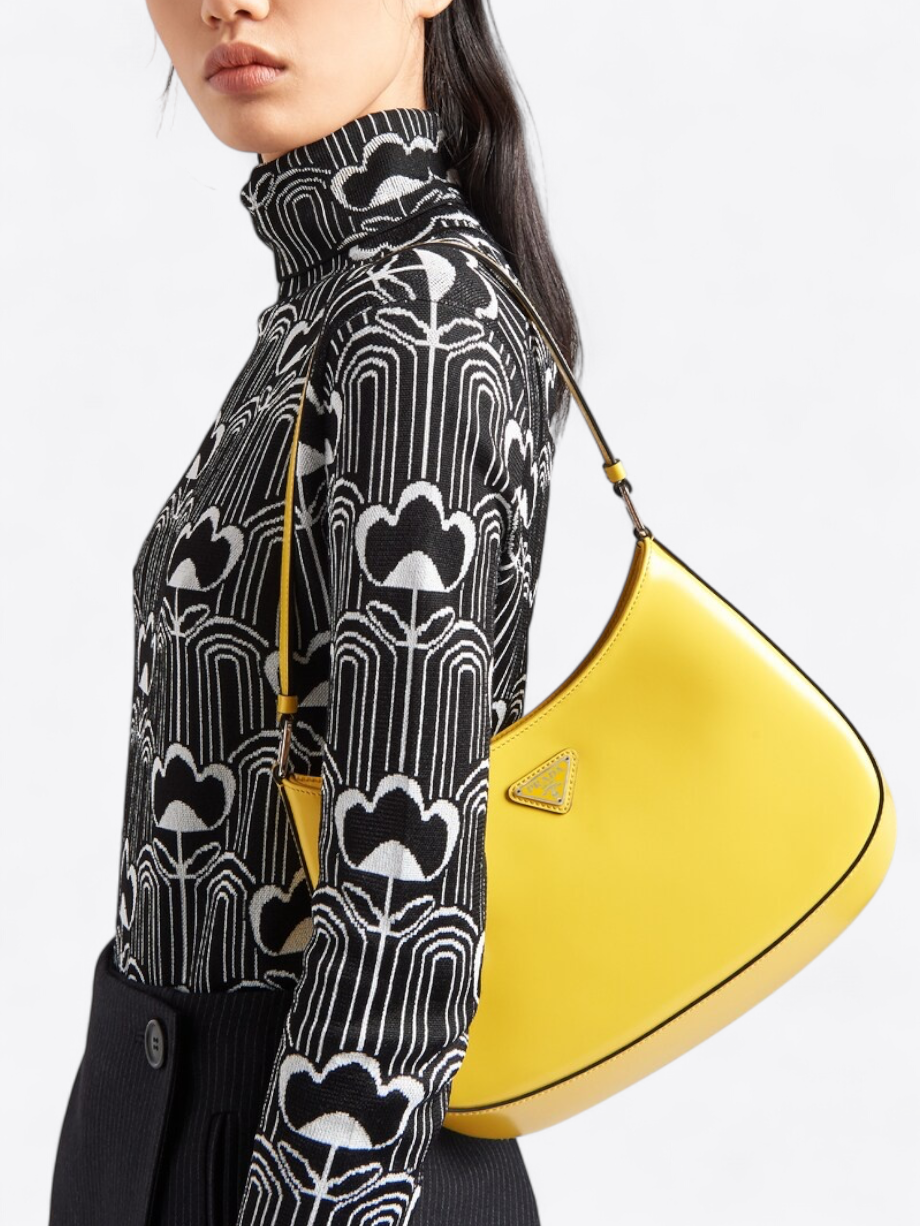Die Prada Cleo Tasche mit ihrem raffinierten Look ist eine Neuinterpretation eines ikonischen Modells der Marke aus den 1990er Jahren. Sie hat elegante, geschwungene Linien, die durch die abgerundete Konstruktion am Boden und an den Seiten hervorgehoben werden und dieser Hobo-Tasche ein weiches, leichtes Aussehen verleihen. Hergestellt aus gebürstetem Leder, einem modernen und vielseitigen Material, das häufig in den Prada-Kollektionen zu finden ist, bietet sie die Möglichkeit, neue kontrastreiche Kombinationen zu kreieren. Darüber hinaus ist sie mit dem dreieckigen Emaille-Logo verziert, das ihr einen unverwechselbaren Touch verleiht.