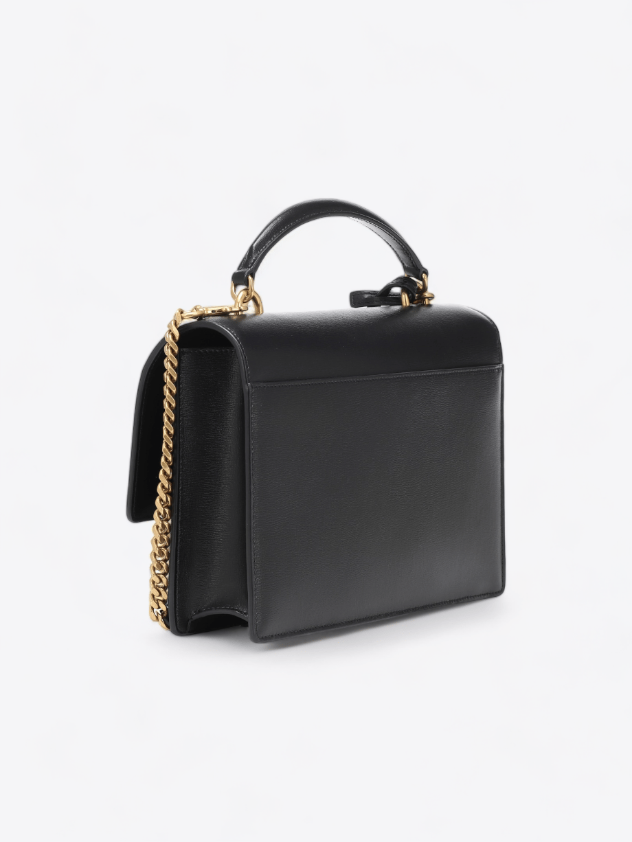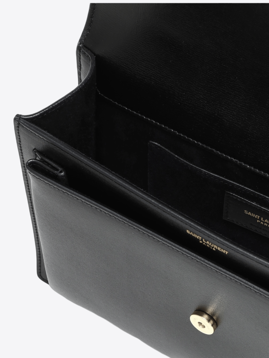 Die Sunset Monogram Medium Tasche von Saint Laurent ist ein wahres Juwel der Luxuslederwaren. Ihre elegante Silhouette aus glattem schwarzem Leder strahlt zeitlose Raffinesse aus, ergänzt durch die goldenen Initialen des renommierten Modehauses. Mit praktischen Abmessungen von 17 cm Höhe, 24 cm Breite und 5 cm Tiefe passt diese Tasche perfekt zu all Ihren täglichen Bedürfnissen und bleibt gleichzeitig ausreichend schick für einen eleganten Abend.