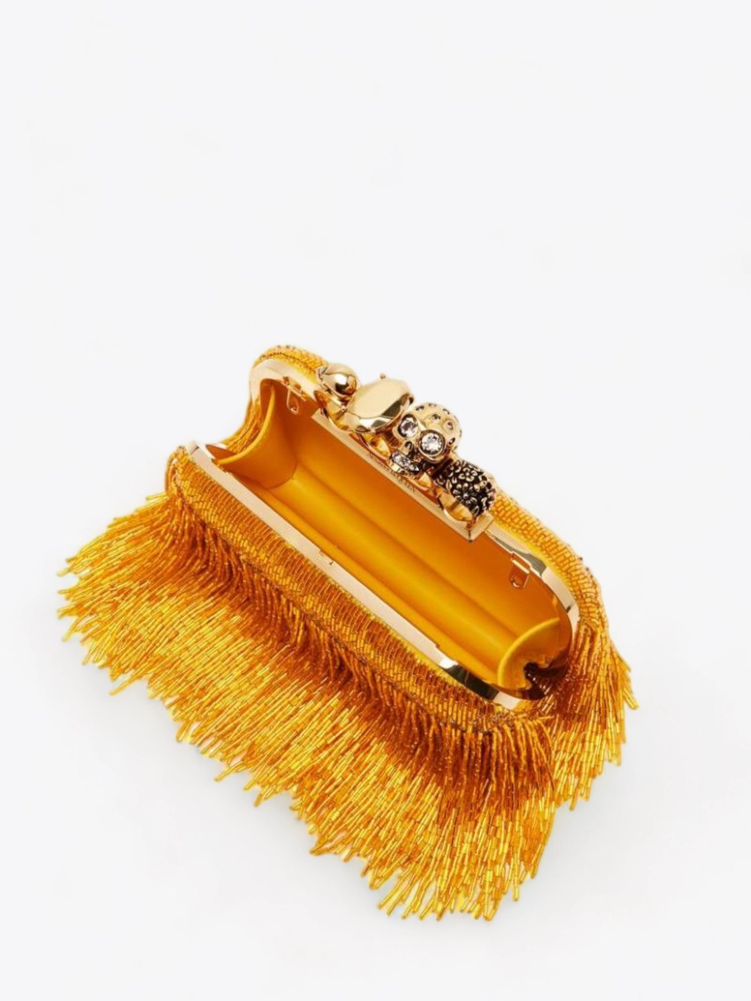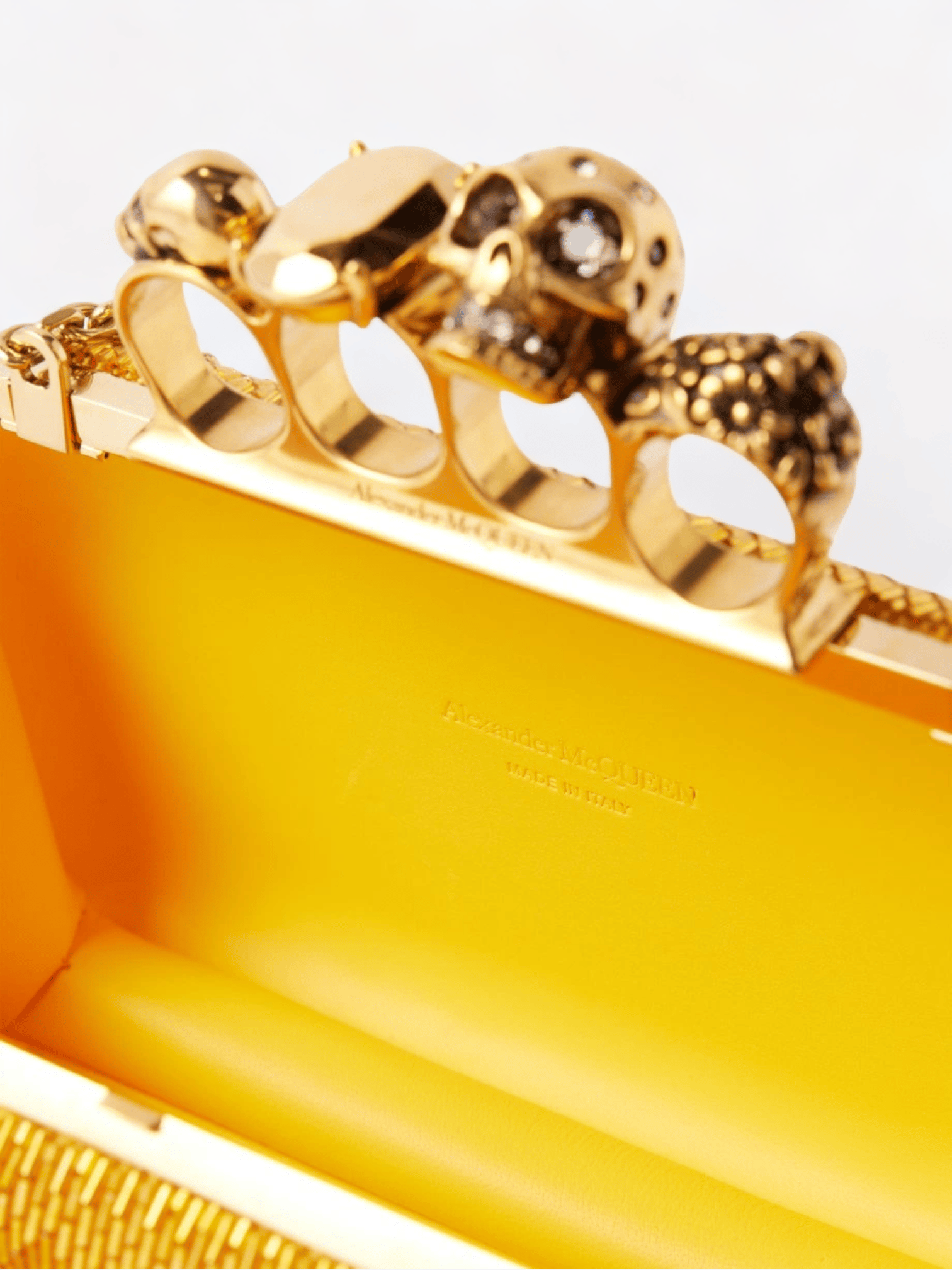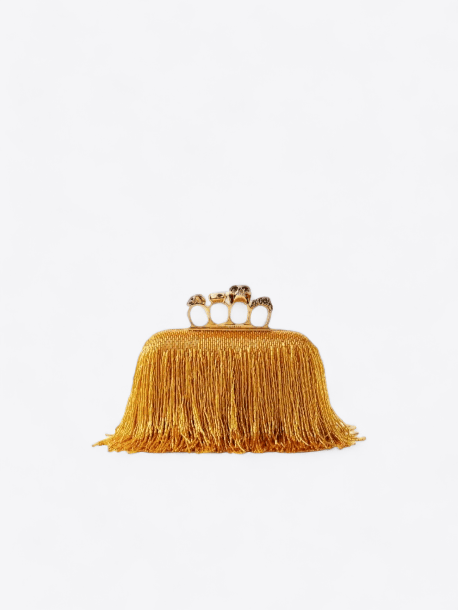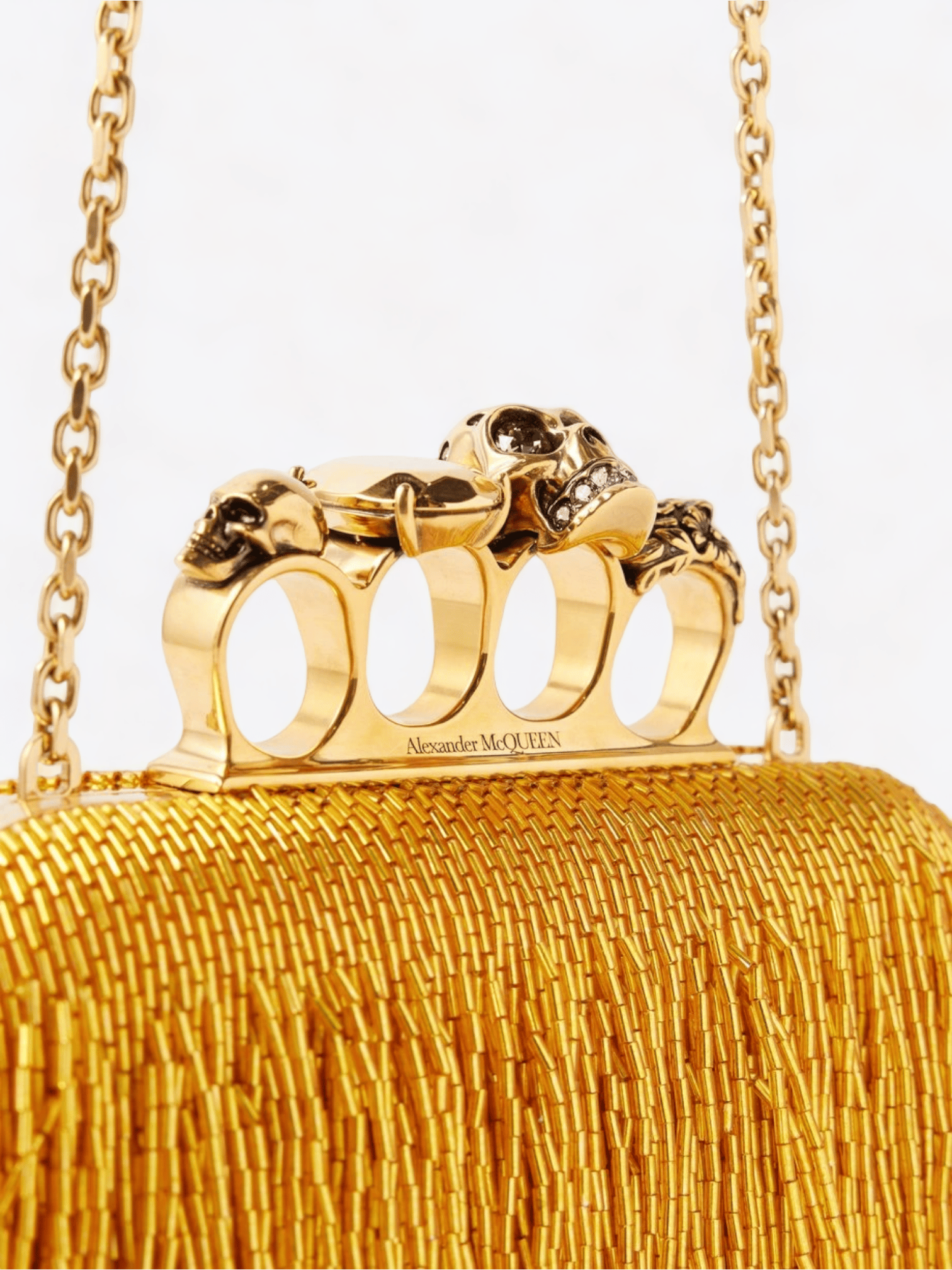 Präsentieren Sie sich mit unwiderstehlicher Kühnheit bei Ihren prestigeträchtigsten Veranstaltungen, indem Sie zur Skull Four Ring Clutch von Alexander McQueen greifen, einem atemberaubenden Stück, das den modernen Glamour neu definiert. Diese wunderschön gestaltete Clutch verkörpert Luxus mit ihrem makellos verarbeiteten Gehäuse aus goldfarbenem Messing, das einen reichen Glanz bietet, der das Licht und alle Blicke einfängt. Die strukturierte Oberfläche der Tasche wird durch goldene Perlenfransen verstärkt, die bei jeder Bewegung tanzen und funkeln, und so eine faszinierende Texturdynamik und eine fesselnde Eleganz verleihen.