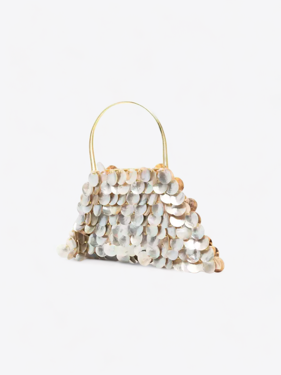 De Celeste tas van Vanina, beschikbaar om te huren op welPop, is een stuk haute couture dat elegantie en originaliteit belichaamt. Zijn ongewone silhouet, dat de zachtheid van golven oproept, wordt prachtig geaccentueerd door een overvloed aan ronde parelmoeren schelpen. Deze schelpen, met de precisie van een edelsmid gerangschikt, bieden een rijke textuur en een betoverende glans, die doen denken aan het glinsteren van water onder de zonnestralen.