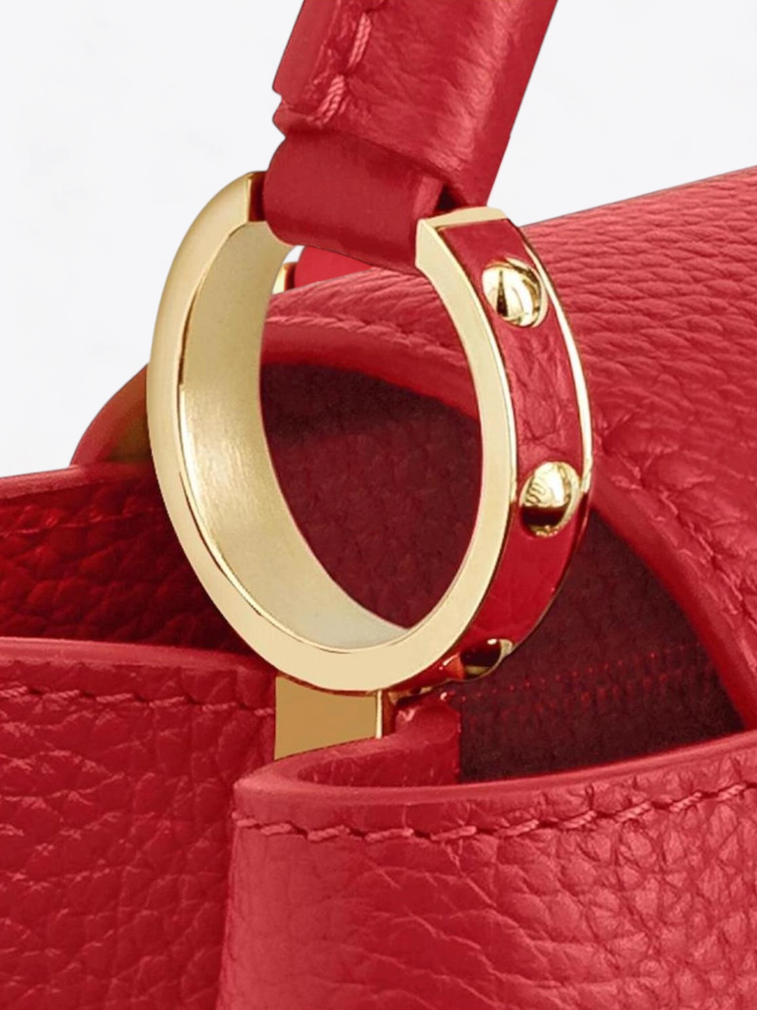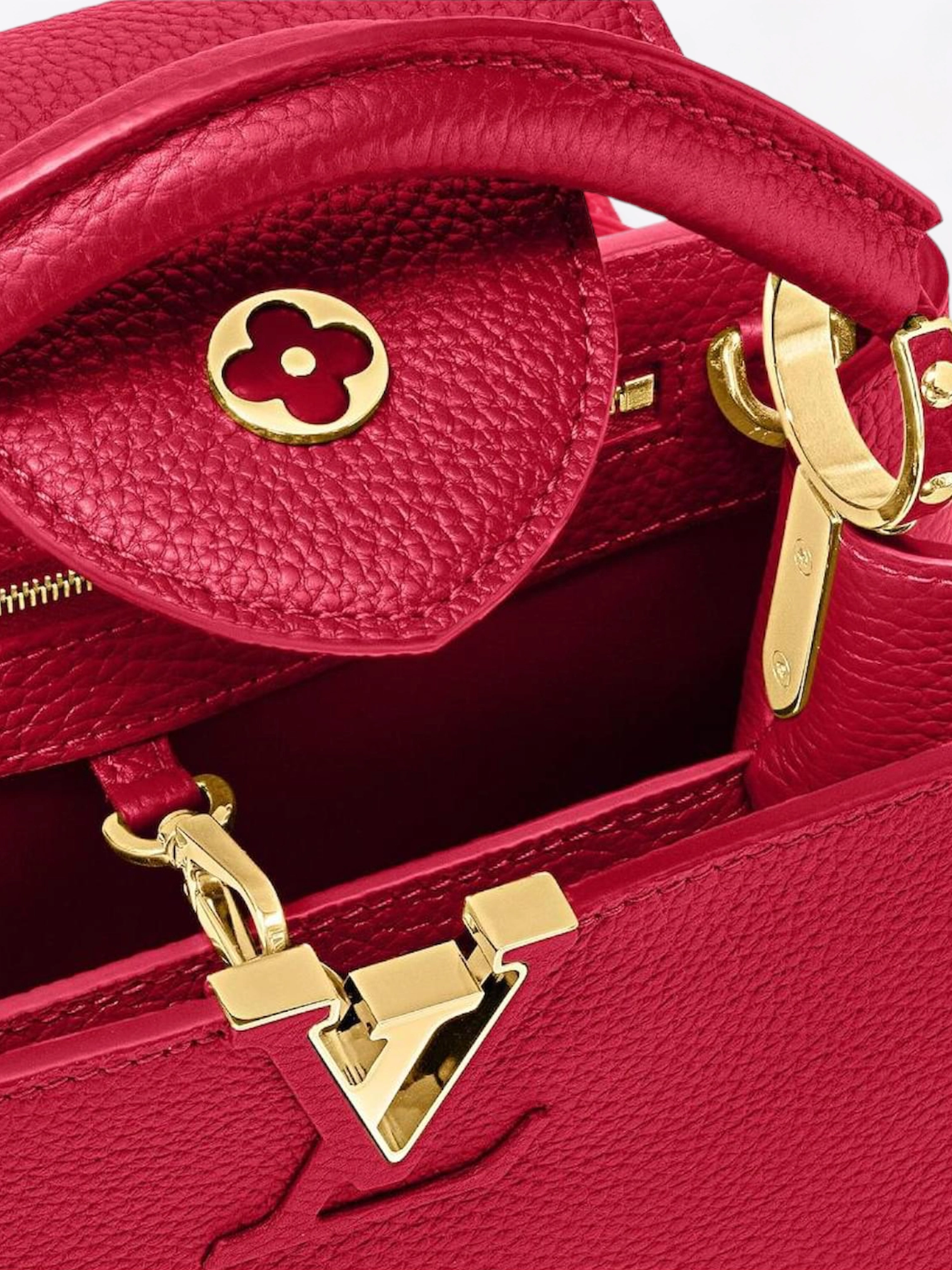 De Louis Vuitton is de Capucines BB-tas een lederwarenitem dat luxe en elegantie op de Franse manier belichaamt. Met zorg vervaardigd uit Taurillon-grain leer, onderscheidt deze tas zich door zijn rijke en weelderige textuur die uitnodigt tot aanraken. Zijn dieprode kleur is een ware uitbarsting van verfijning, in staat om elke outfit te verheffen met een vleugje passie en durf.
