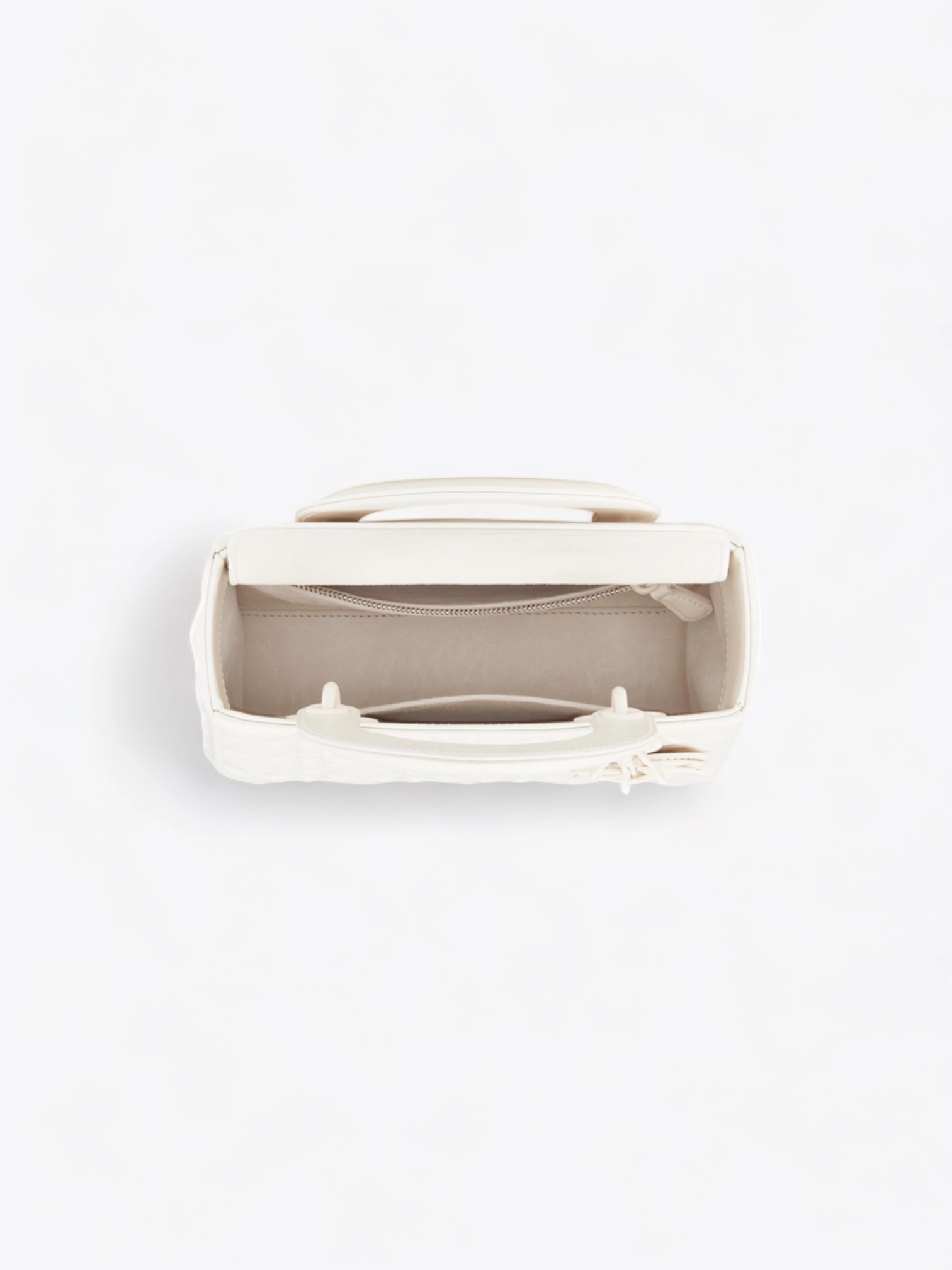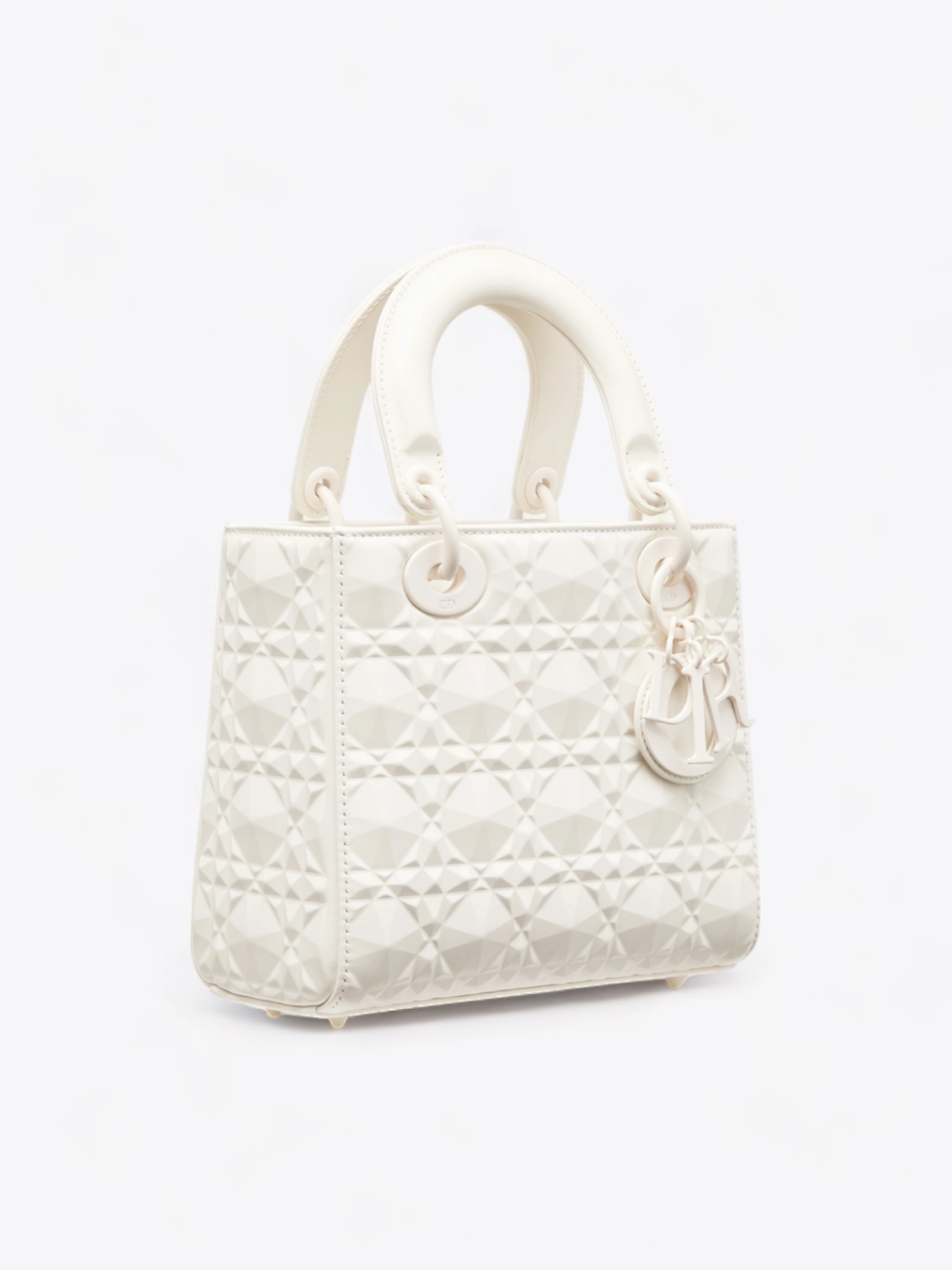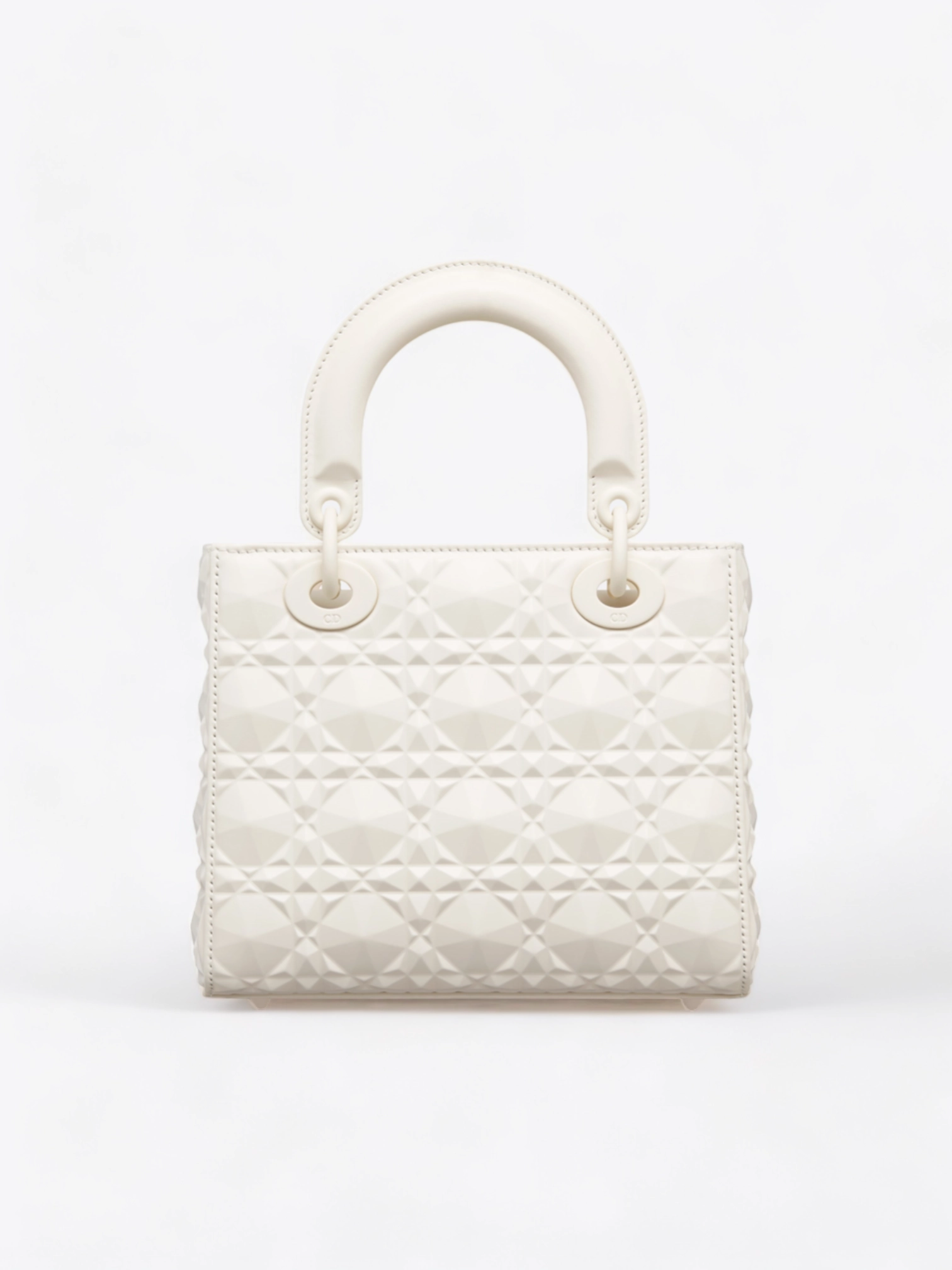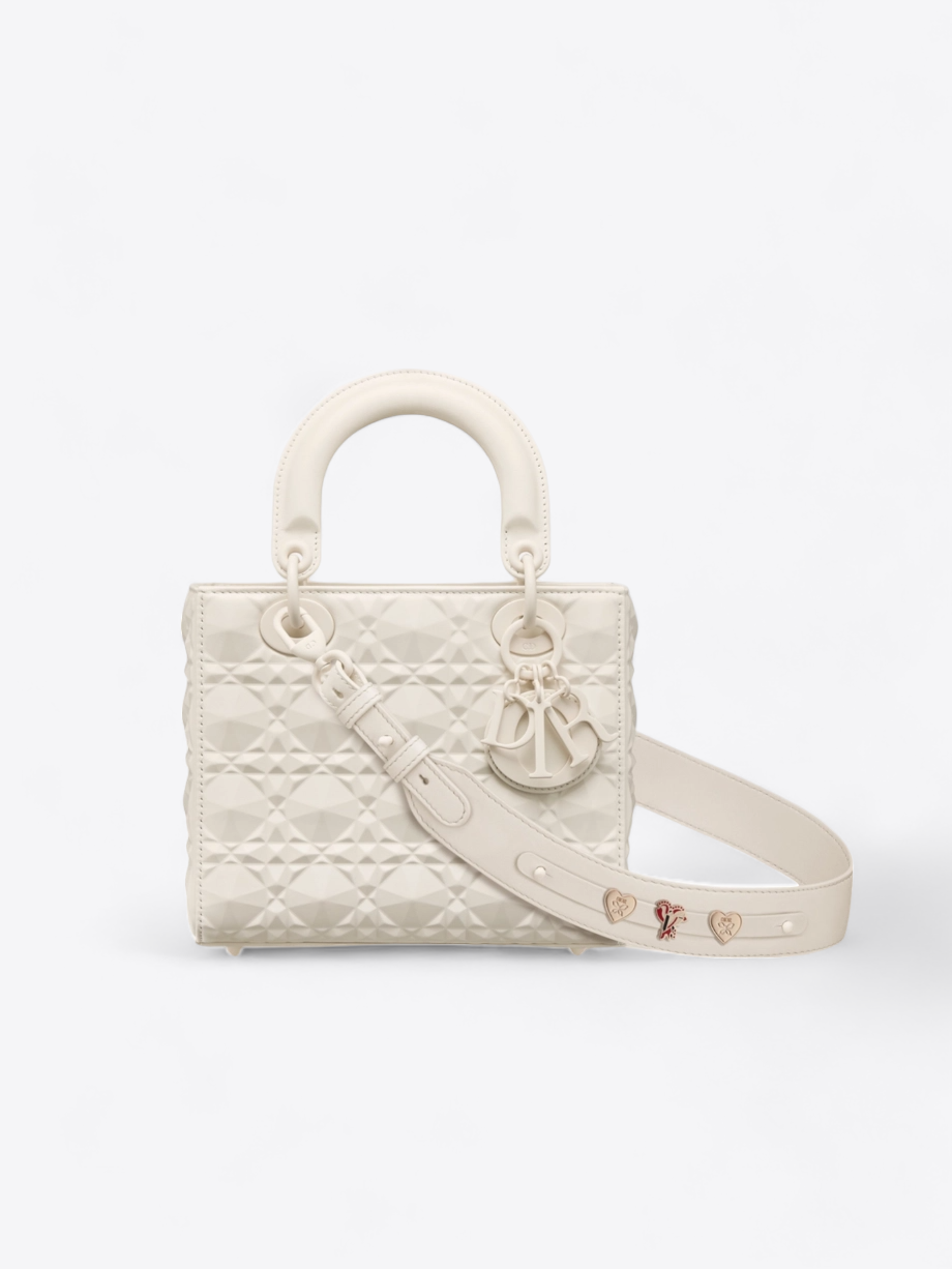 De D.I.O.R. bedeltjes, gemaakt van ton-sur-ton metaal, hangen subtiel aan een van de handvatten en voegen een vleugje verfijning toe en een knipoog naar het erfgoed van het merk. Deze metalen details zijn zowel subtiel als fascinerend, en weerkaatsen het licht met subtiele elegantie.