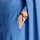 Het glanzende leer vangt het licht als een zomerse zee, terwijl gouden accenten herinneren aan de barokke pracht van Gianni. Versace toont hier een mediterrane chic, vrij, sensueel en tijdloos.