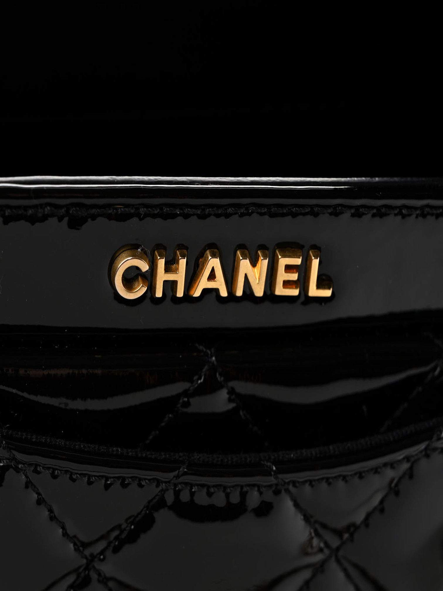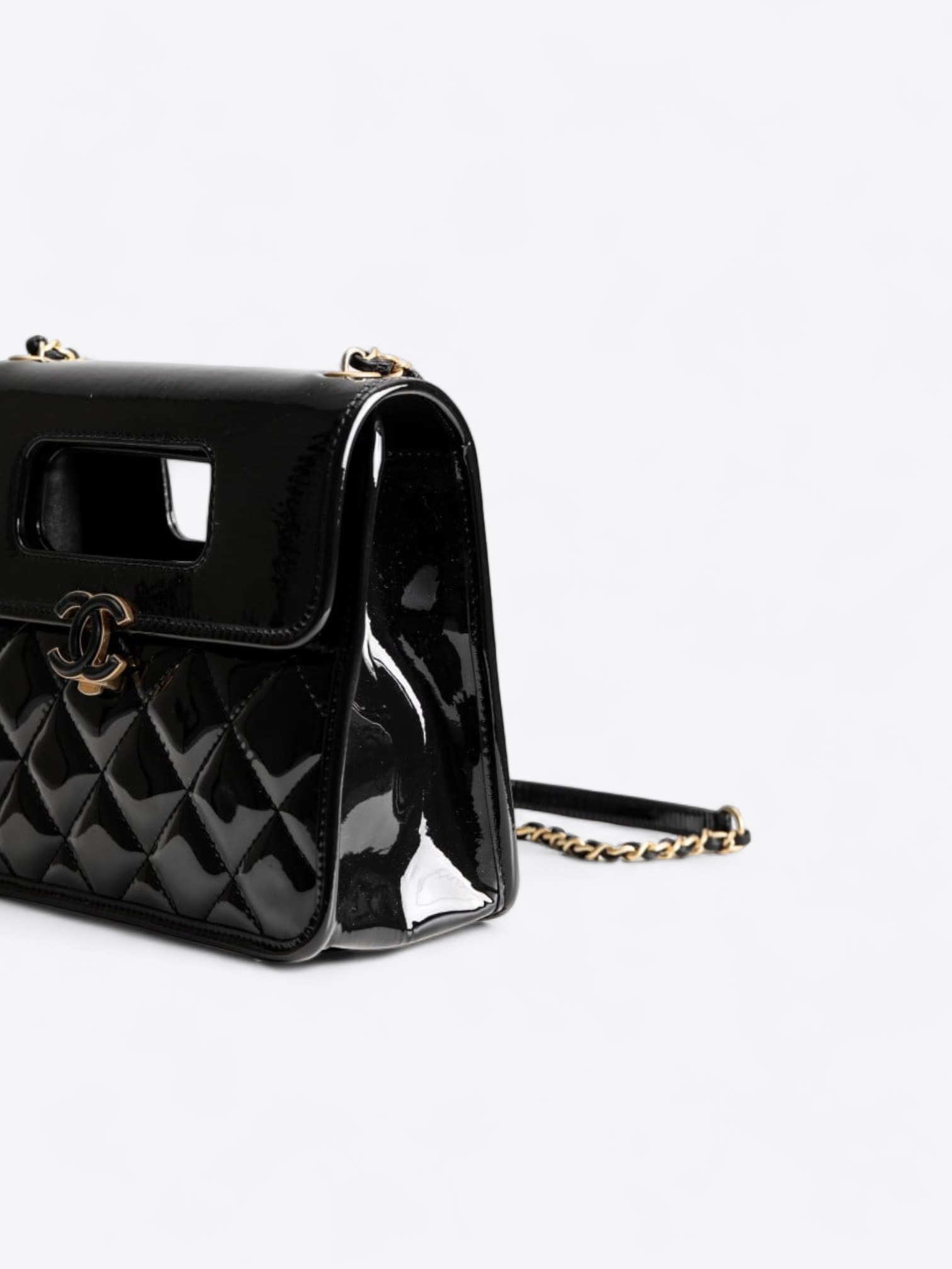 Ce bijou de maroquinerie, issu d’une collection récente de la Maison Chanel, incarne l’alliance parfaite entre l’héritage intemporel de la marque et un design résolument moderne. Le sac est confectionné en cuir verni noir, d’une brillance éclatante, qui lui confère une allure résolument chic et urbaine. Sa silhouette structurée, sublimée par le matelassage emblématique de Chanel, est twistée par une poignée supérieure originale et une ouverture centrale audacieuse qui laisse entrevoir l’intérieur doublé en cuir. Le logo CC iconique en métal doré vient sceller l’élégance de ce modèle.