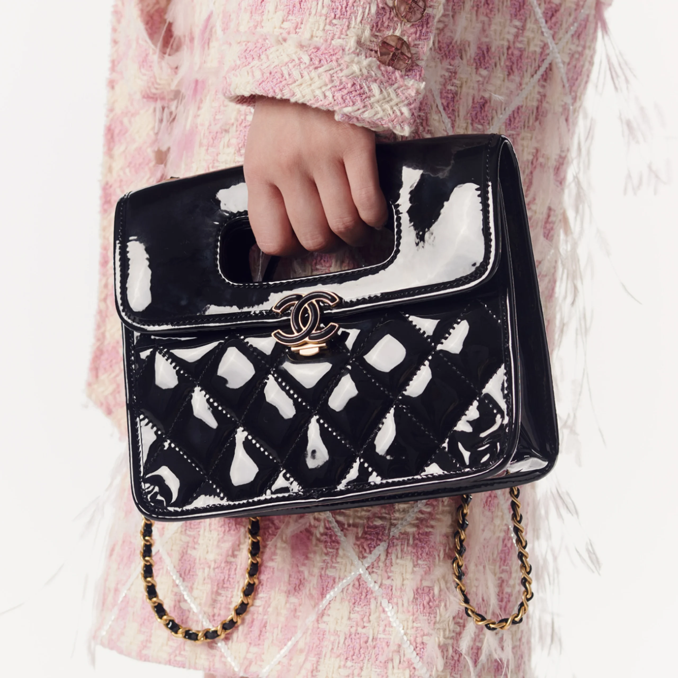- Pour une soirée chic : associez ce sac Chanel à une petite robe noire, un tailleur pantalon smoking ou une jupe midi plissée. Ajoutez des escarpins vertigineux, des bijoux dorés minimalistes et une touche de rouge à lèvres vif pour un look glamour et sophistiqué. L’éclat du cuir verni se mariera à merveille avec la sobriété de votre tenue,créant un contraste subtil et raffiné.
