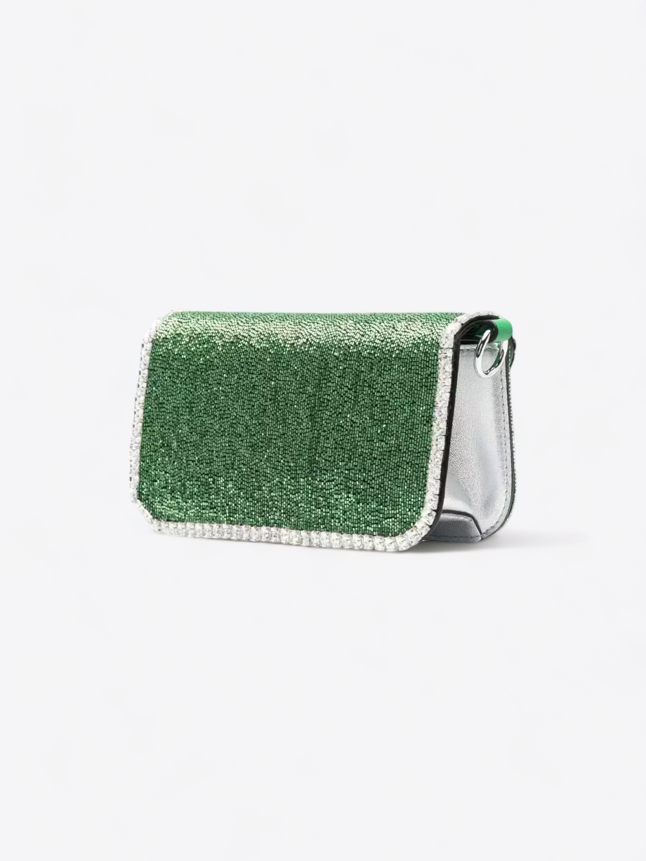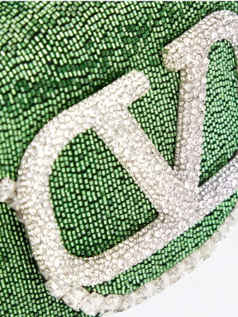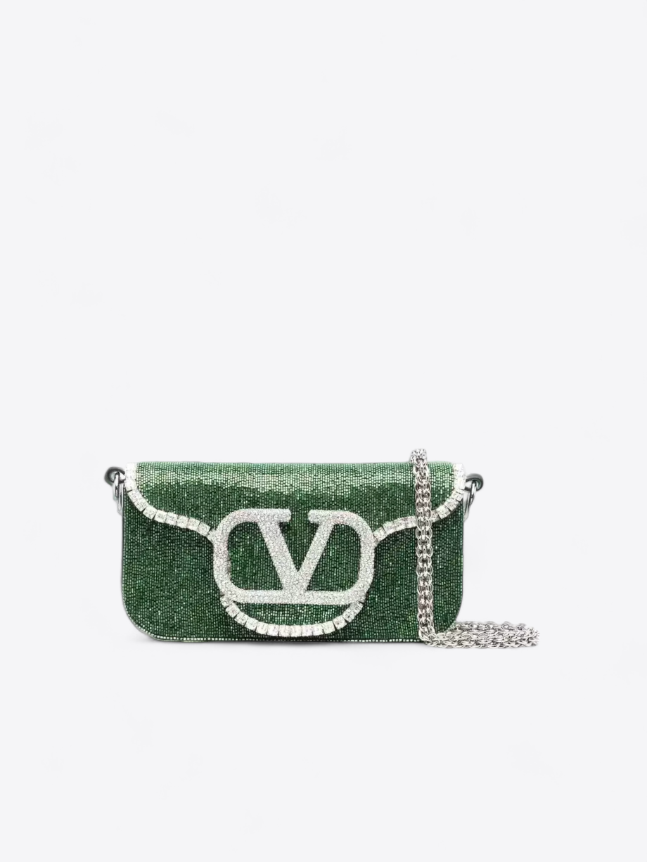 Plongez dans l’univers du luxe avec le sac Locò Small de Valentino Garavani, une création qui incarne l’élégance et le raffinement. Confectionné avec un savoir-faire artisanal inégalé, ce bijou de maroquinerie se pare d’un cuir vert émeraude d’une profondeur envoûtante. Sa texture lisse et soyeuse invite au toucher, tandis que la surface scintille sous l’effet des perles de verre et des cristaux carrés qui l’habillent, reflétant la lumière avec une grâce hypnotisante.