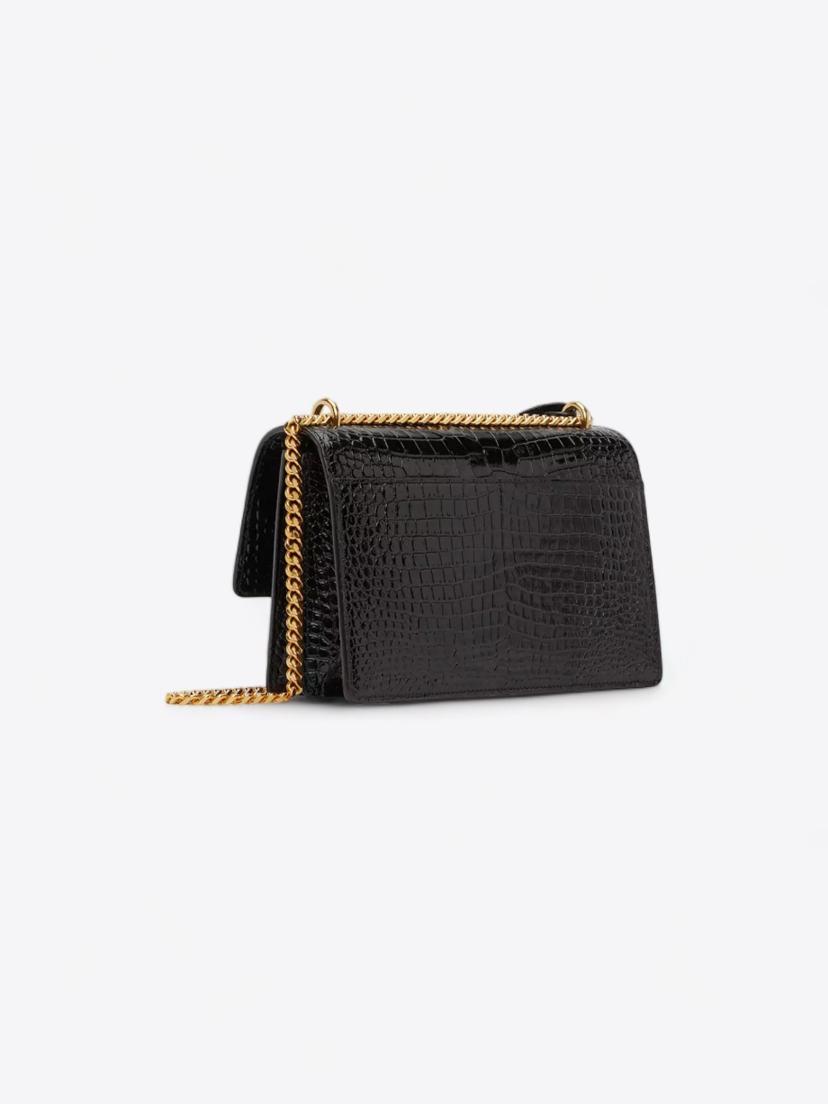 Découvrez l’élégance intemporelle avec le sac Saint Laurent Sunset, une pièce maîtresse de notre collection de location de luxe. Ce sac à main emblématique, confectionné avec un savoir-faire inégalé, est l’incarnation du luxe discret et de la sophistication. Son cuir de veau noir, méticuleusement sélectionné, est embossé d’un motif crocodile qui lui confère une texture riche et une allure distinguée.